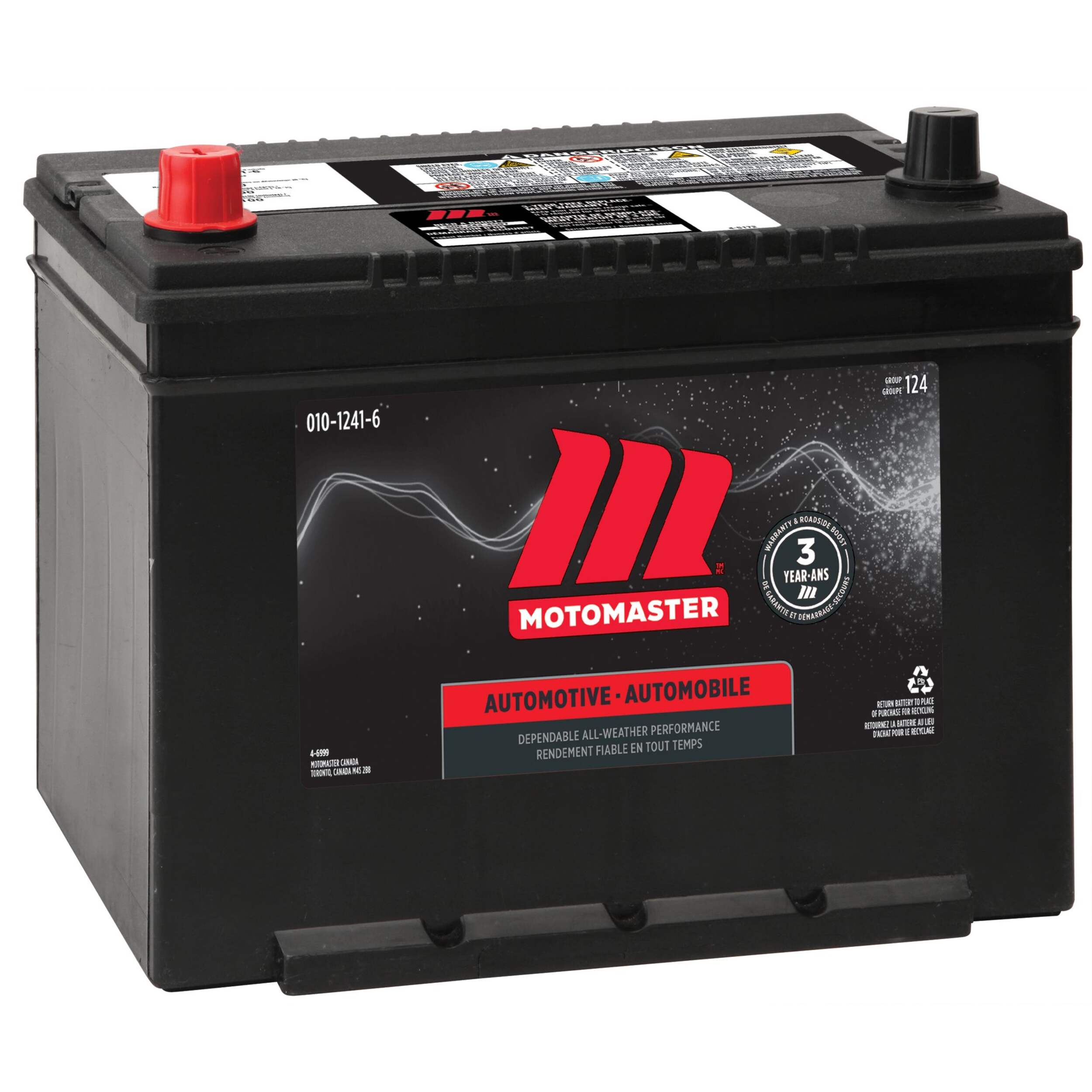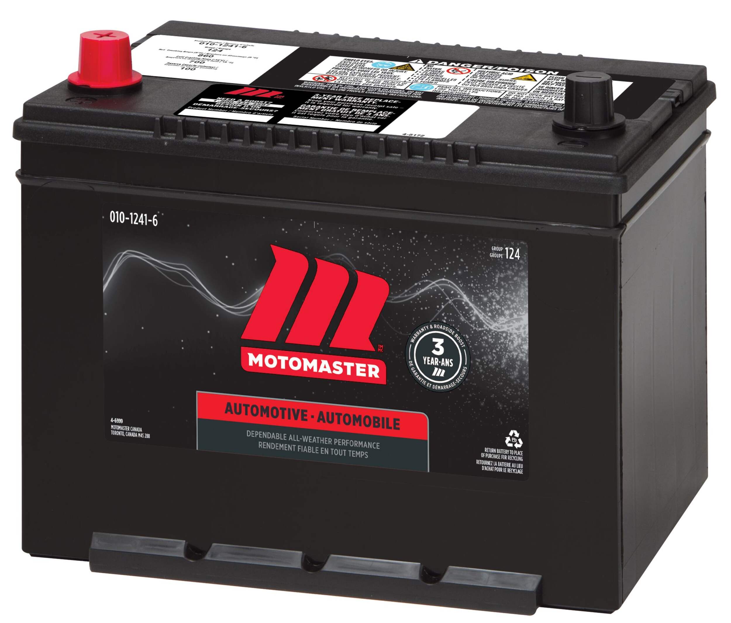 La batterie MotoMaster groupe 124 est une batterie automobile conçue pour être fiable et performante. Cette batterie de remplacement standard est conforme ou supérieure aux spécifications de l'équipement d'origine Cold Crank Amp et elle comporte des plaques à cadre intégral et des bornes de service intense, des sangles et des soudures renforcées pour atténuer les dommages causés par les vibrations et optimiser le transfert de courant. Cette batterie de 12 V a un filetage positif à gauche, ne nécessite pas d'entretien et offre une capacité de réserve de 100 minutes à 25 A. Ses dimensions sont de 10-1/4 po x 6-7/8 po x 8-3/8 po. Une fois remplacée, la batterie au plomb doit être retournée à Canadian Tire pour être recyclée.