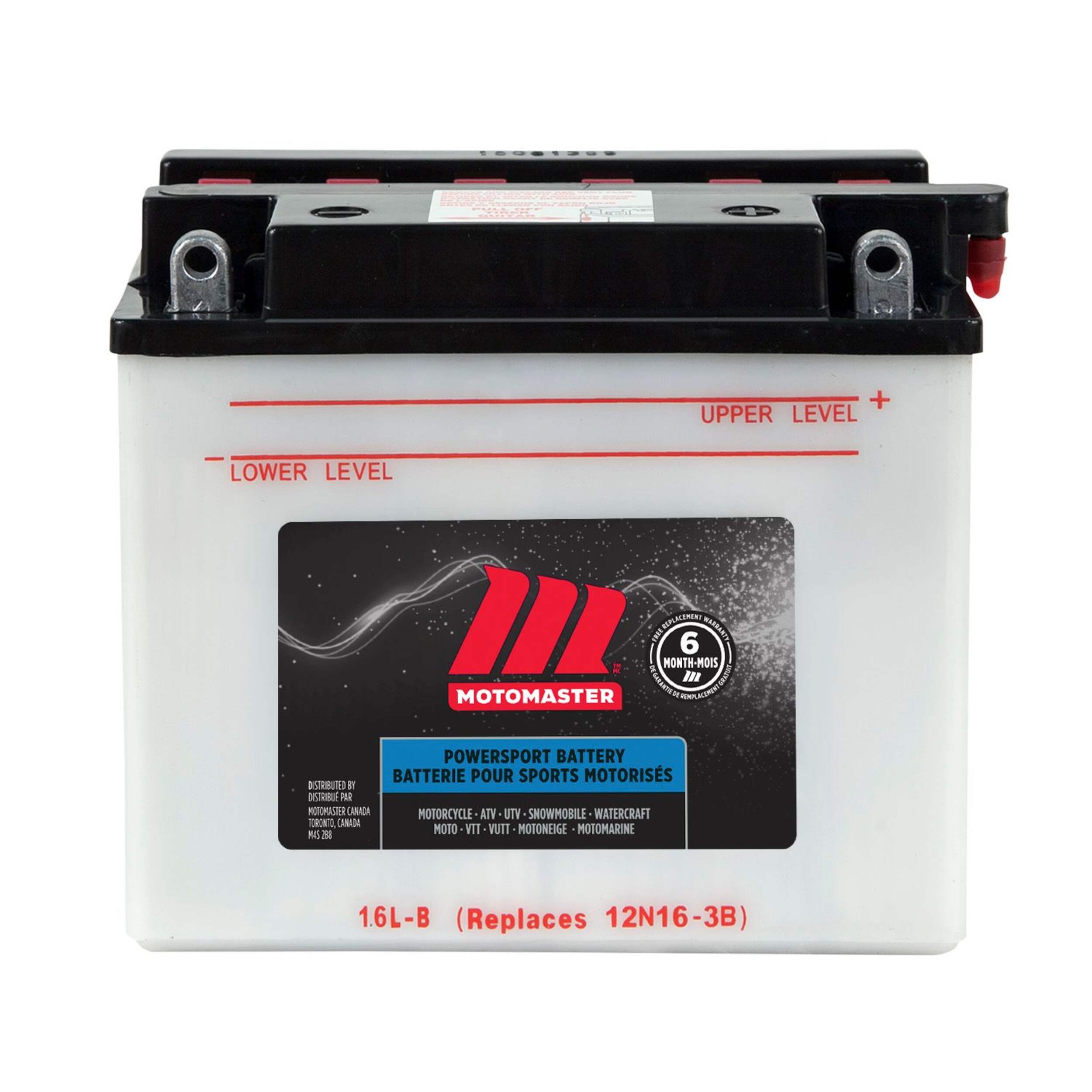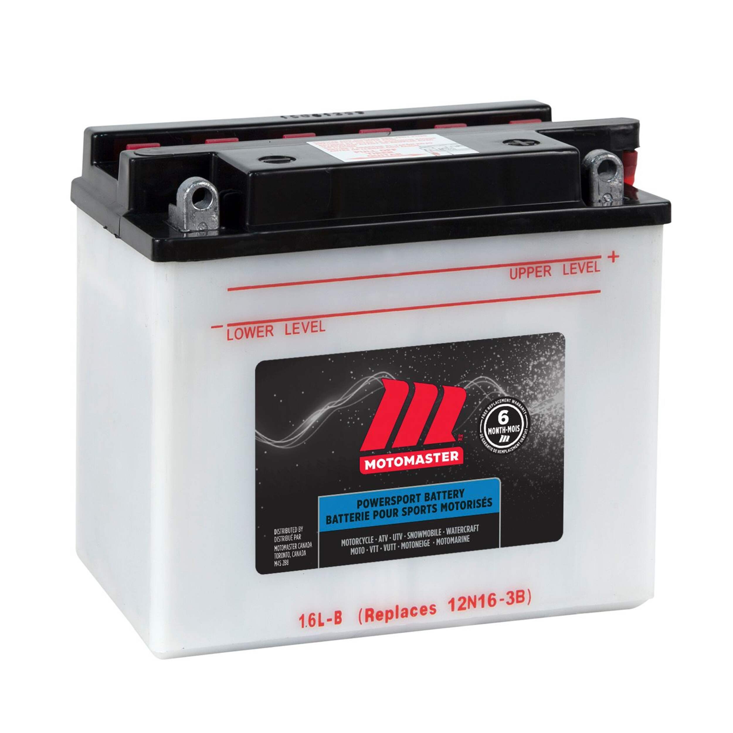 La batterie pour véhicule de sport motorisé MOTOMASTER offre une puissance de démarrage élevée et une longue durée de vie pour les motos, les VTT, les UTV, les motoneiges et les motomarines. Sa puissante capacité de 19 Ah permet des démarrages fiables, même par temps froid, et il est conçu pour nécessiter peu d'entretien et durer longtemps. Cette batterie automobile 12 V de MotoMaster est conçue pour les exigences sévères des véhicules de sport motorisé, et est construite pour durer longtemps. Garantie de 6 mois comprise.