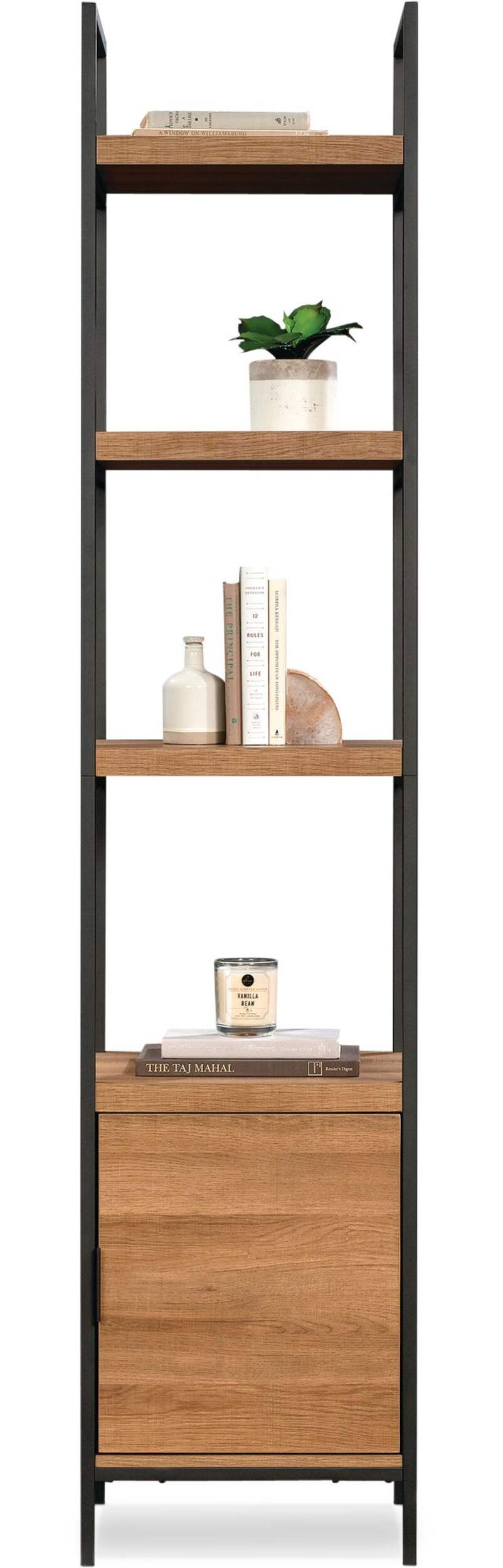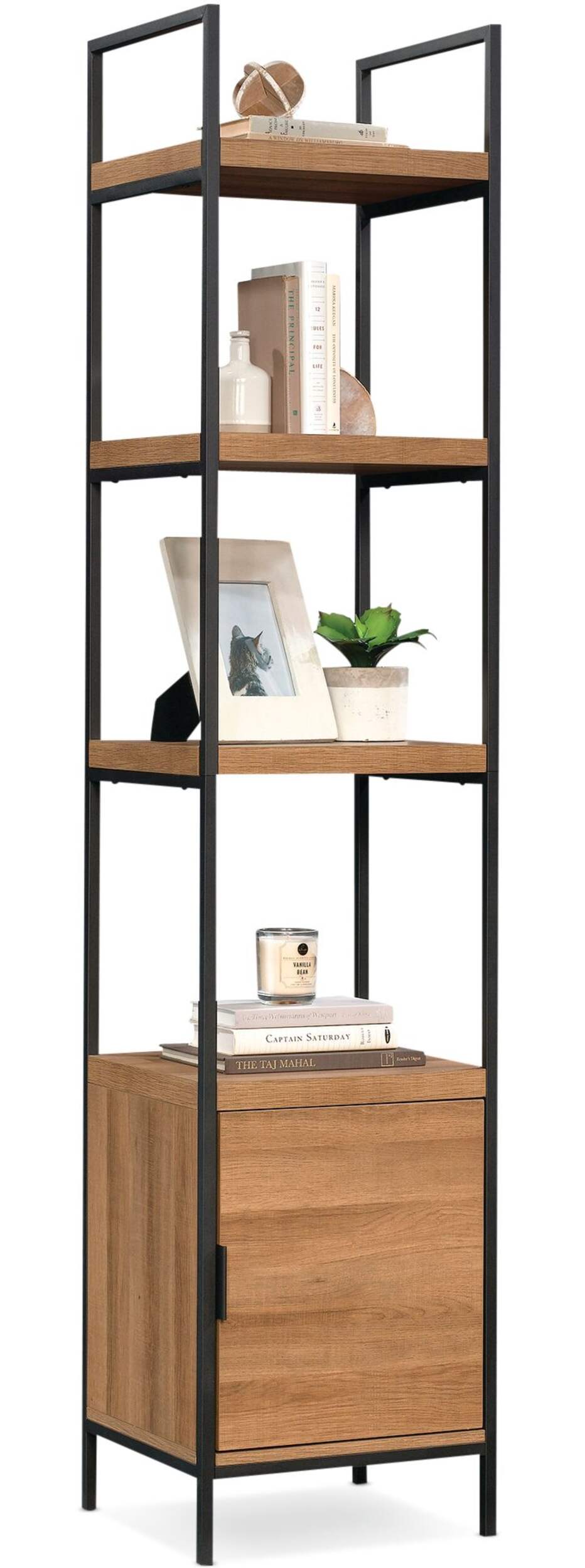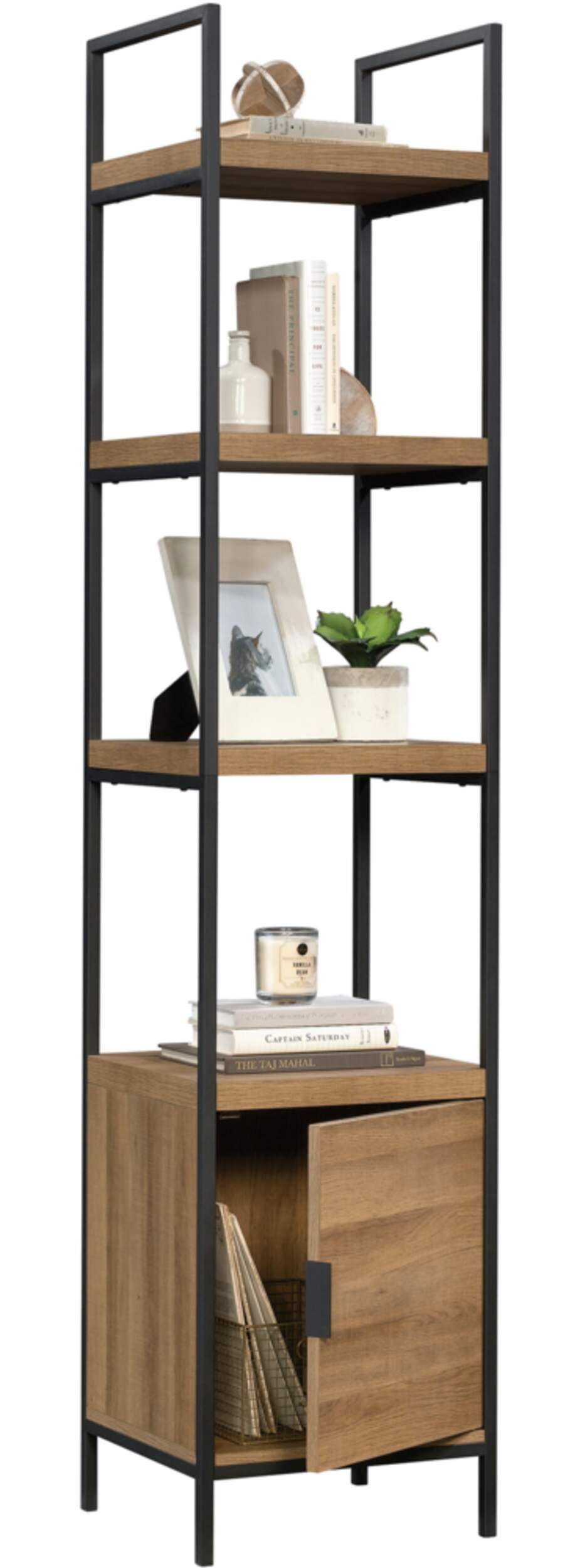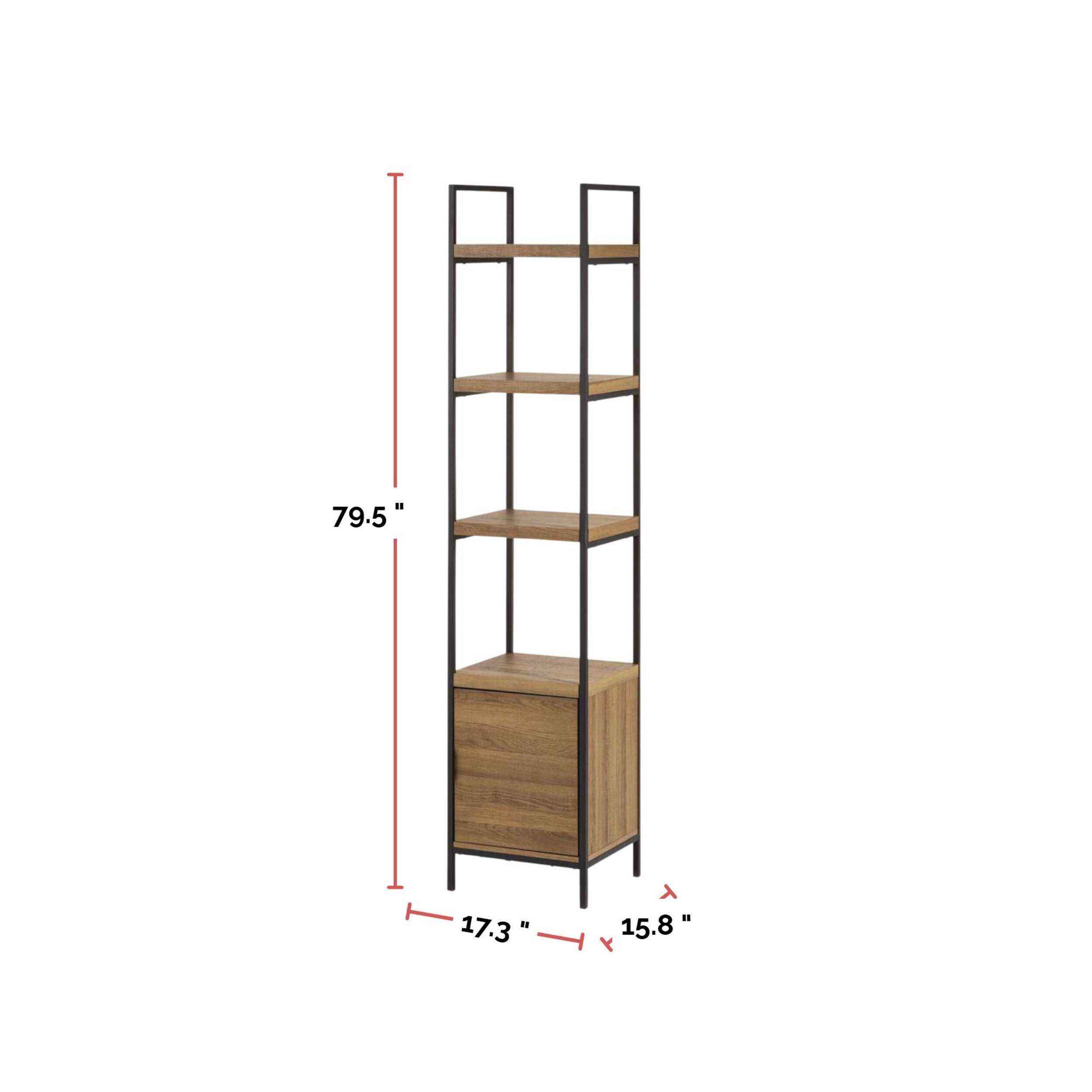 La bibliothèque étroite à 4 niveaux CANVAS Robson est dotée d'un cadre en métal noir offrant une allure contemporaine qui permet d'exposer magnifiquement les livres et les oeuvres d'art décoratives dans les petits espaces. Pensée pour être durable, elle comprend un cadre en métal au fini peint par poudrage qui soutient les tablettes et l'armoire. La porte de rangement de l'armoire inférieure peut être installée d'un côté ou de l'autre pour un accès facile. Facile à assembler, la bibliothèque s'agence avec d'autres meubles de la collection Robson pour un style harmonieux dans n'importe quel espace de vie.