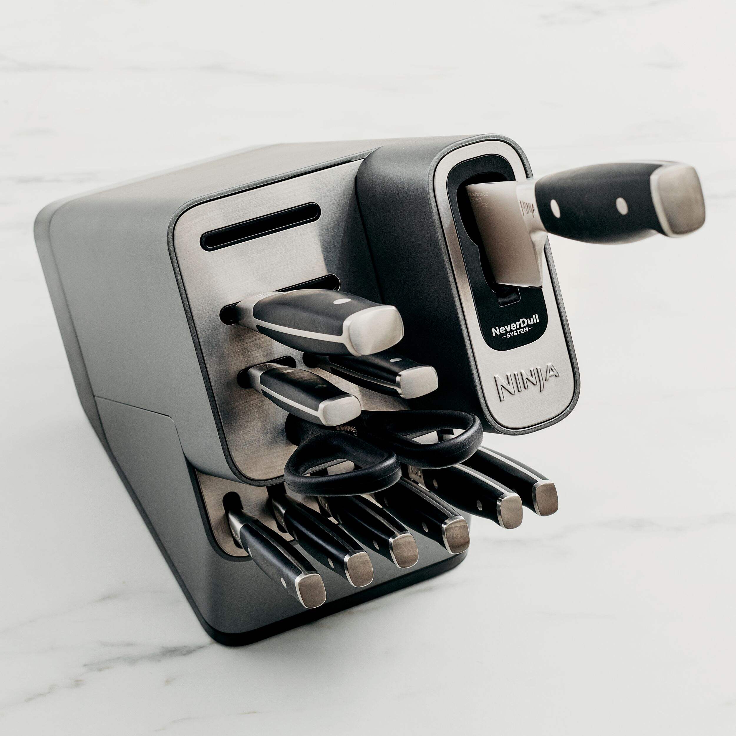 Voici le système de couteaux NinjaMC FoodiMC NeverDullMD de qualité supérieure, les couteaux de qualité supérieure qui restent affûtés pendant plus de 10 ans. Ensemble polyvalent comprenant des lames forgées en acier inoxydable allemand qui sont durables et parfaitement équilibrées pour plus de confort et de contrôle. Avec seulement quelques balayages de l'affûteur infaillible intégré, ce système tout-en-un maintient le tranchant supérieur que vous voulez utiliser chaque fois.