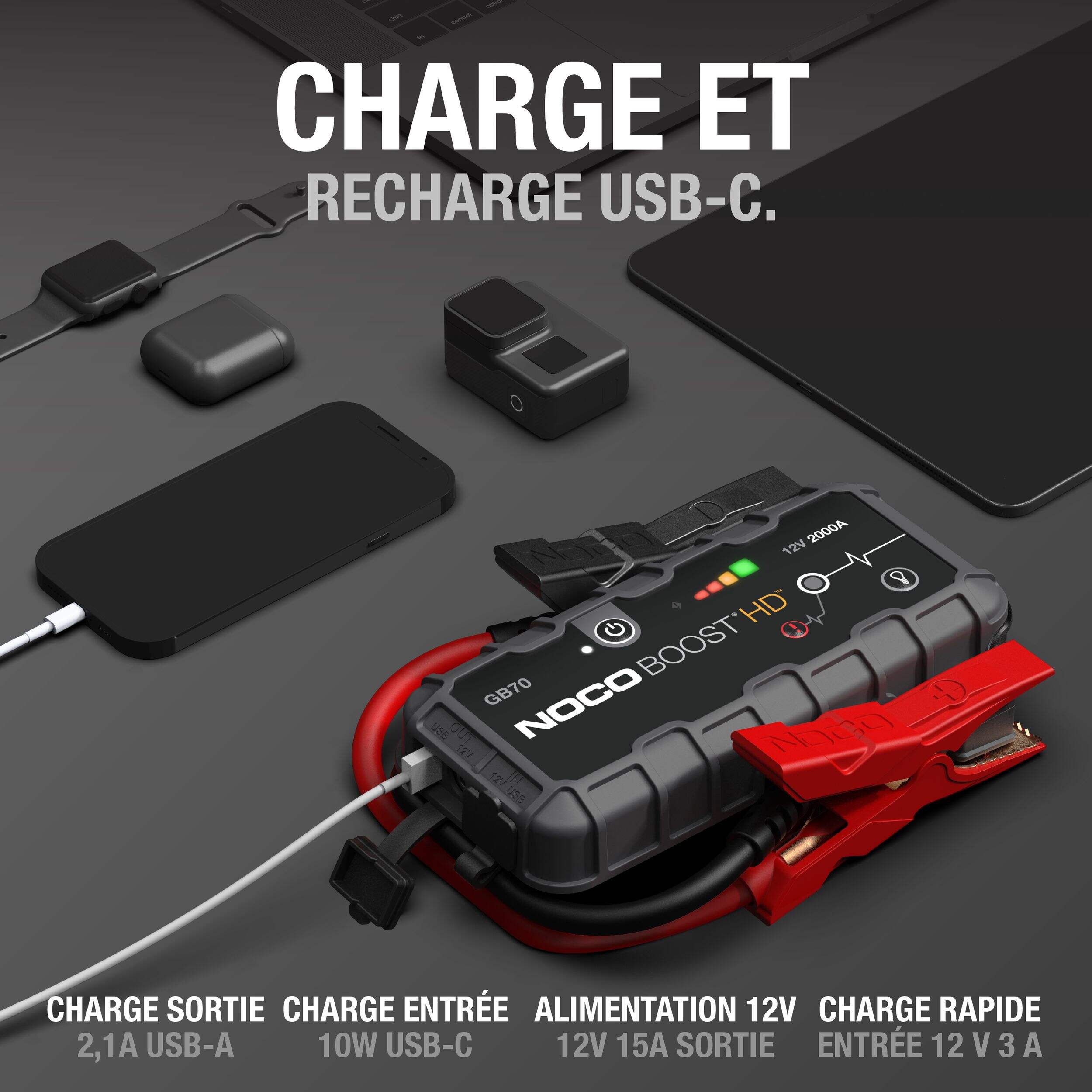 Le GB70 est un démarreur de batterie au lithium-ion portatif de 2 000 A pour démarrer une batterie à plat en quelques secondes. Il est doté d'une technologie de sécurité brevetée qui offre des connexions résistantes aux étincelles et une protection contre la polarité inversée, ce qui le rend sécuritaire et facile à utiliser pour tous. Il s'agit d'un démarreur de batterie puissant qui sert aussi de source d'alimentation portative pour recharger des appareils USB comme les téléphones intelligents ou alimenter des appareils de 12 V comme les gonfleurs de pneus.
