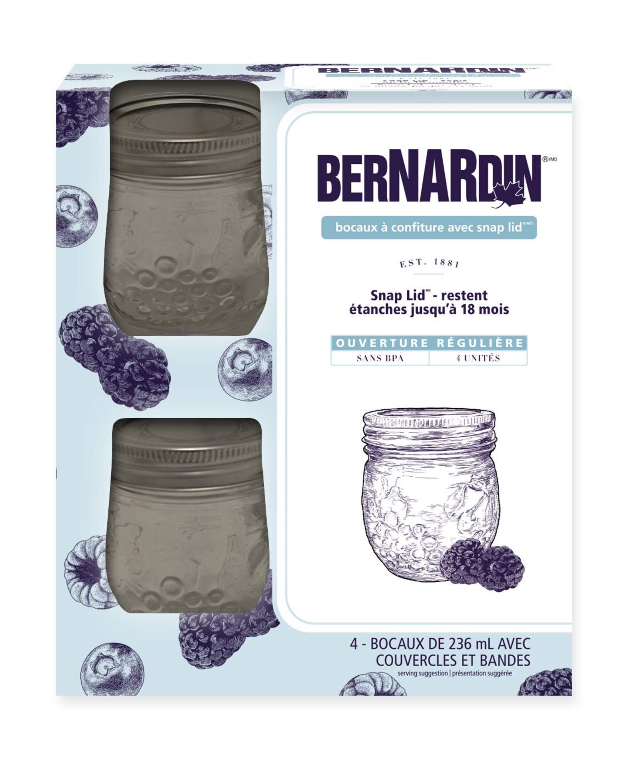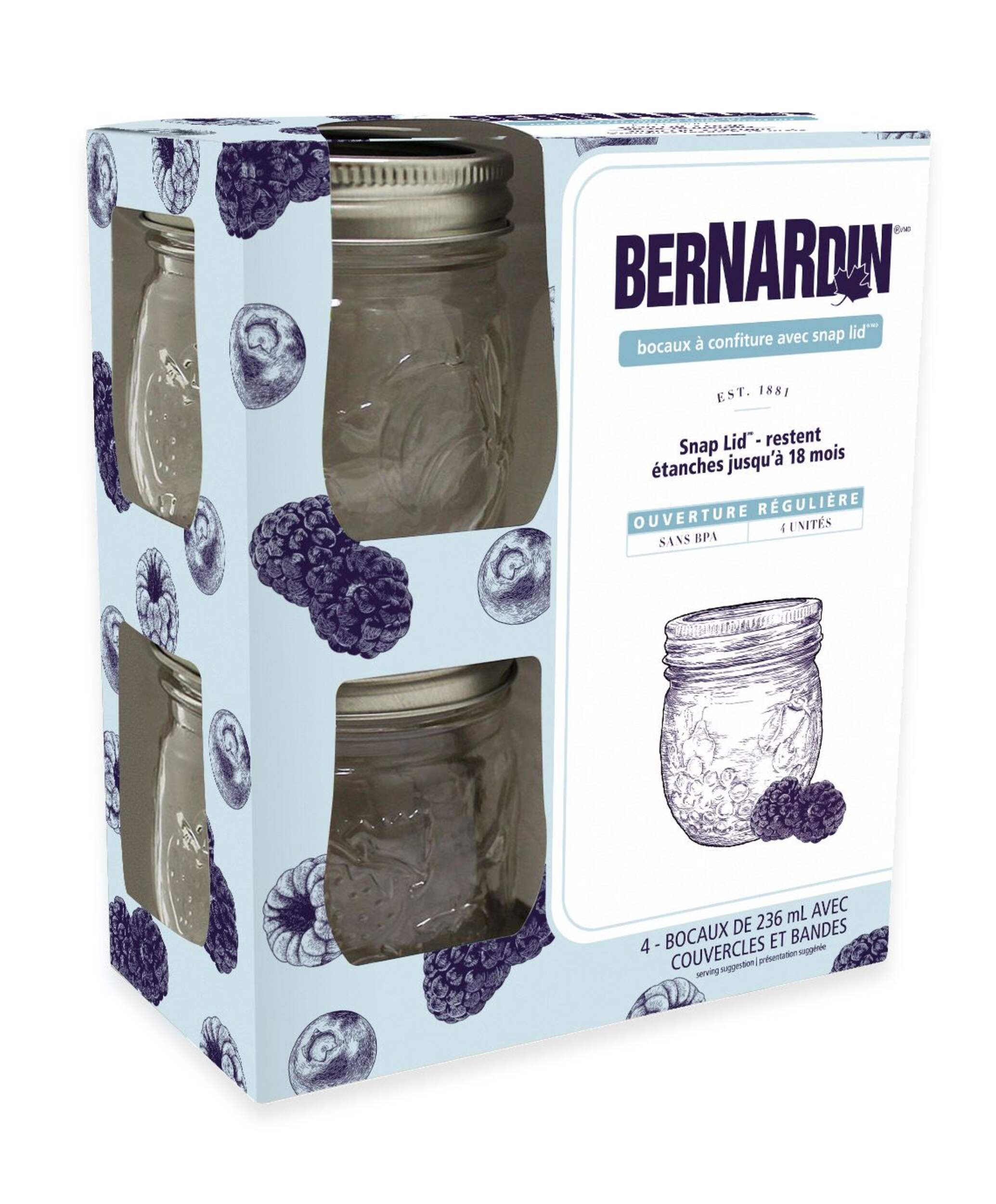Avec leur modèle inspiré des fruits et leur format de 236 mL, les bocaux à confiture à ouverture standard Bernardin sont parfaits pour une variété de conserves et de projets d'artisanat. Petits bocaux Mason parfaits pour ranger des confitures et des gelées fraîchement préparées, avec une forme ronde unique qui les rend parfaits pour offrir à vos amis et à votre famille de délicieuses créations. Ensemble de 4 bocaux Mason réutilisables sans BPA comprenant des couvercles et des bagues et fabriqué aux États-Unis.