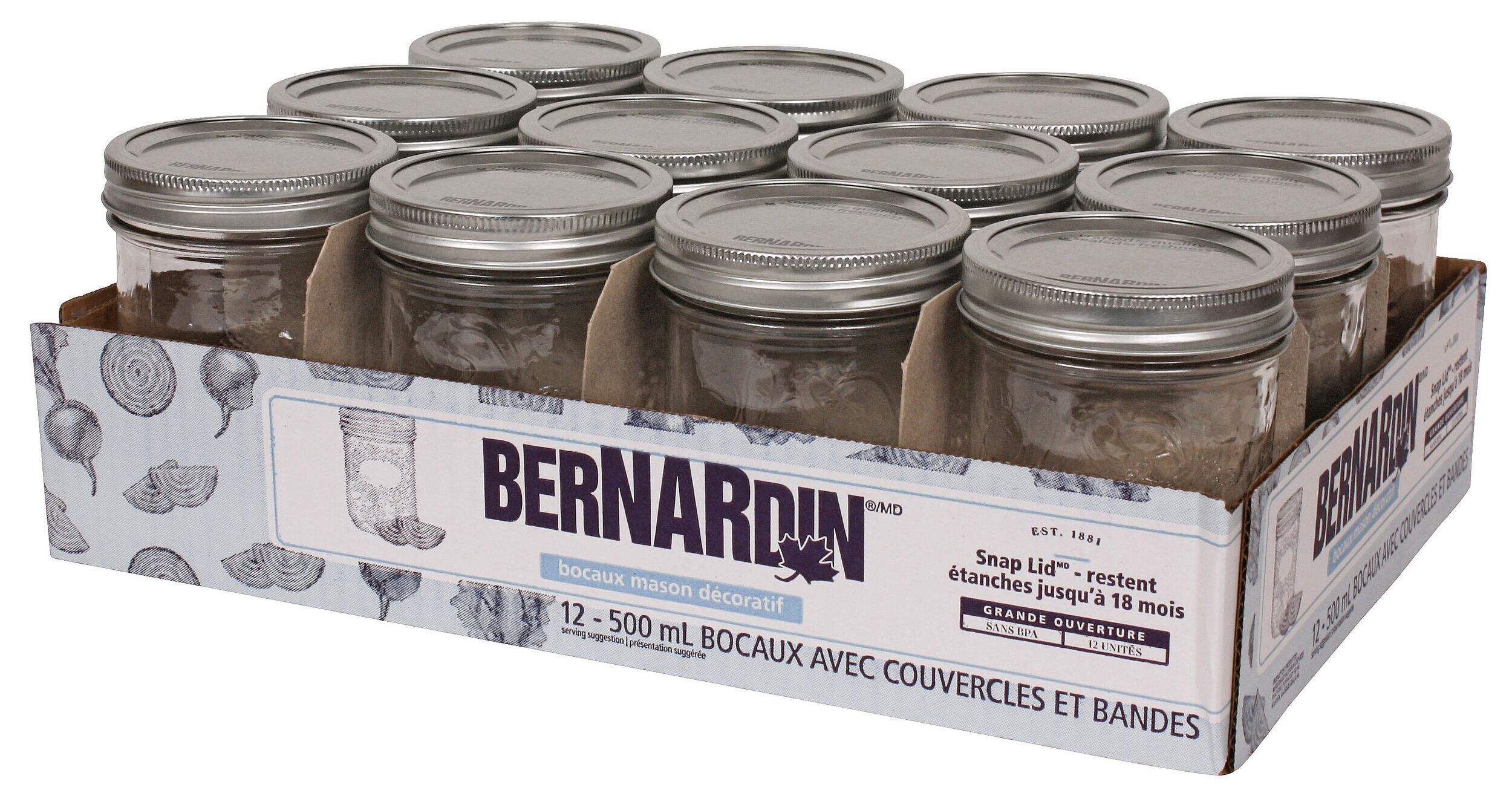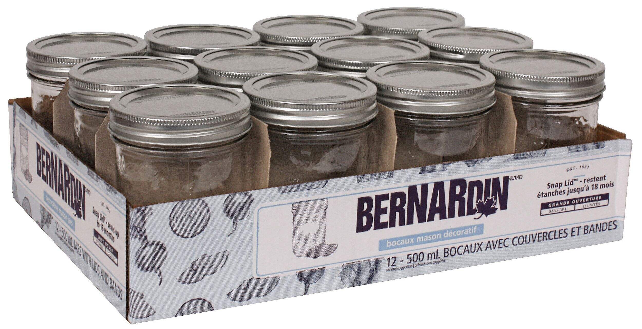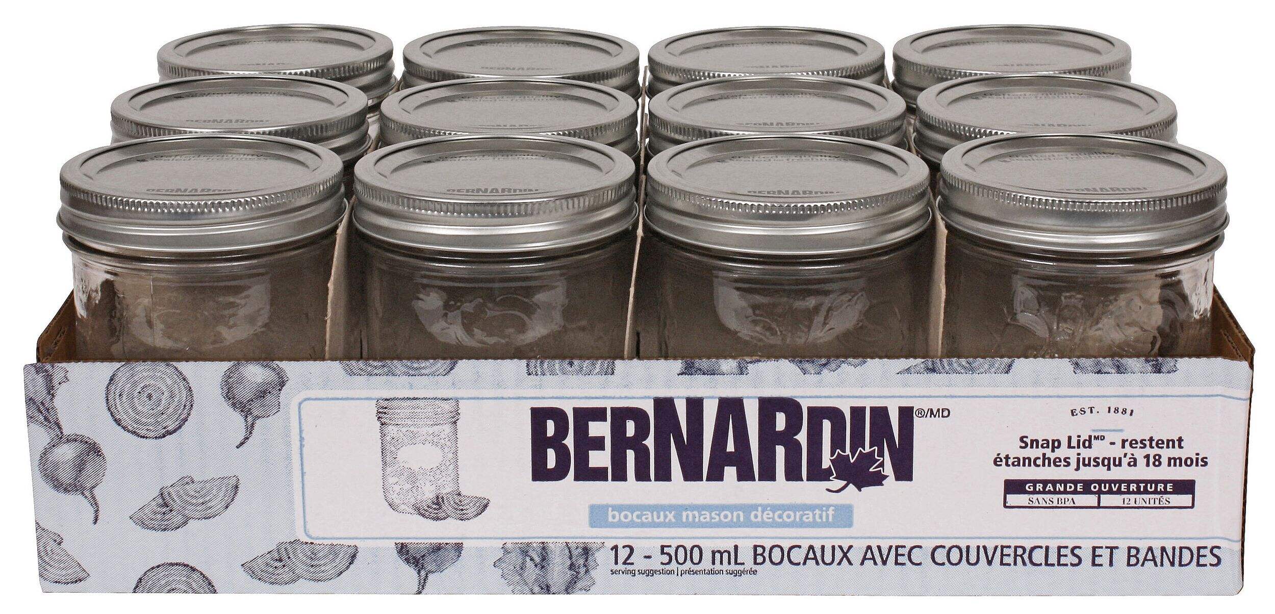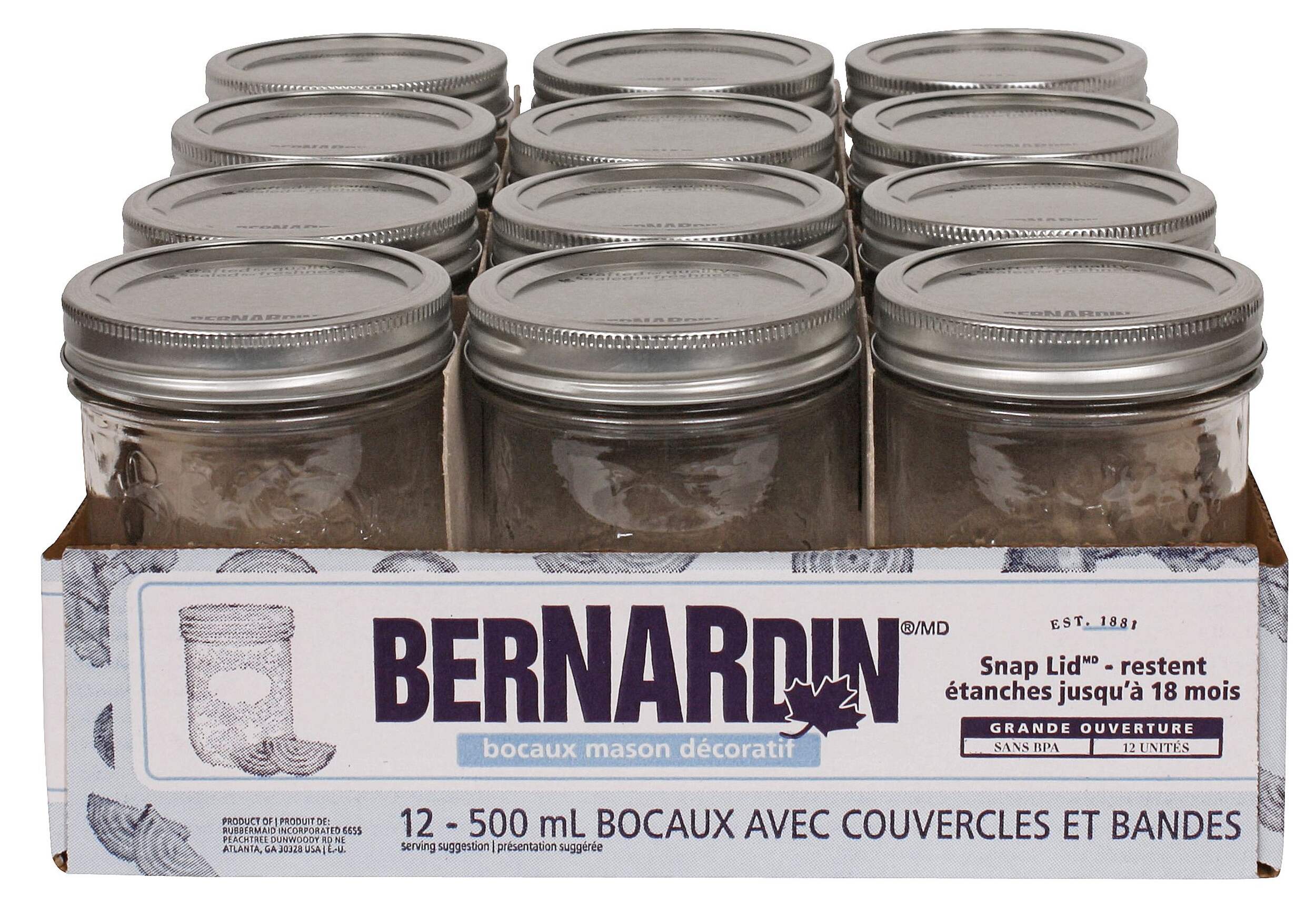 Bocaux Mason décoratifs en verre à ouverture large Bernardin parfaits pour mettre en conserve les cornichons, les gros fruits, les salsas, les relishs et les sauces. Dotés de surfaces texturées et de zones plates ovales pour les étiquettes, ces bocaux Mason traditionnels permettent de ranger efficacement les aliments en conserve sur les tablettes. Grande ouverture qui facilite le remplissage et couvercles à pression qui assurent une étanchéité pour préserver la fraîcheur. Bocaux Mason populaires de 500 mL de Bernardin qui mettront en valeur vos créations maison tout en les protégeant pendant les saisons.