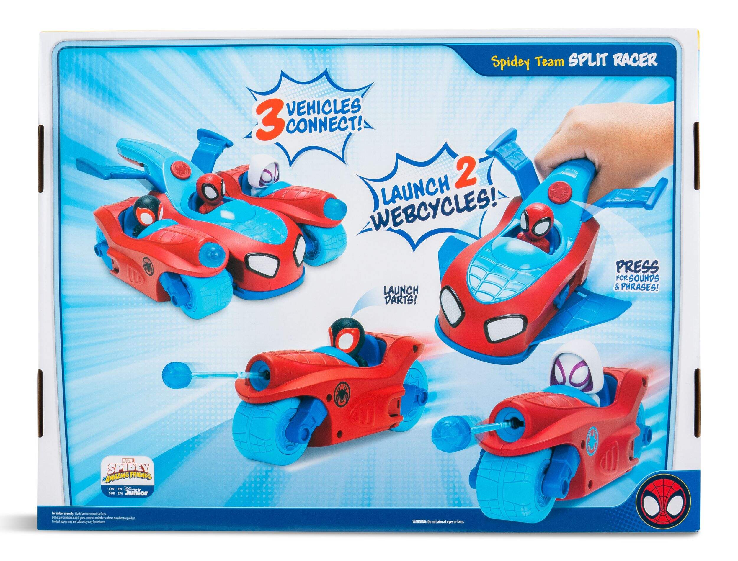 Préparez-vous à l'action avec le bolide séparable Spiderman Spidey et ses amis extraordinaires. Commencez par réunir toute l'équipe dans une seule voiture de course pour une conduite exaltante. Lorsqu'il est temps de se séparer, appuyez simplement sur l'icône Spidey à l'arrière pour séparer les véhicules. Utilisez les têtes pour lancer des flèches en forme de toile sur les méchants qui se trouvent sur votre chemin et appuyez sur la gâchette du jet de Spidey pour sortir les ailes et activer des sons excitants. Lorsque la mission exige un regroupement, attachez facilement les deux motos au jet et faites de nouveau la course ensemble. Inspiré de l'émission populaire Spidey et ses amis extraordinaires.