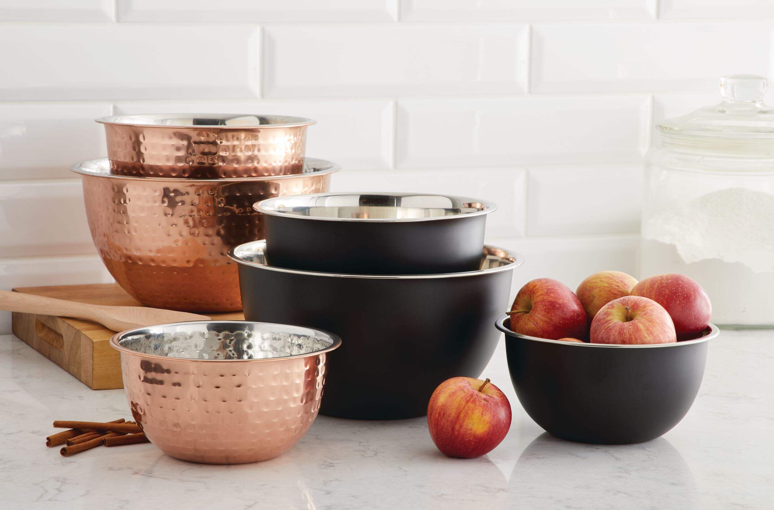 Pour un ajout charmant et utile à votre cuisine, ne cherchez pas plus loin que les bols à mélanger plaqués en cuivre MASTER Chef. Durablement construit et impeccablement conçu, chacun des trois bols à mélanger de cet ensemble unique est fait d'acier inoxydable. Extérieur plaqué cuivre martelé à la main donnant à ces bols une allure artisanale tendance qui s'harmonise à la fois au décor traditionnel et moderne de la cuisine. Ensemble de bols à mélanger comprenant 3 bols polyvalents et empilables de différentes tailles : petit (1,7 pinte), moyen (3 pintes) et grand (5 pintes). Contrairement aux bols à mélanger en céramique ou en verre, chacune de ces beautés plaquées cuivre est légère et étonnamment profonde, avec un volume suffisant pour répondre à vos besoins de mélange. Bien qu'ils soient conçus pour être utilisés dans la cuisine, ces bols à mélanger en cuivre sont assez charmants pour impressionner vos invités comme ajouts décoratifs aux comptoirs, aux tablettes ou aux tables. Conviennent aussi aux réceptions ou aux fêtes et ont l'air géniaux remplis de fruits, de bonbons ou d'autres friandises. Bols haut de gamme attrayants qui ne vont pas au lave-vaisselle, alors assurez-vous de les laver à la main, de préférence avec un chiffon doux.