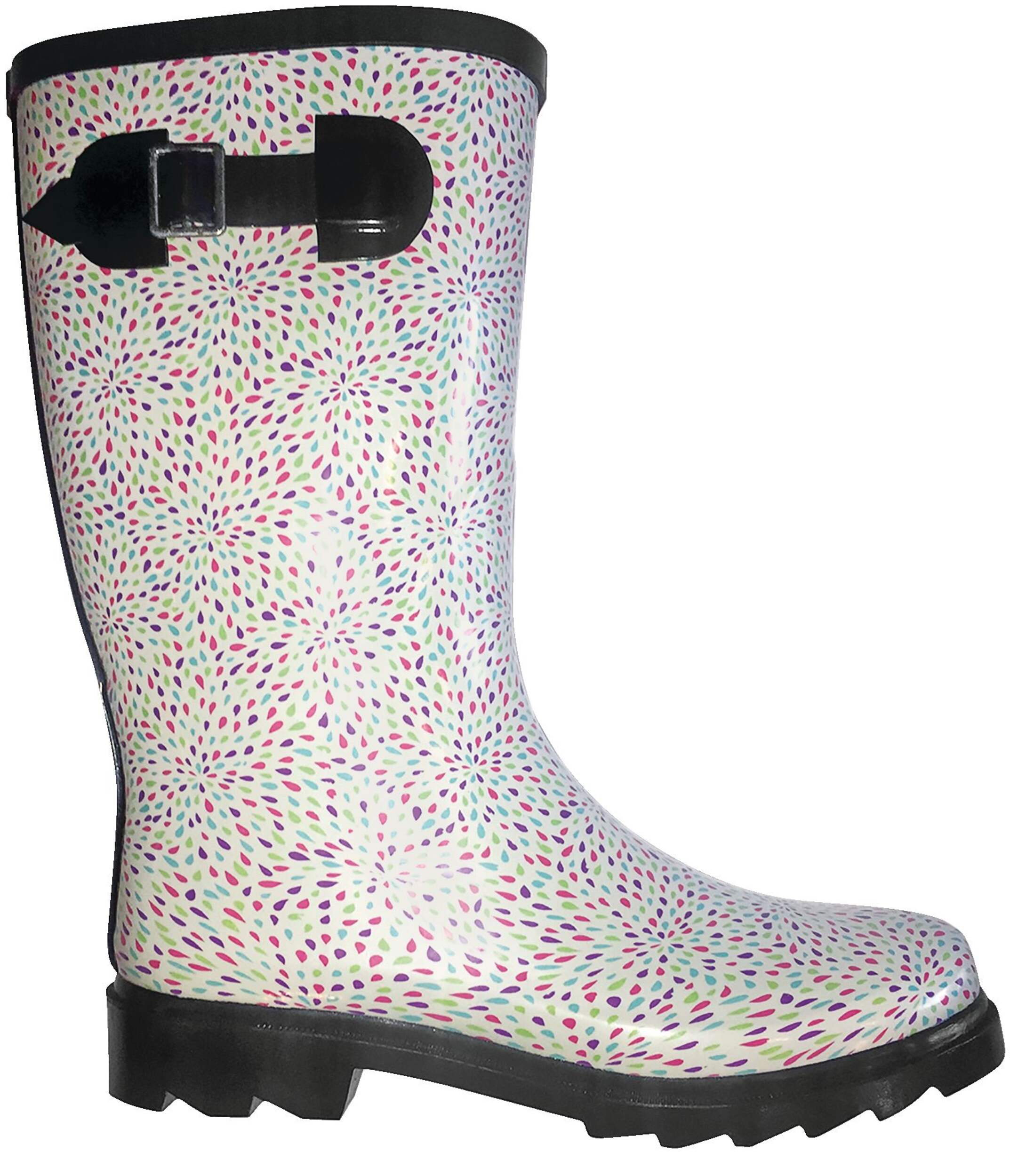 Égayez une journée pluvieuse et gardez les pieds au sec avec ces bottes à motif de pluie Outbound pour dames. Ces bottes de pluie présentent un motif de gouttes de pluie multicolores avec des accents noirs. Ces bottes en caoutchouc sont dotées d'une semelle d'usure sculptée pour une prise sûre sur les surfaces mouillées et d'une assise plantaire confortable. Ces bottes imperméables ont une élégante sangle latérale pour l'ajustement et sont offertes en pointures américaines 6 à 10.