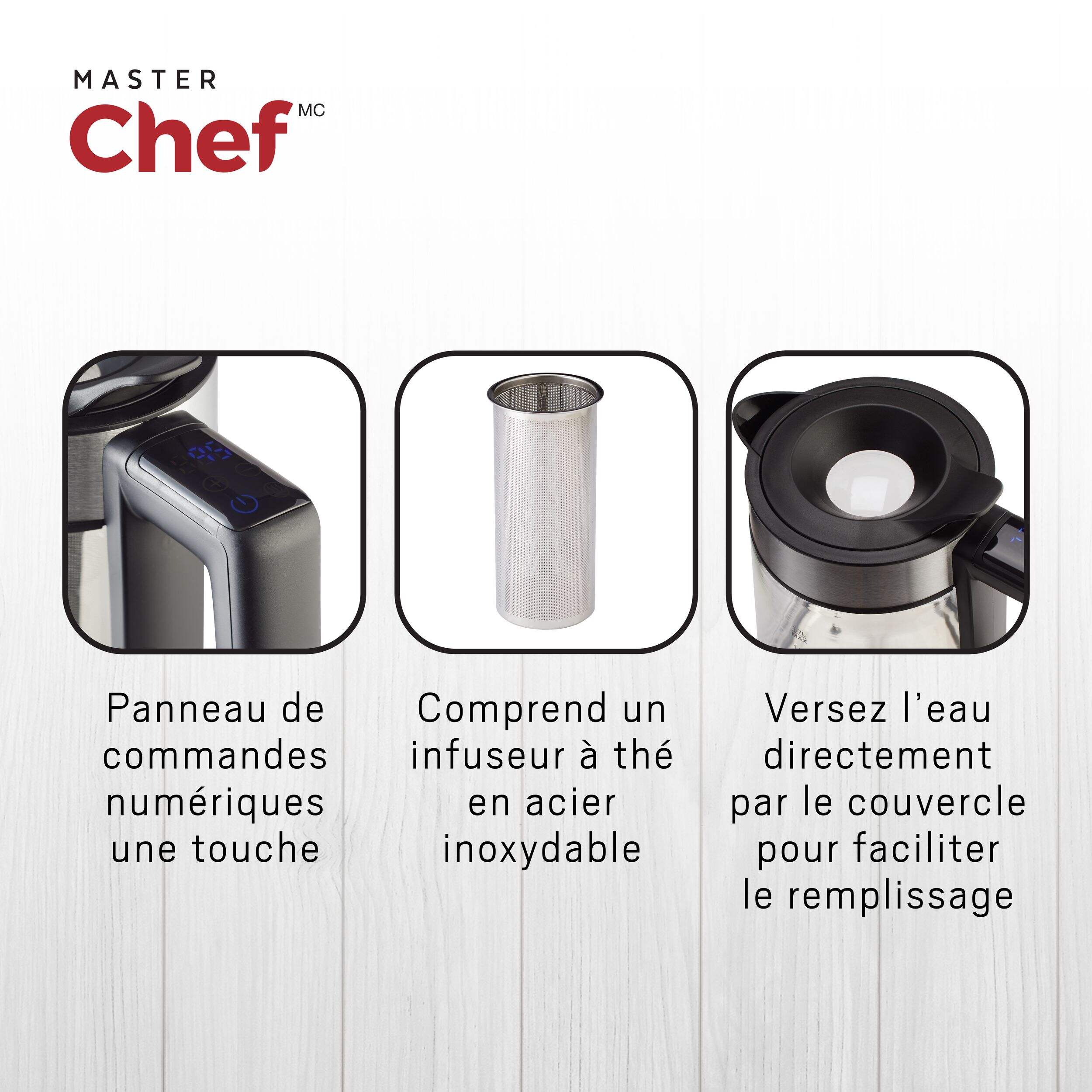 Bouilloire en verre sans cordon à 360° avec infuseur de MASTER Chef de 1,7L dotée d'un extérieur en verre trempé