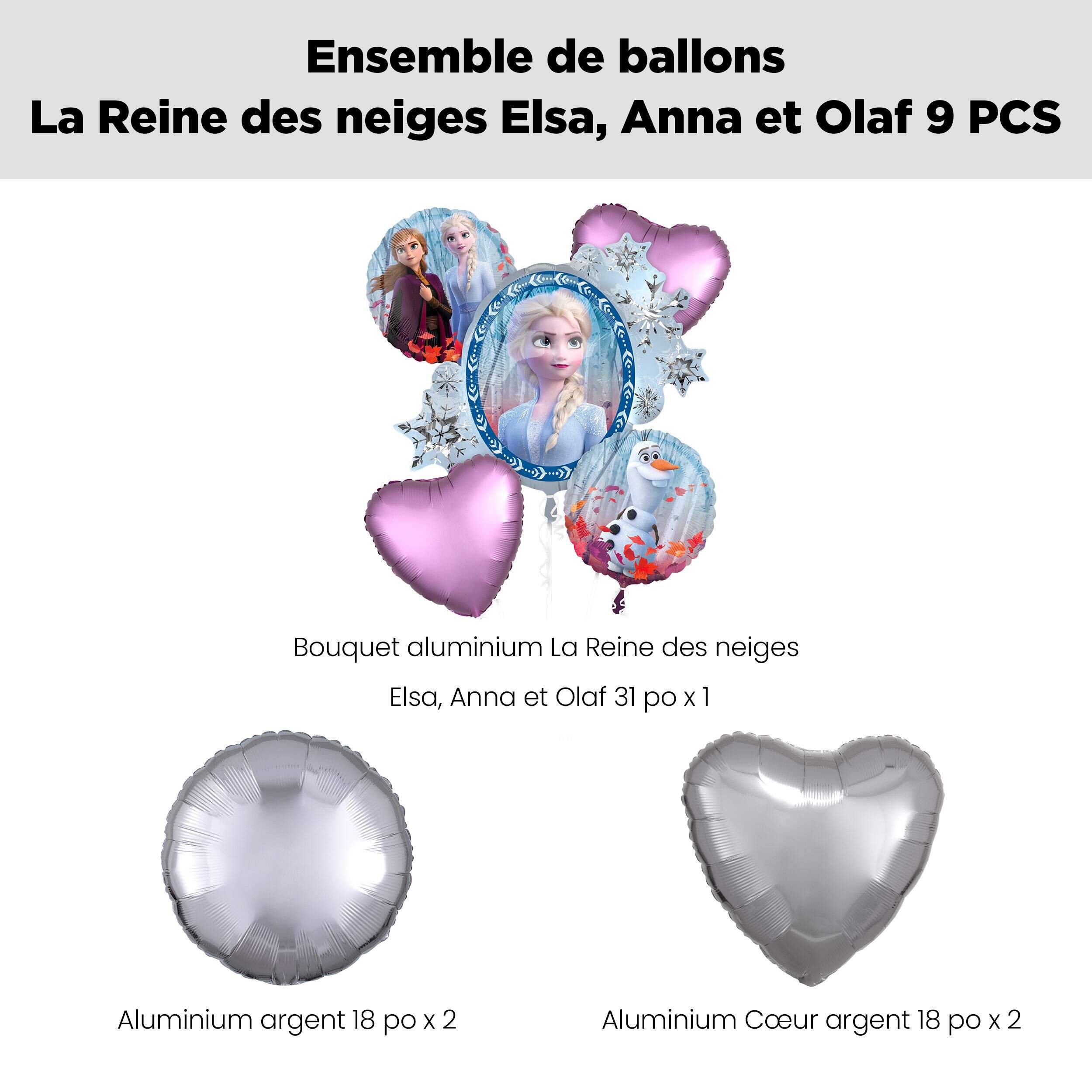 Comprend un ballon géant à deux côtés avec Elsa d'un côté et Anna de l'autre, et de petits ballons avec Elsa, Anna et Olaf