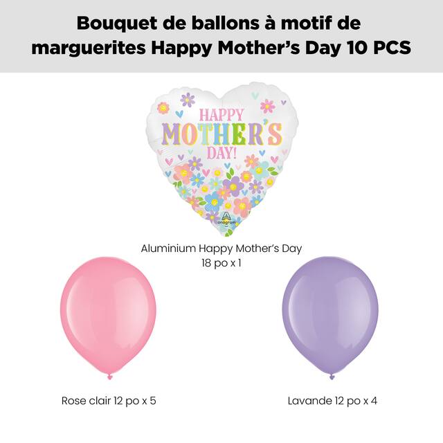 Contenu de l’ensemble : 1 ballon « Happy Mother’s Day » à motif de marguerites de 18 po (UCS 8551522), 4 ballons ronds en latex lavande de 12 po (UCS 8421404) et 5 ballons en latex nouveau roses de 12 po (UCS 8421412)