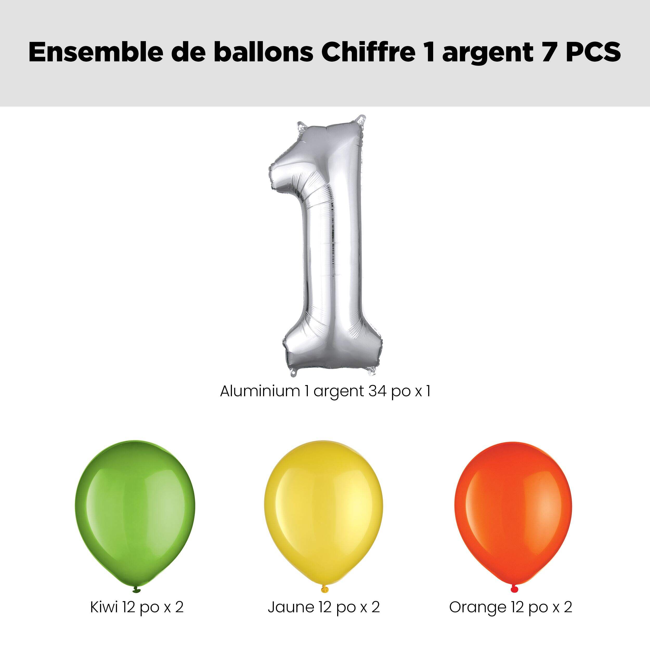 Ensemble qui comprend : 1 ballon argenté avec le chiffre 1 de 34 po (UCS 8424238), 2 ballons en latex kiwi de 12 po (UCS 8421415), 2 ballons en latex jaunes de 12 po (UCS 8421407) et 2 ballons en latex orange de 12 po (UCS 8421405)