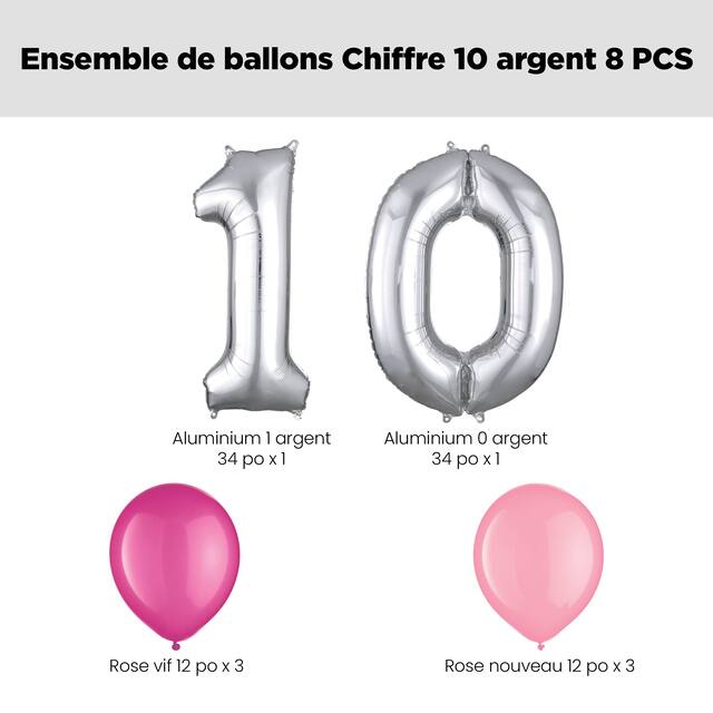 Ensemble qui comprend : 1 ballon argenté avec le chiffre 1 de 34 po (UCS 8424238), 1 ballon argenté avec le chiffre 0 de 34 po (UCS 8424237), 3 ballons en latex rose vif de 12 po (UCS 8421409) et 3 ballons en latex nouveau rose de 12 po (UCS 8421412)