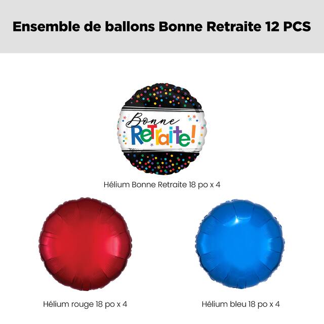 Contenu de l'ensemble: 4 ballons ronds métalliques satinés Bonne retraite 18 po (UCS 8546017), 4 ballons ronds métalliques dorés 18 po (UCS 8423907) et 4 ballons métalliques noirs de 18 po (UCS 8423909)