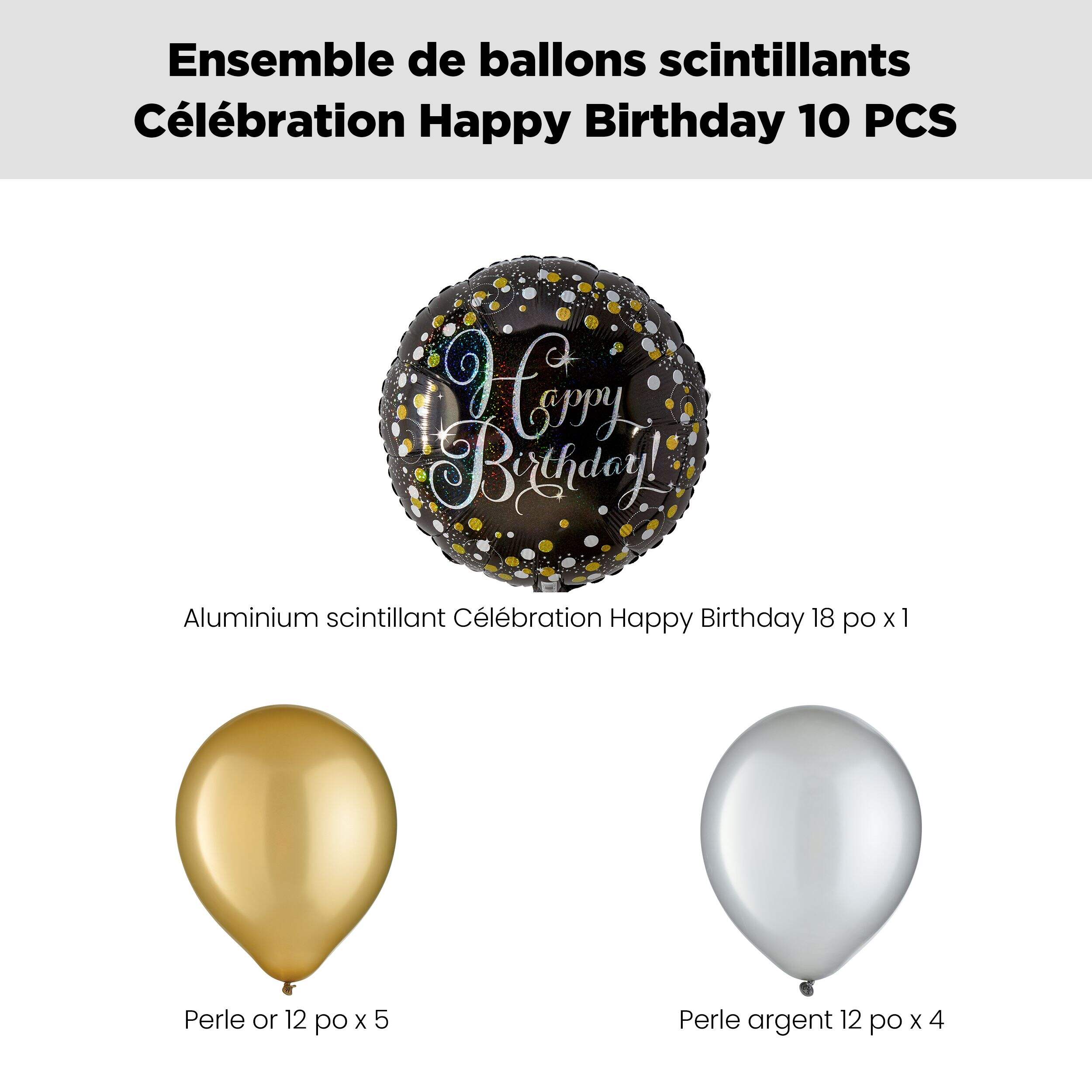 Contenu de l'ensemble : 1 ballon prismatique étincelant Happy Birthday de 18 po (UCS 8424042), 5 ballons en latex nacrés dorés de 12 po (UCS 8421426) et 4 ballons en latex argentés de 12 po (UCS 8421425)