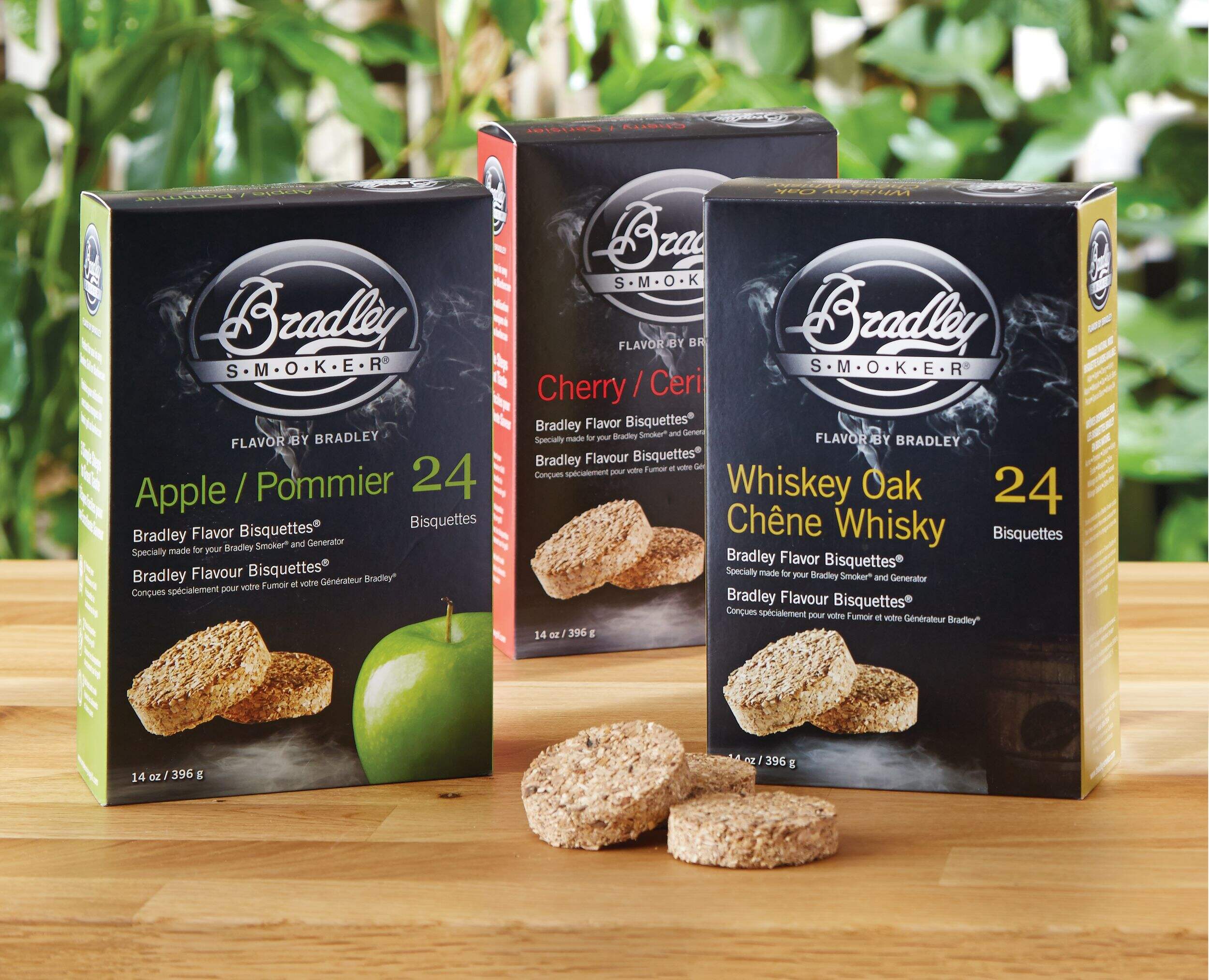Les briquettesMD de bois de pommier pour fumoir Bradley sont faites de bois pur. Vous pouvez donc fumer des aliments avec un goût pur et délicieux. Les briquettes à saveur de bois de pommier, membre de la famille des arbres fruitiers, produisent un arôme de fumée léger, fruité et légèrement sucré traditionnellement utilisé pour fumer le porc et la volaille. Certaines des meilleures côtes fumées sont aussi faites avec des briquettes de bois de pommier! Les briquettes à saveur de bois de pommier s'agencent particulièrement bien avec la volaille, le boeuf, le porc, l'agneau et le fromage.