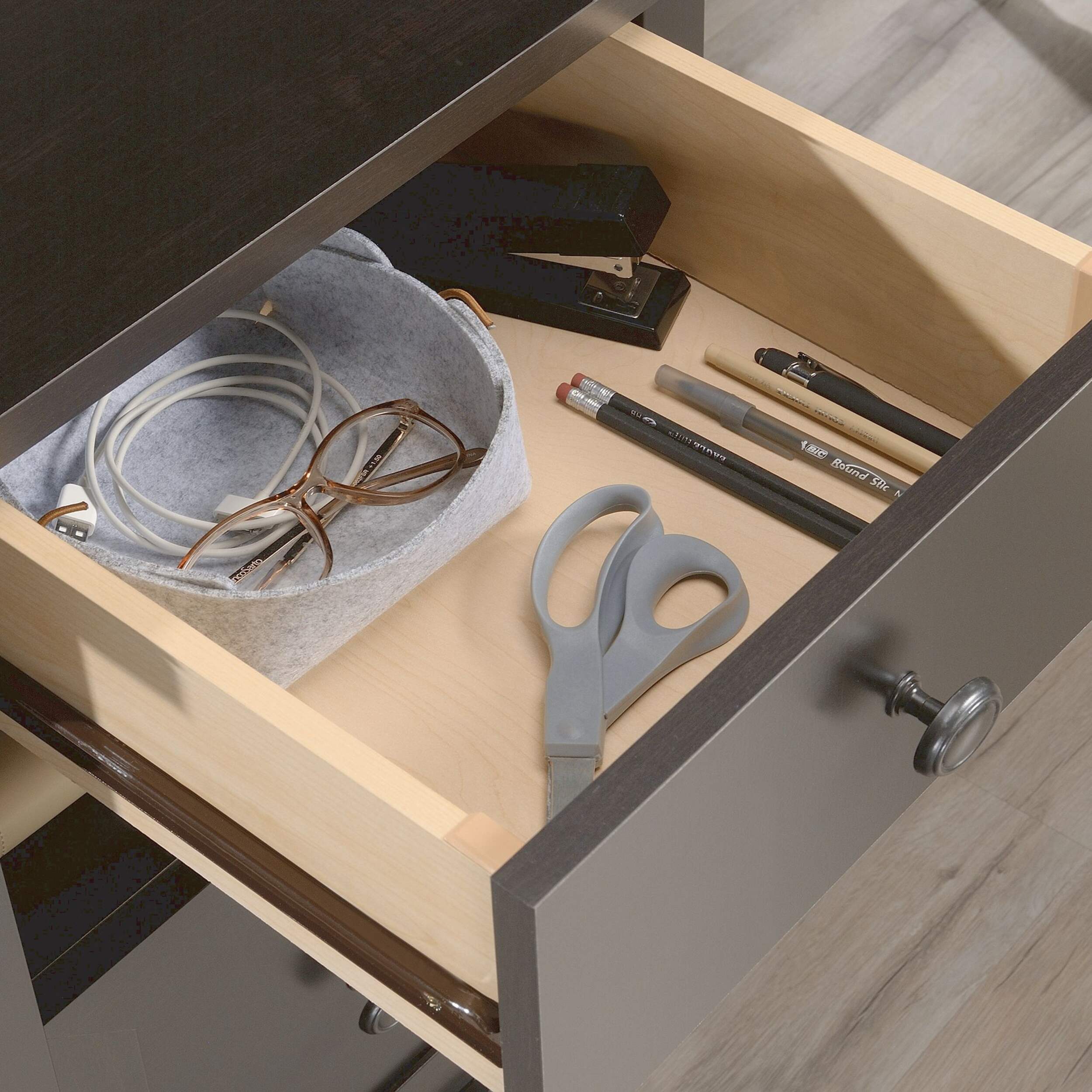 Petit tiroir pour stylos et cahiers de notes, entre autres, qui est doté de glissières en métal et de butées de sécurité