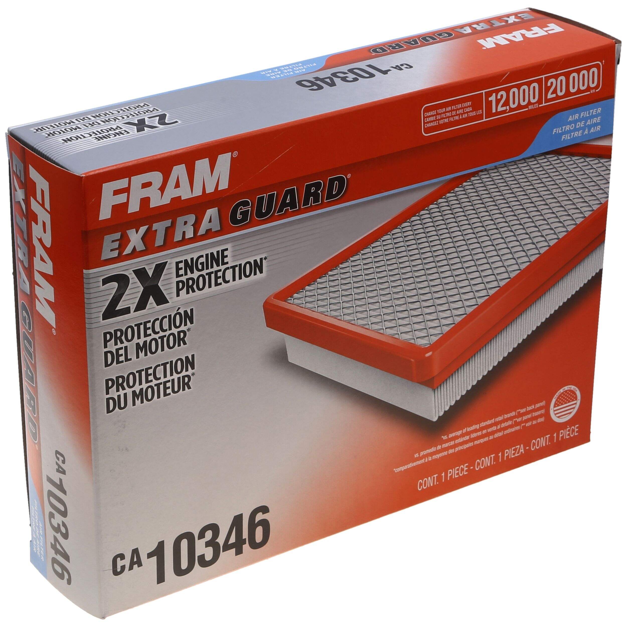 Filtre à air FRAM Extra Guard qui protège 2 fois mieux le moteur que la moyenne des filtres standards de marques concurrentes