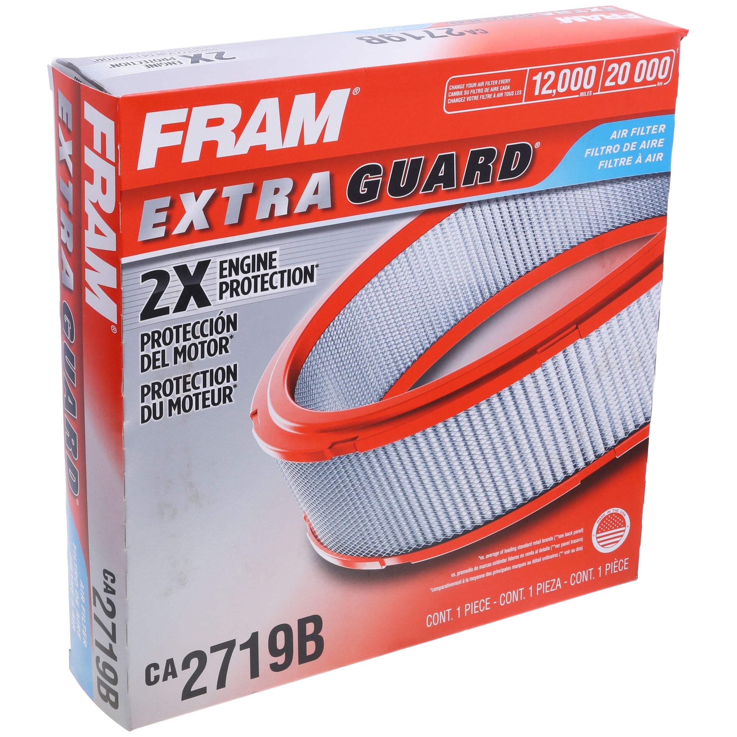 Filtre à air FRAM Extra Guard qui protège 2 fois mieux le moteur que la moyenne des filtres standards de marques concurrentes