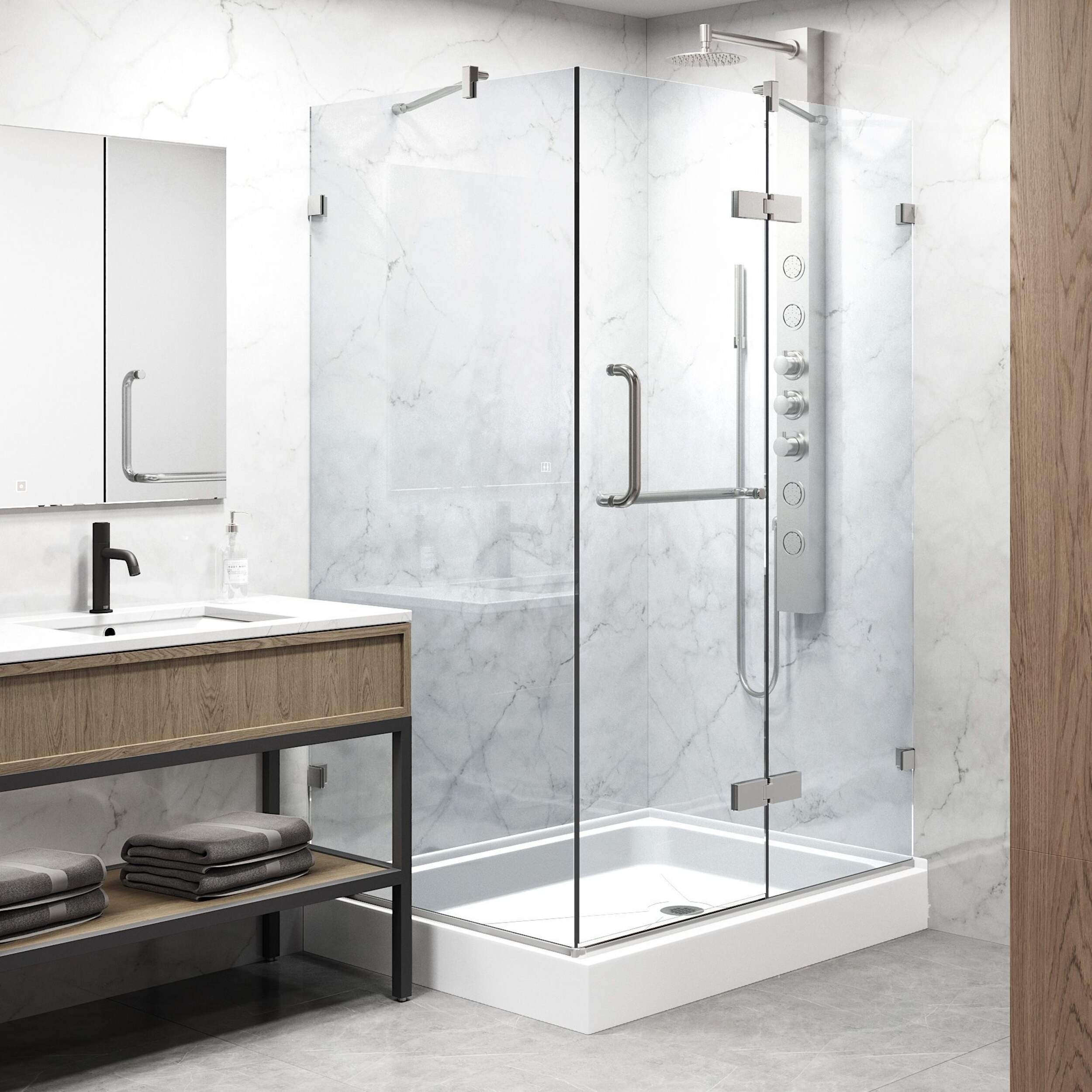 ENSEMBLE POUR DOUCHES EN COIN : améliorez votre expérience de bain avec notre douche en coin de qualité supérieure qui comprend une cabine de douche à charnières en verre de 48 po L x 36 po la x 79 po H, offerte en fini chromé ou nickel brossé, avec une base en acrylique, un drain à droite et un fond texturé antidérapant pour plus de sécurité ainsi qu'une grande ouverture de 24 po