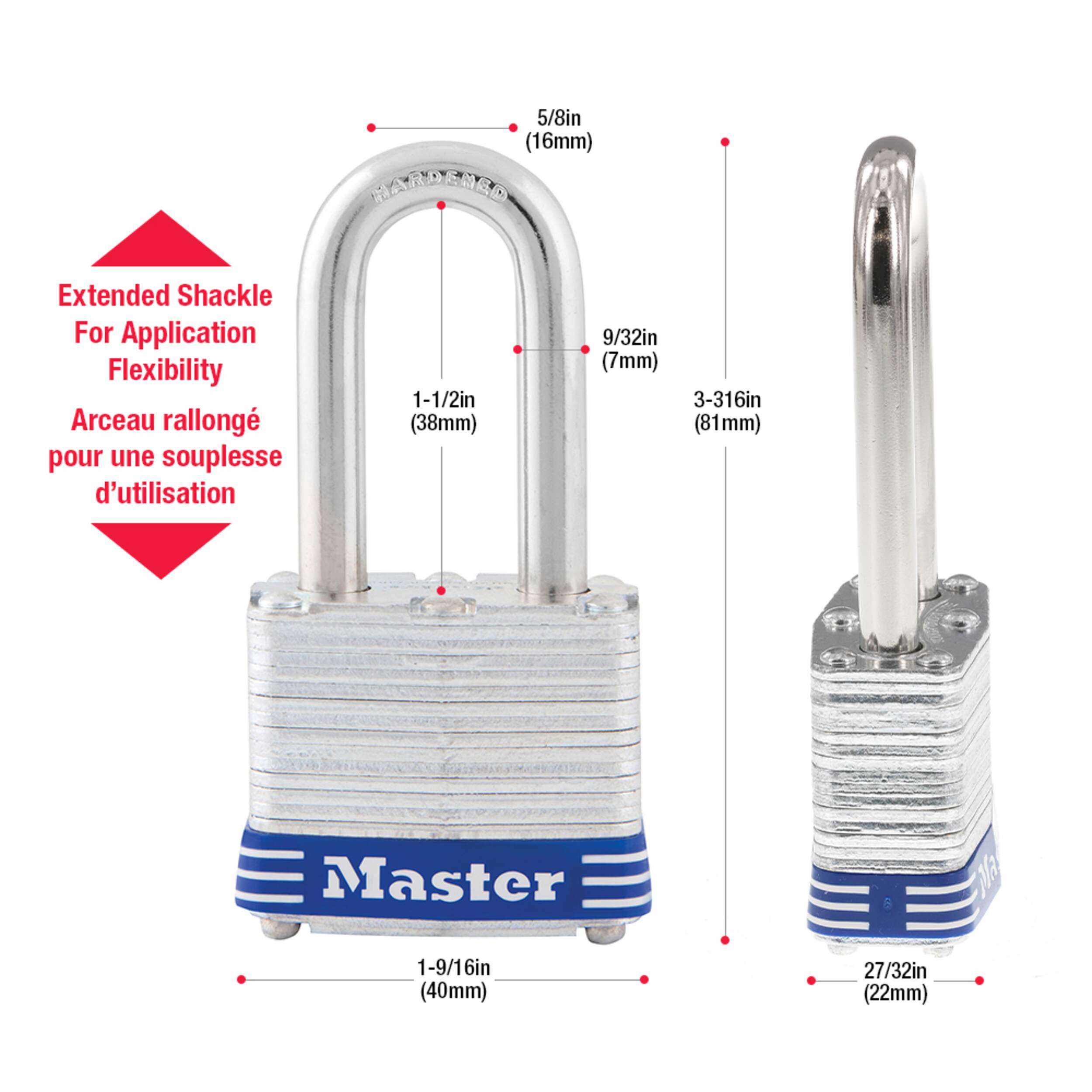 Les cadenas Master Lock de 40 mm de largeur en acier laminé offrent une sécurité fiable pour diverses applications. Chaque cadenas est doté d'un corps en acier laminé de 40 mm (1-9/16 po) de large, offrant une robustesse et une durabilité exceptionnelles. La manille longue en acier trempé de 38mm (1-1/2 po) résiste à la coupe et au sciage, tandis que les deux roulements à billes de verrouillage empêchent le forçage. Conçu avec un barillet à 4 goupilles pour une résistance au crochetage, cet ensemble de quatre cadenas à clé identique permet à une clé d'ouvrir toutes les serrures pour plus de commodité.