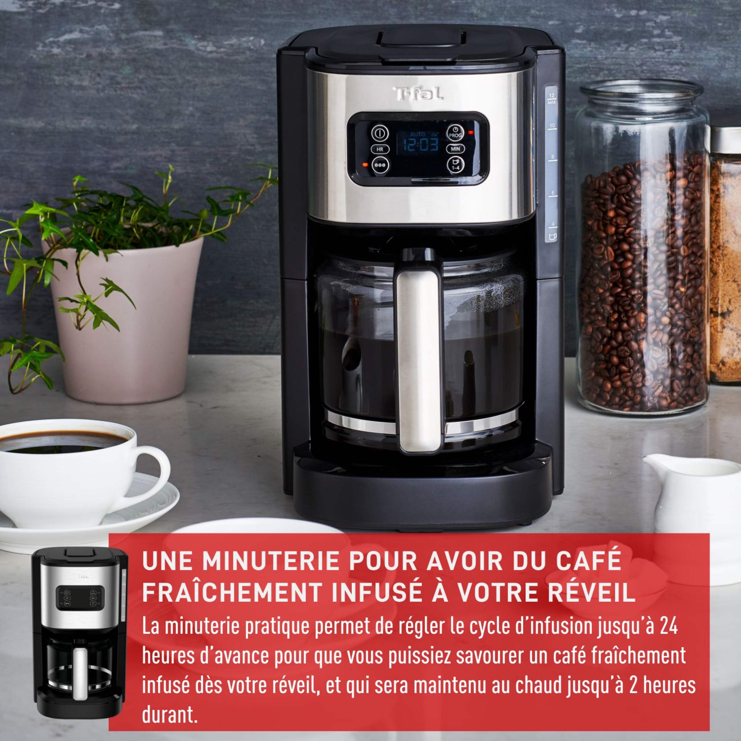 Cafetière en acier inoxydable T-Fal Element qui combine le délicieux café auquel vous vous attendez de T-Fal à une esthétique ultra raffinée en acier inoxydable de qualité supérieure. Cafetière programmable à grande capacité dotée d'une minuterie pratique pour régler le cycle d'infusion jusqu'à 24 heures à l'avance pour avoir un café fraîchement infusé dès votre réveil et le garder au chaud jusqu'à 2 heures. Sélecteur d'intensité d'infusion offrant une infusion personnalisée pour un café parfait selon vos goûts et tête d'eau saturant uniformément le café moulu, optimisant ainsi le système d'infusion pour des résultats délicieux.Mode corsé offrant une meilleure extraction pour un café plus fort et plus robuste. Fonctions pratiques incluant un système antigoutte, pour verser du café pendant le cycle d'infusion, un cycle de maintien au chaud de 2 heures pour une tranquillité d'esprit totale et un mode pour de petites quantités de 1 à 4 tasses.