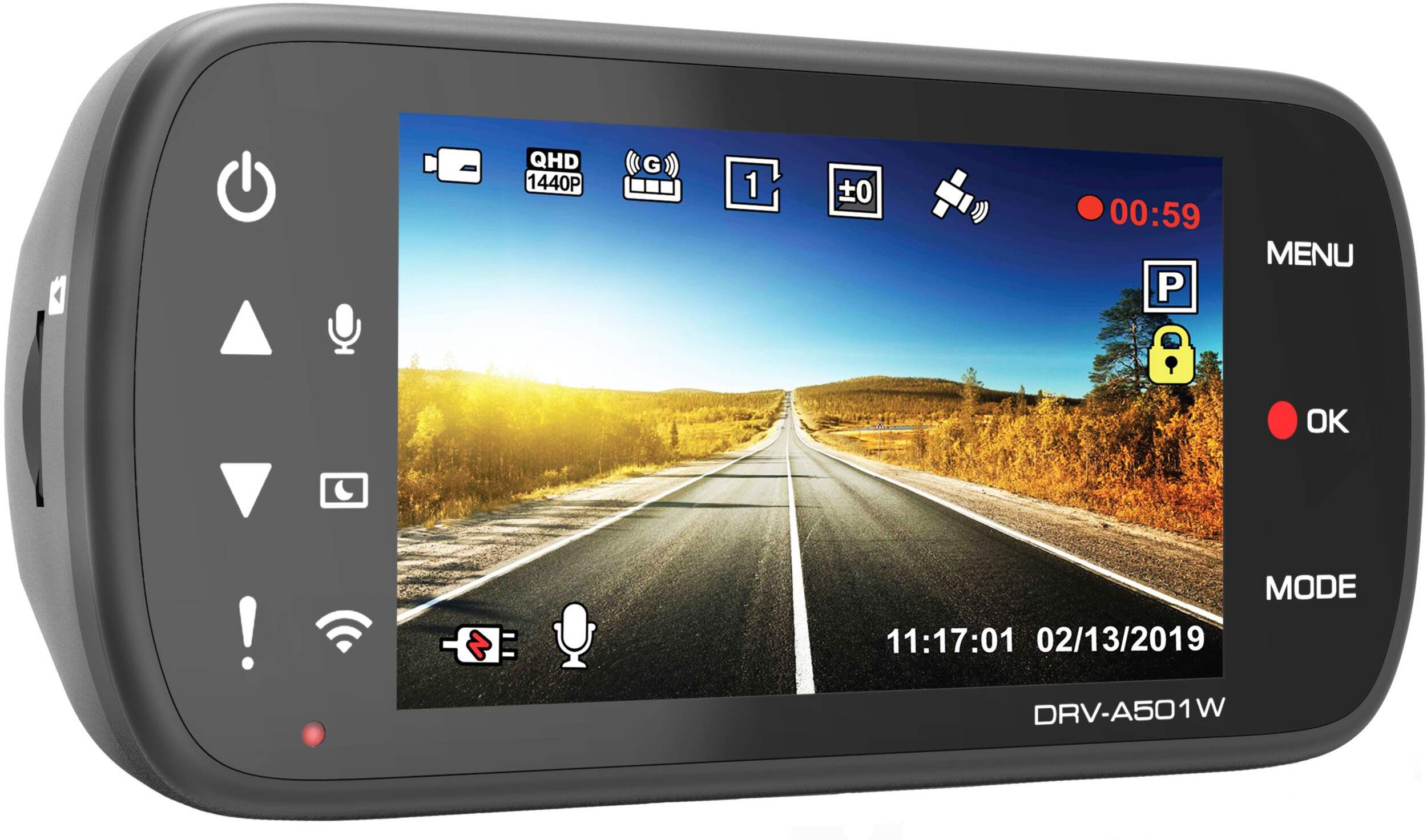 DRV-A501W équipé d'un détecteur de gravité conçu pour détecter une collision et d'un GPS qui enregistre la vitesse, la latitude et la longitude