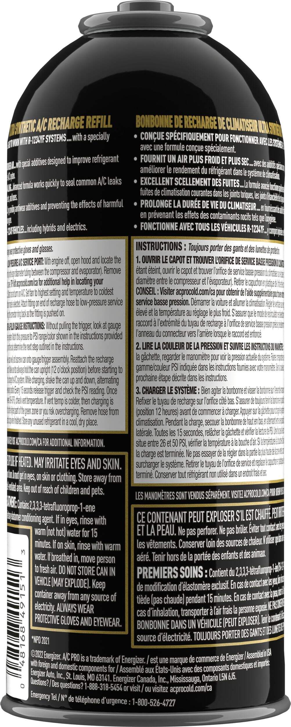 Le remplissage de fluide frigorigène R-1234yf ultra-synthétique A/C ProMD est doté d'une formule spécialement conçue qui aide votre véhicule à produire l'air le plus froid. Environ 8 oz. de R-1234yf et 2 oz. d'additifs servent à recharger le système de climatisation d'un véhicule, à sceller les fuites courantes dans les composants en caoutchouc et à protéger et à prolonger la durée de vie du système de climatisation en éliminant l'accumulation d'acide et d'humidité.