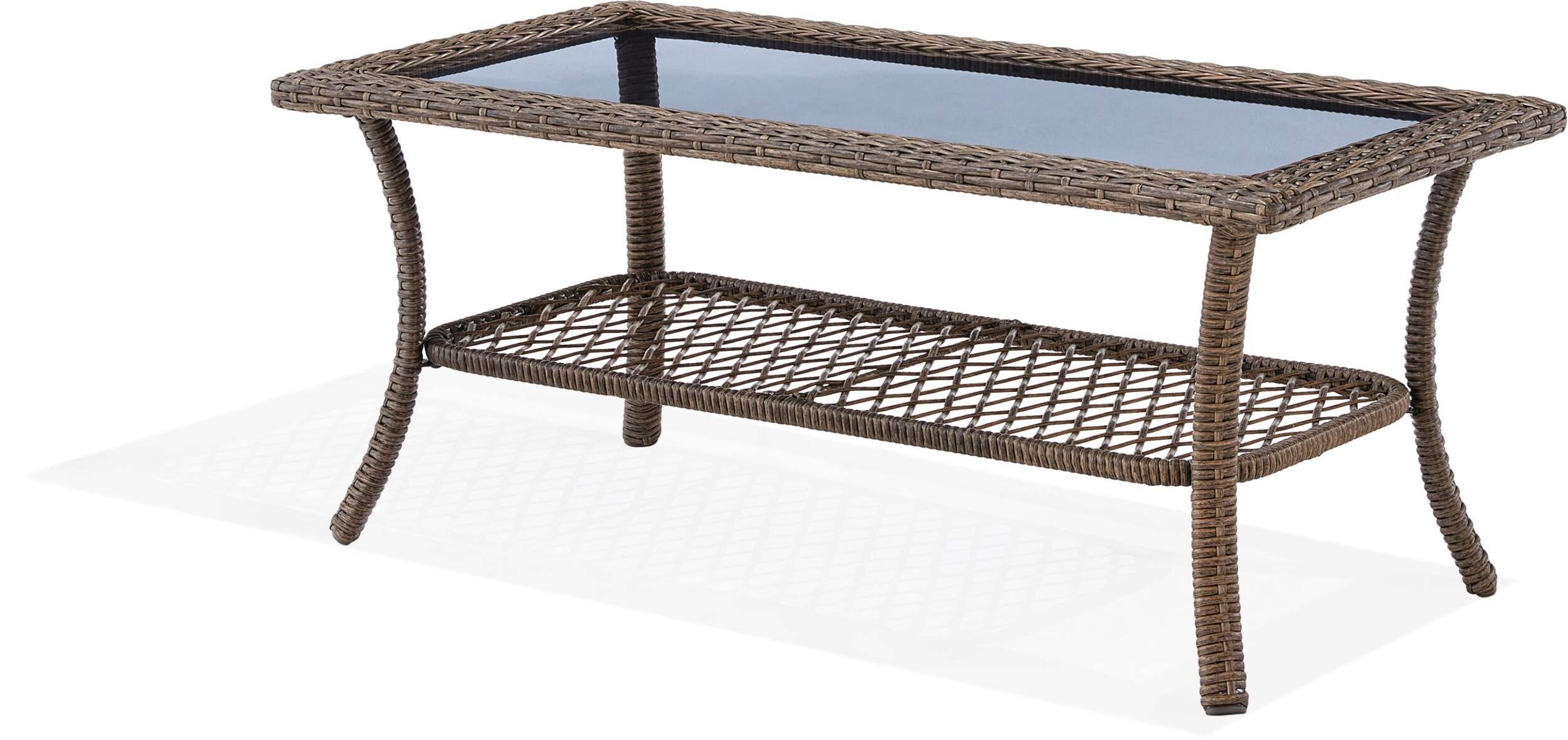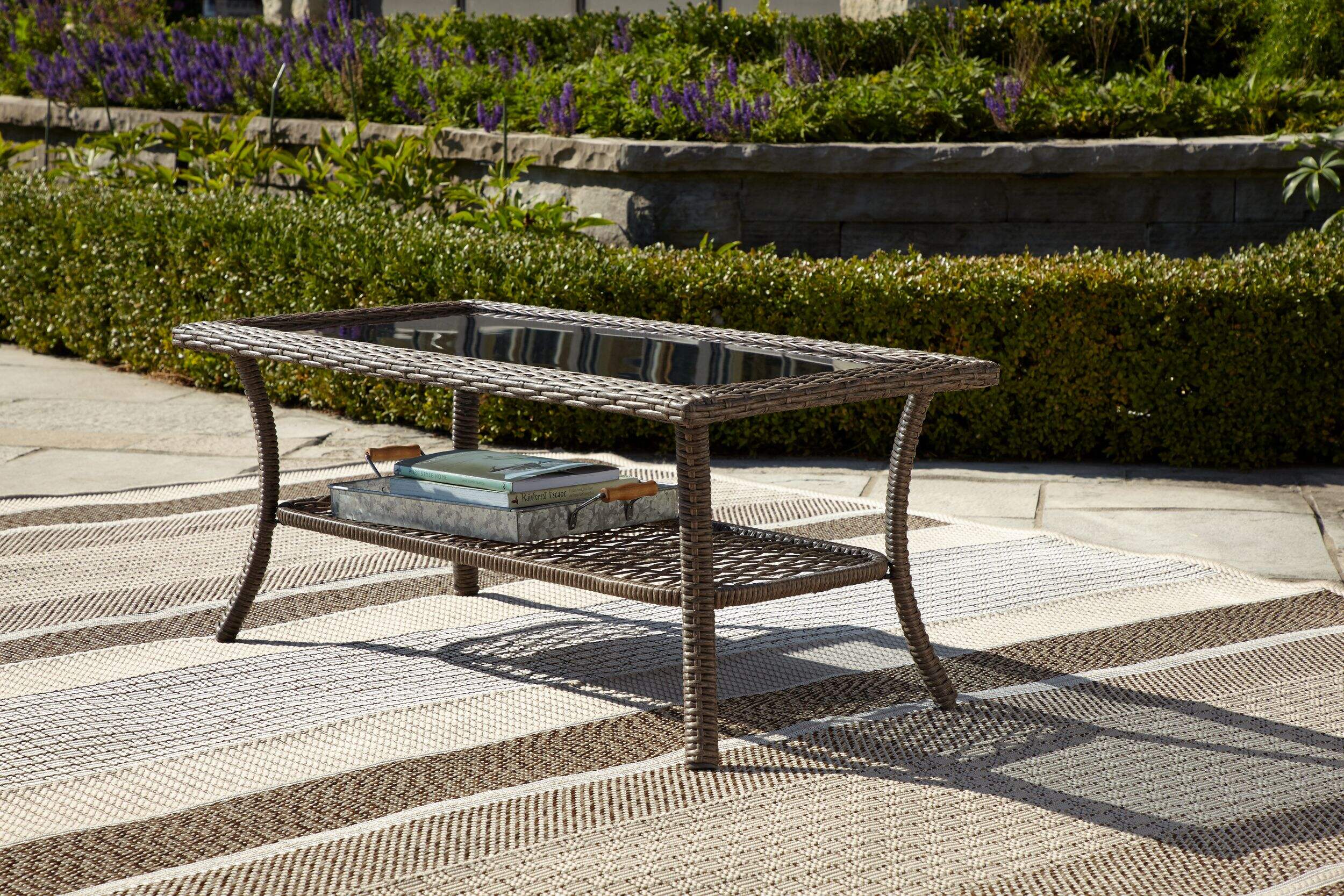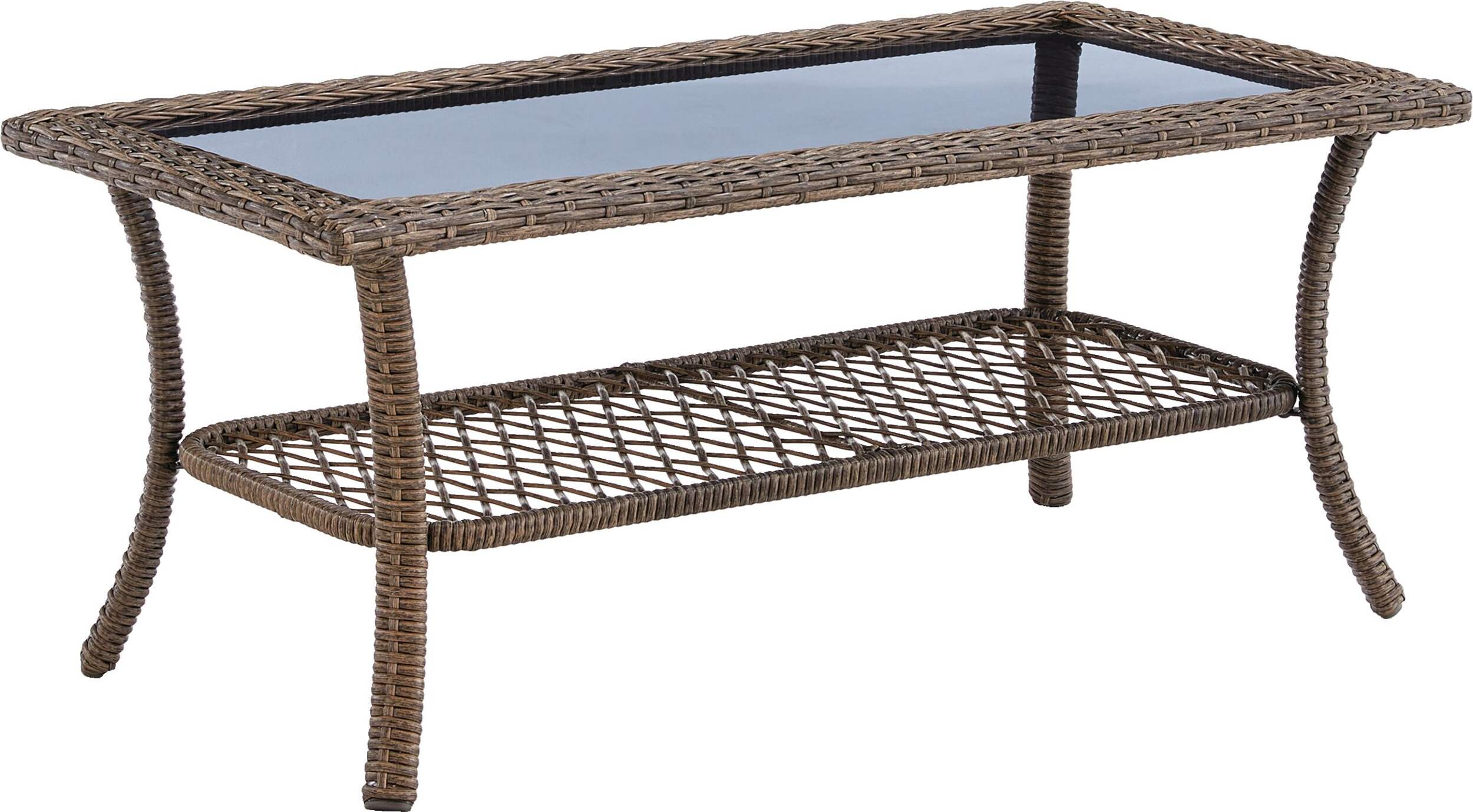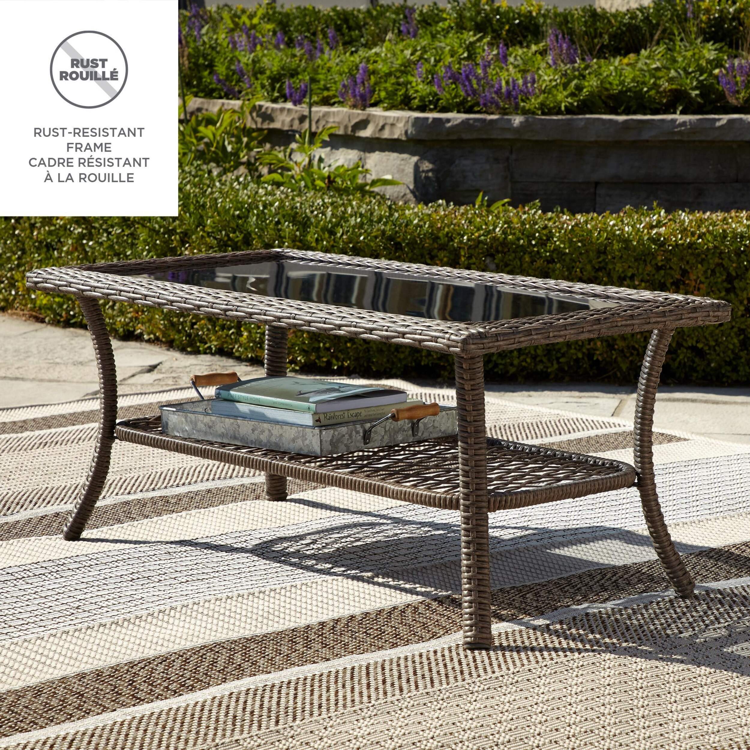 Complétez votre espace extérieur avec une table basse en osier d'extérieur/de jardin CANVAS Canterbury résistant aux intempéries avec dessus en verre. Cette table basse traditionnelle de patio d'aspect osier est dotée d'un cadre en acier au fini peint par électrodéposition résistant à la rouille, de pattes et d'un cadre tressé à la main, d'une tablette de rangement finement ouvragée et d'une surface en verre trempé fumé.