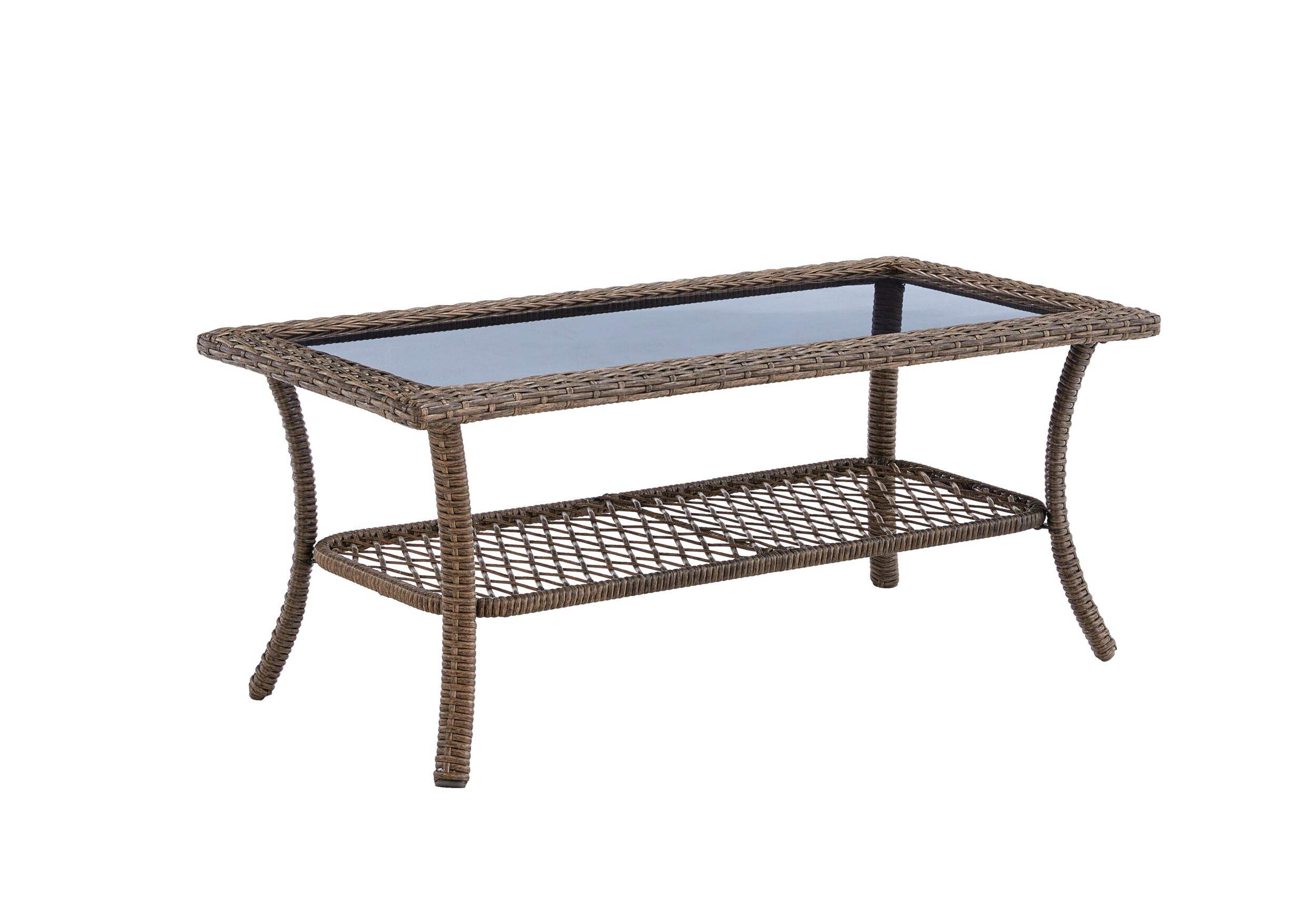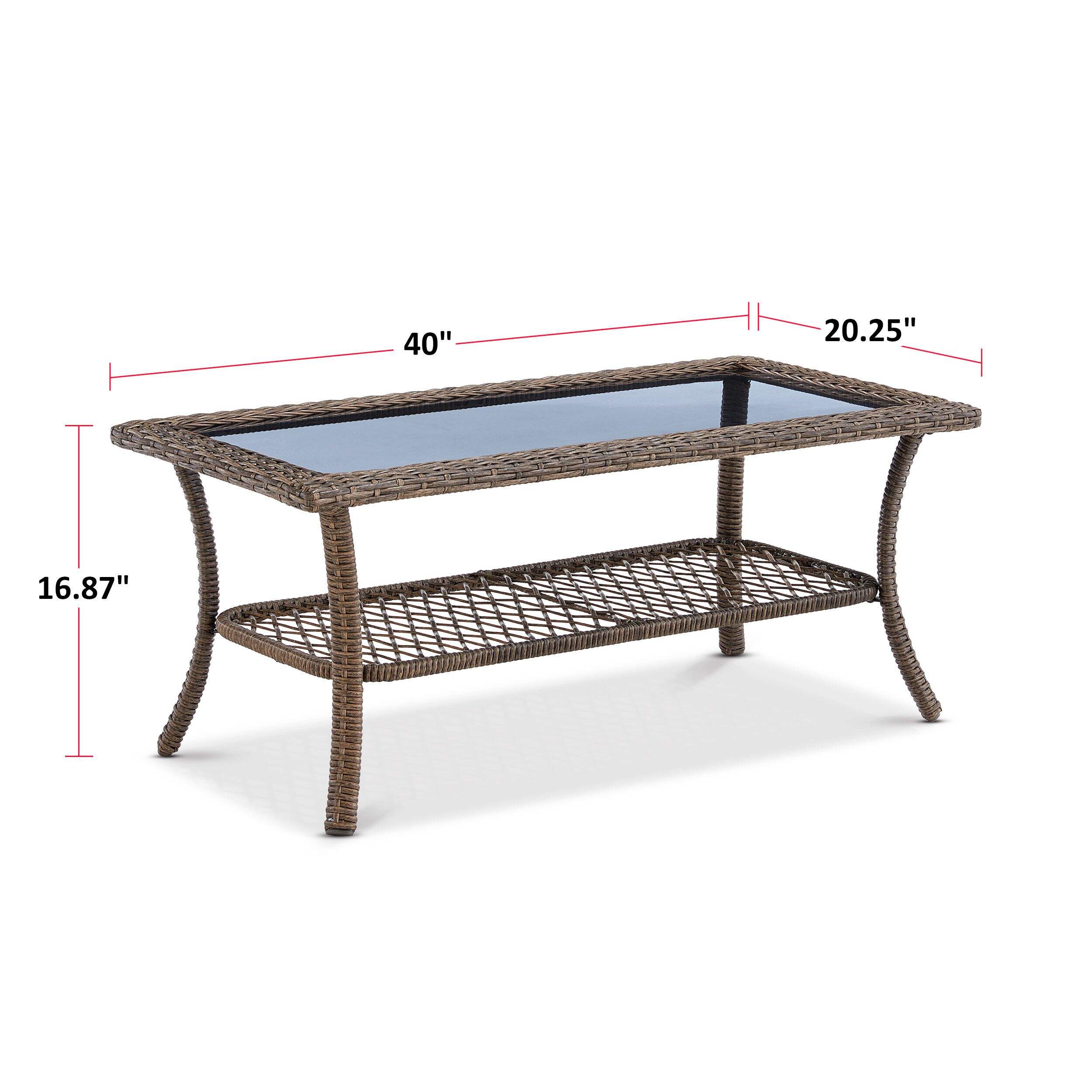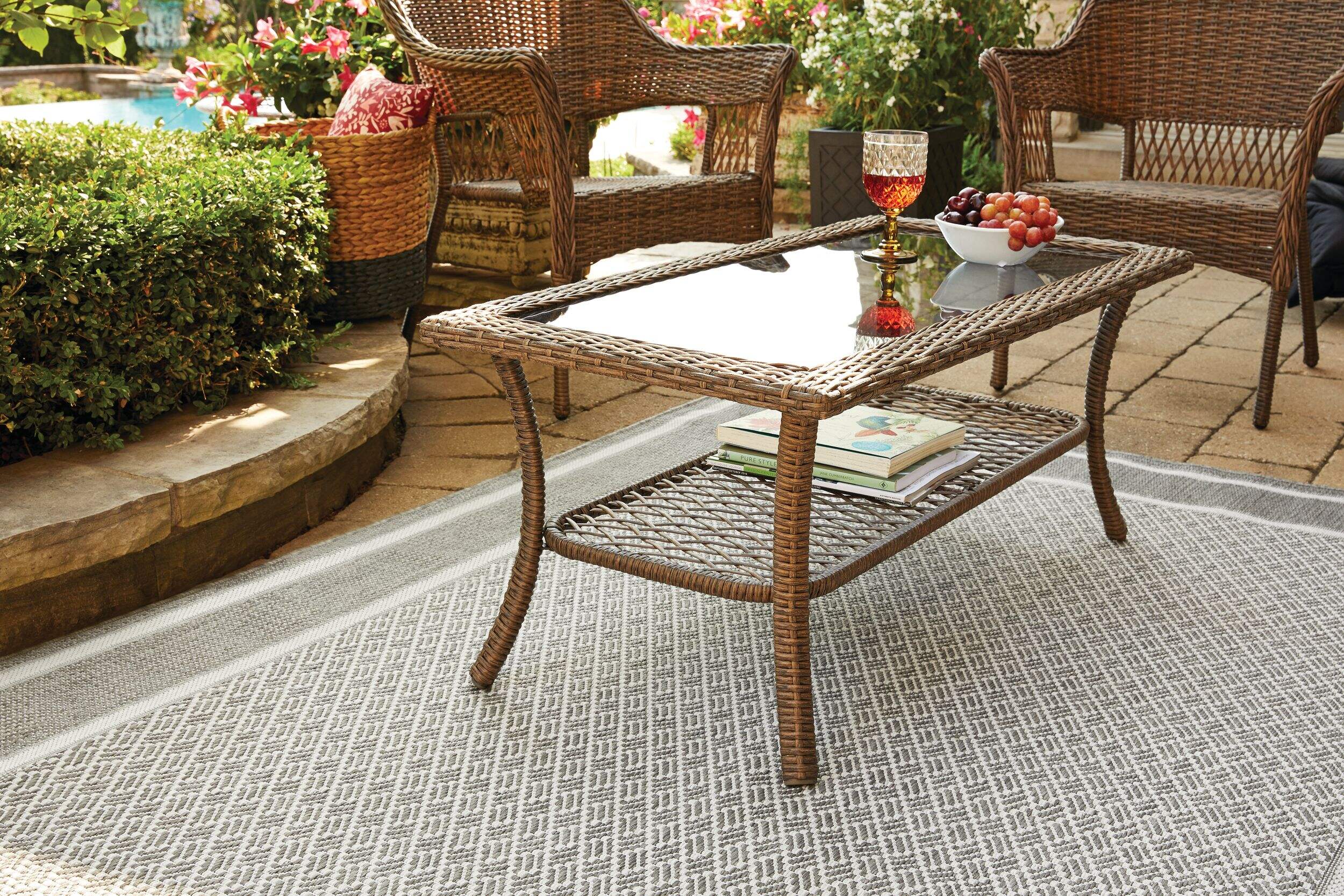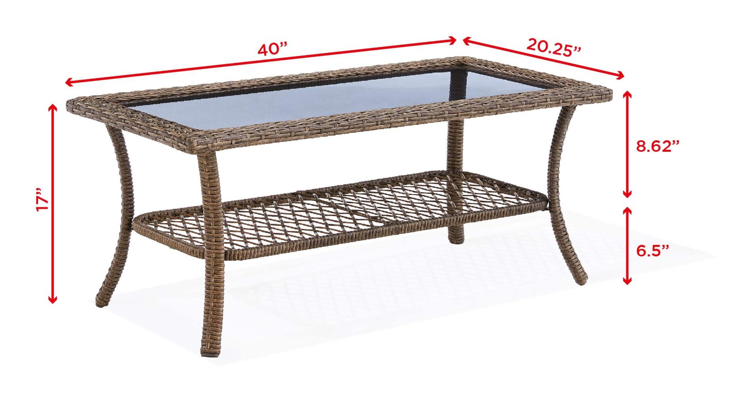 Complétez votre espace extérieur avec une table basse en osier d'extérieur/de jardin CANVAS Canterbury résistant aux intempéries avec dessus en verre. Cette table basse traditionnelle de patio d'aspect osier est dotée d'un cadre en acier au fini peint par électrodéposition résistant à la rouille, de pattes et d'un cadre tressé à la main, d'une tablette de rangement finement ouvragée et d'une surface en verre trempé fumé.