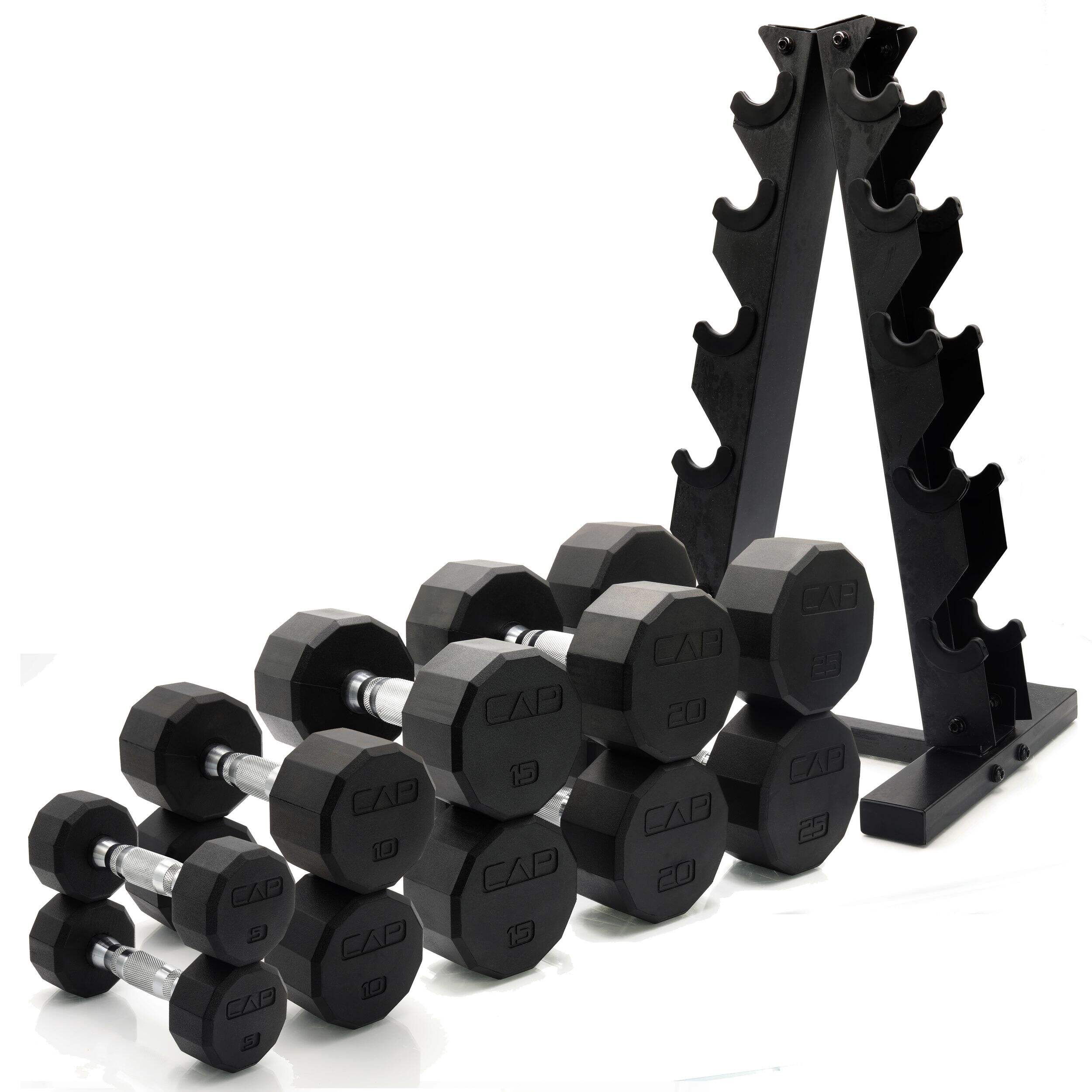 L'ensemble d'haltères hexagonaux en caoutchouc Cap Barbell est idéal pour débuter dans votre salle de sport à domicile. Cet ensemble comprend une variété d'haltères, allant de 5 à 25 lb pour un total de 110 lb, tous avec des poignées confortables pour plus de sécurité et une finition protectrice pour une utilisation longe durée. Le support compact a une forme de cadre en A qui vous permet d'organiser vos poids, tandis que les poids eux-mêmes ont un design hexagonal qui les empêche de rouler lorsqu'ils ne sont pas utilisés.
