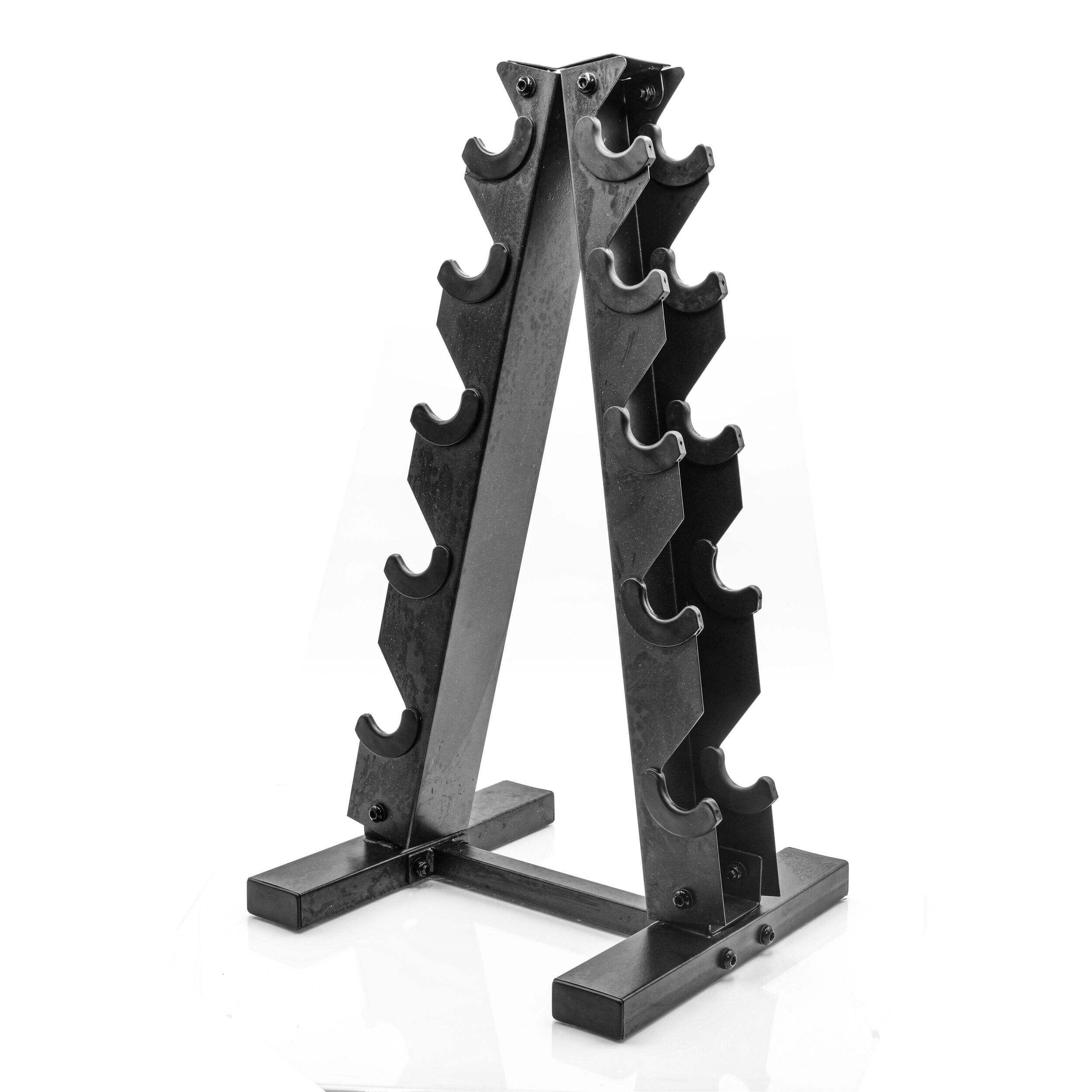 L'ensemble comprend une paire d'haltères en caoutchouc hexagonaux de 5 lb, 10 lb, 15 lb, 20 lb et 25 lb (2,2, 4,5, 6,8, 9 et 11,3 kg) à 12 côtés avec support à haltères en A pour les ranger