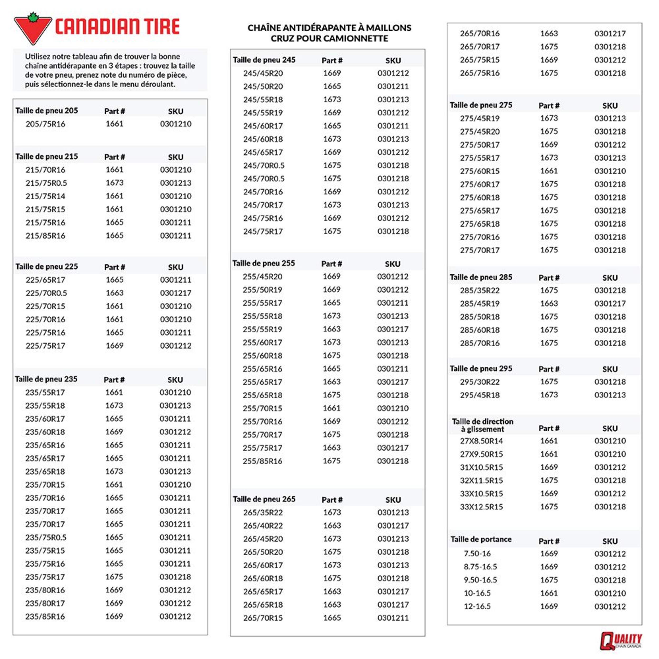 Maintenez l'adhérence de votre véhicule sur les routes glacées ou enneigées avec la chaîne antidérapante Cobra Cruz pour camionnette. Conçues pour les fourgonnettes, les camionnettes et les VUS, ces chaînes antidérapantes offrent une bonne traction vers l'avant et vers l'arrière pour vous aider à conduire en toute sécurité. Les rouleaux en acier à profil bas offrent une meilleure stabilité et réduisent le bruit et les vibrations, tandis que la fabrication robuste et durable aide à assurer une utilisation prolongée. L'installation est simple et peut être réalisée en une quinzaine de minutes.