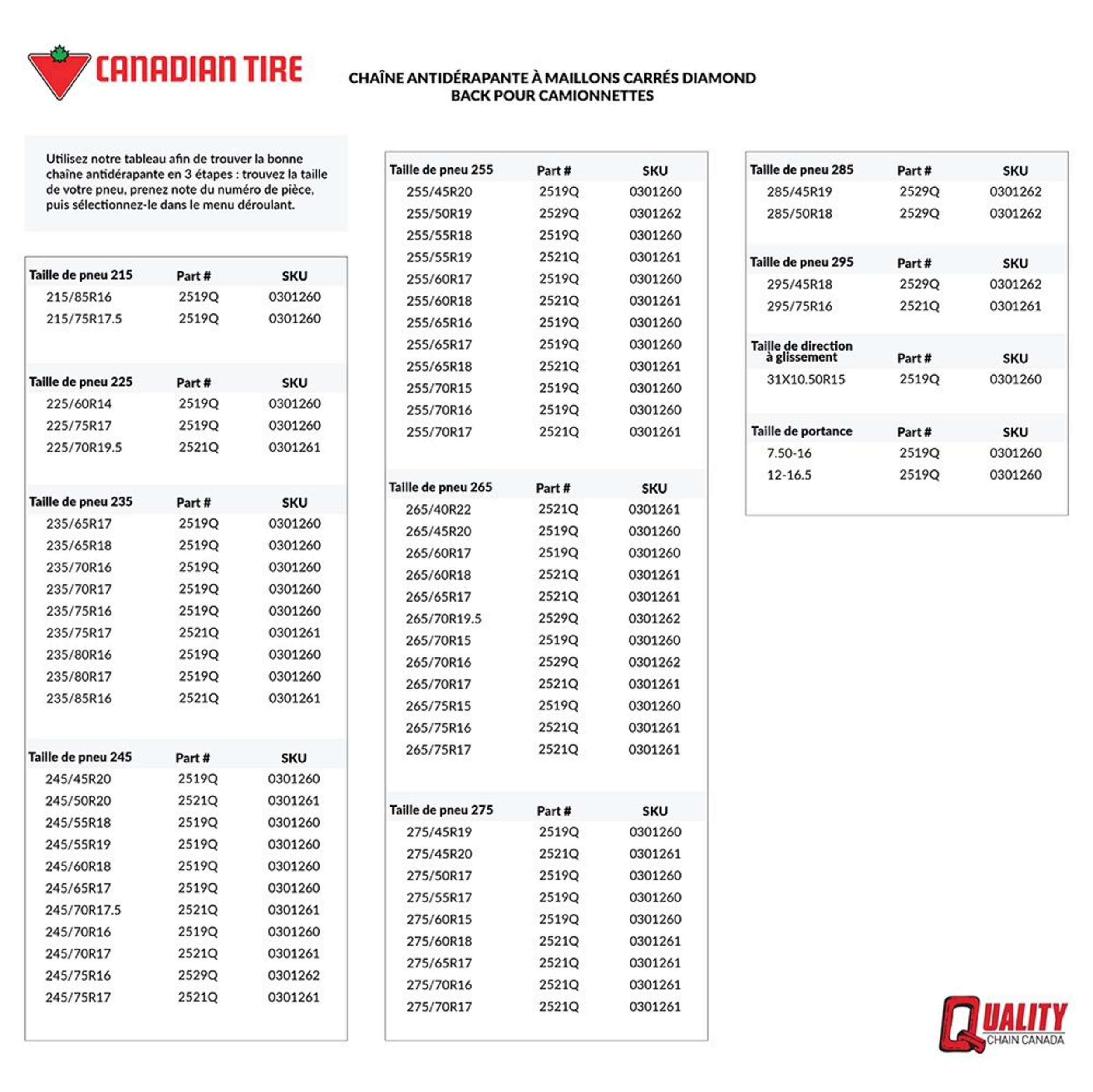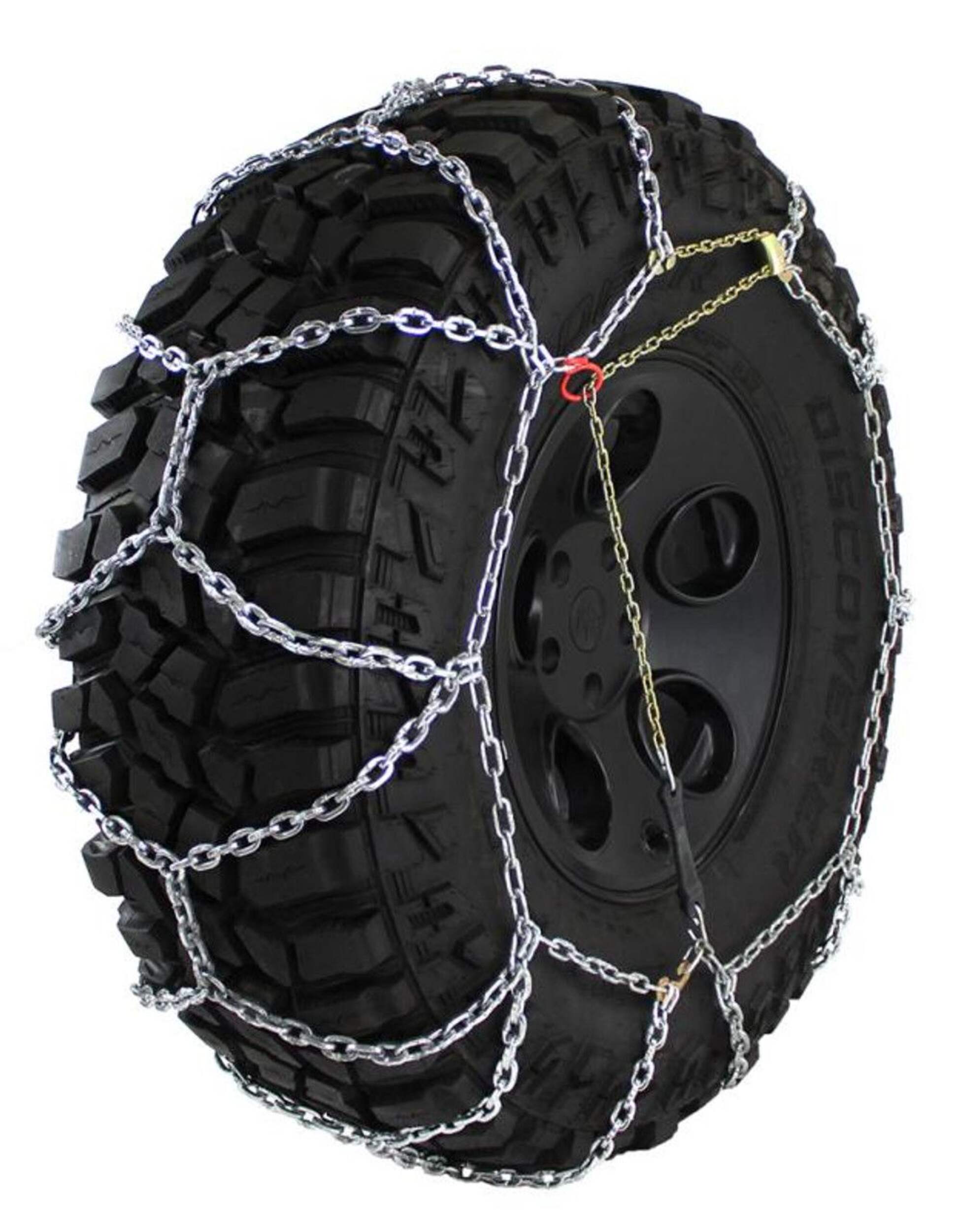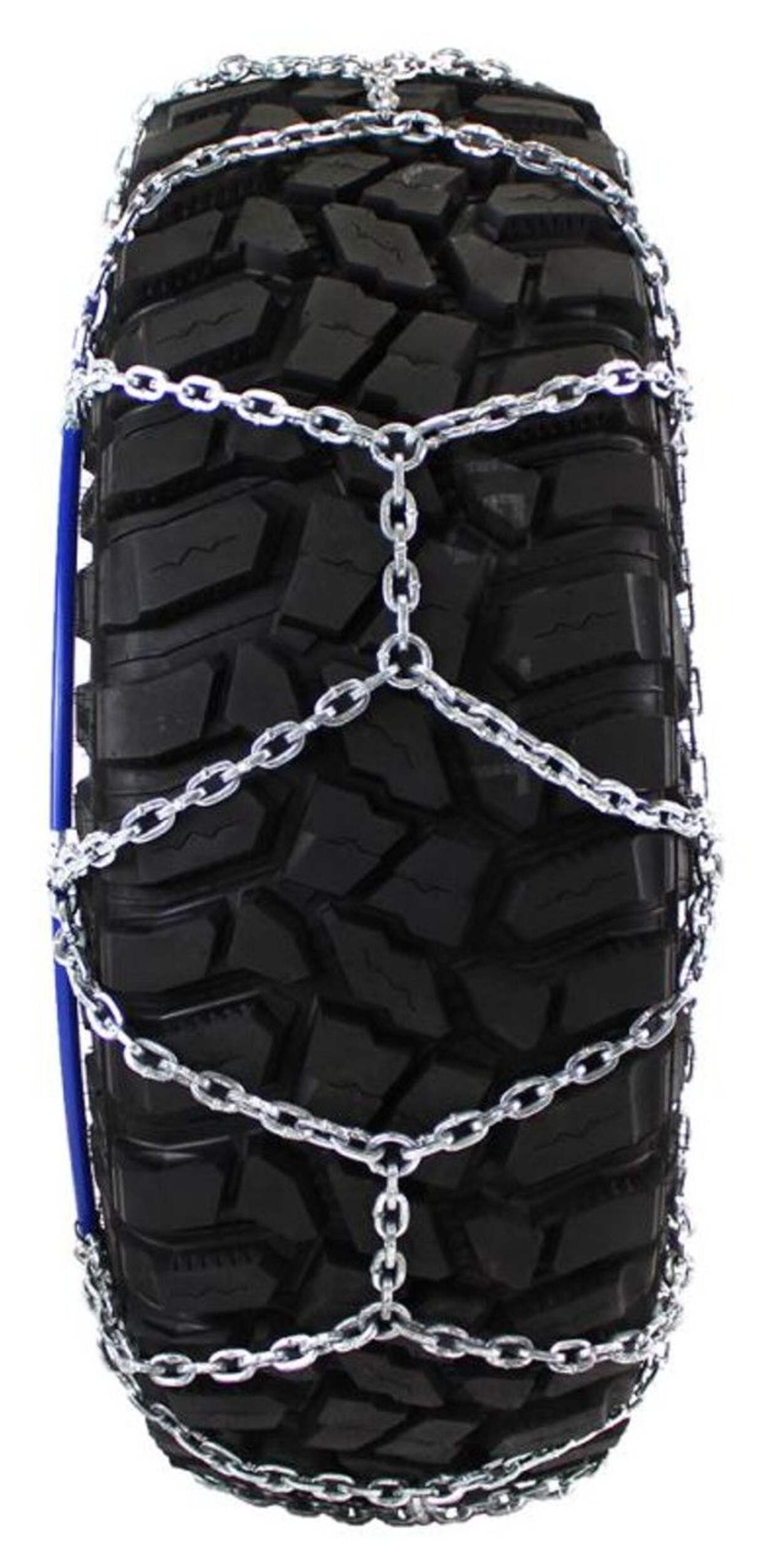 Les chaînes de pneus légères pour camionnette Diamond Back à maillons carrés sont spécialement conçues pour les fourgonnettes, les camionnettes et les VUS. Elles offrent une bonne traction avant, arrière et latérale. Les chaînes sont composées d'une chaîne latérale à câble enduit et d'une chaîne transversale en alliage à maillons carrés de 5,5 mm à motif en losange, conforme à la norme SAE de dégagement de classe U. La chaîne en alliage est robuste et durable, et l'installation est simple, prenant généralement entre 10 et 15 minutes. Le produit nécessite un tendeur araignée et comprend deux chaînes par paquet. Veuillez consulter le tableau des dimensions dans la section Renseignements supplémentaires pour déterminer l'ajustement idéal à votre taille de pneu.