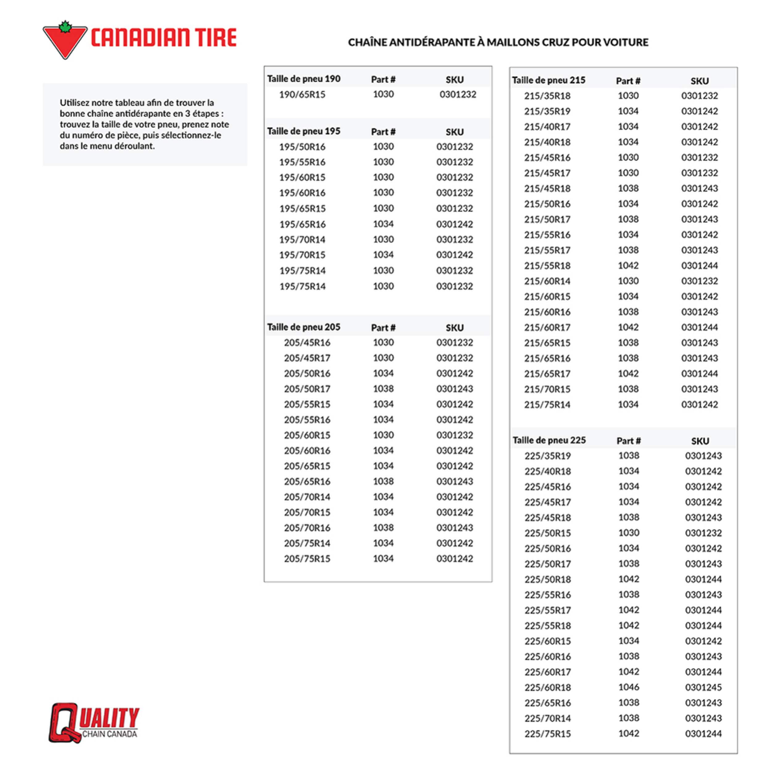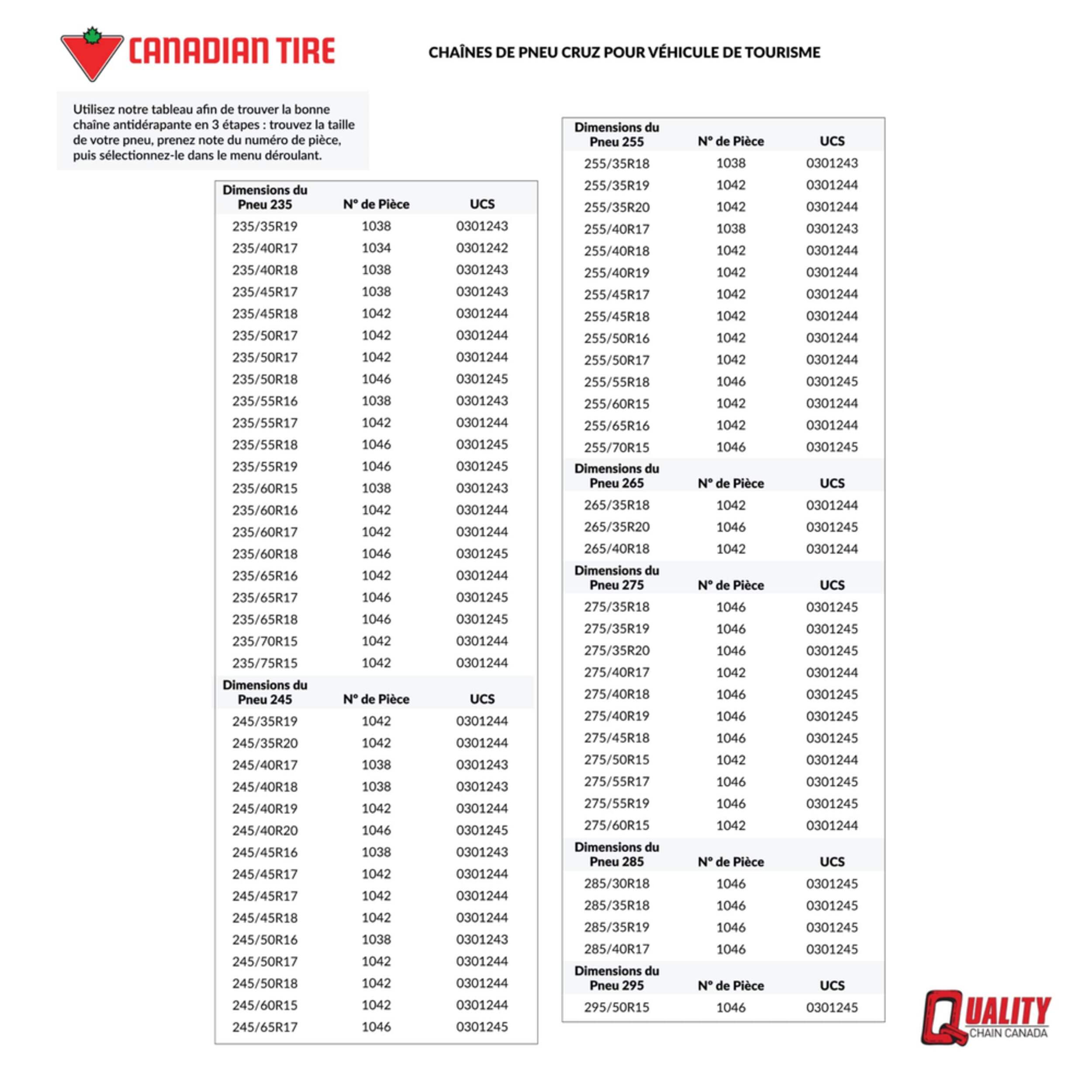 Les chaînes de pneu Cruz pour véhicule de tourisme sont composées d'une chaîne transversale à câble avec des rouleaux en acier au carbone de 8,3 mm, couplée à une chaîne latérale à câble, idéale pour les véhicules à dégagement limité. Elles répondent aux exigences SAE de dégagement de la catégorie S et sont conçues pour les véhicules de tourisme. Les chaînes à pneus assurent une bonne traction vers l'avant et vers l'arrière, ce qui facilite les déplacements. L'installation est simple et peut être réalisée en 10 à 15 minutes. Chaque paquet comprend 2 chaînes. Pour trouver la chaîne adaptée à la taille de vos pneus, veuillez consulter le tableau des dimensions dans la section Renseignements supplémentaires.