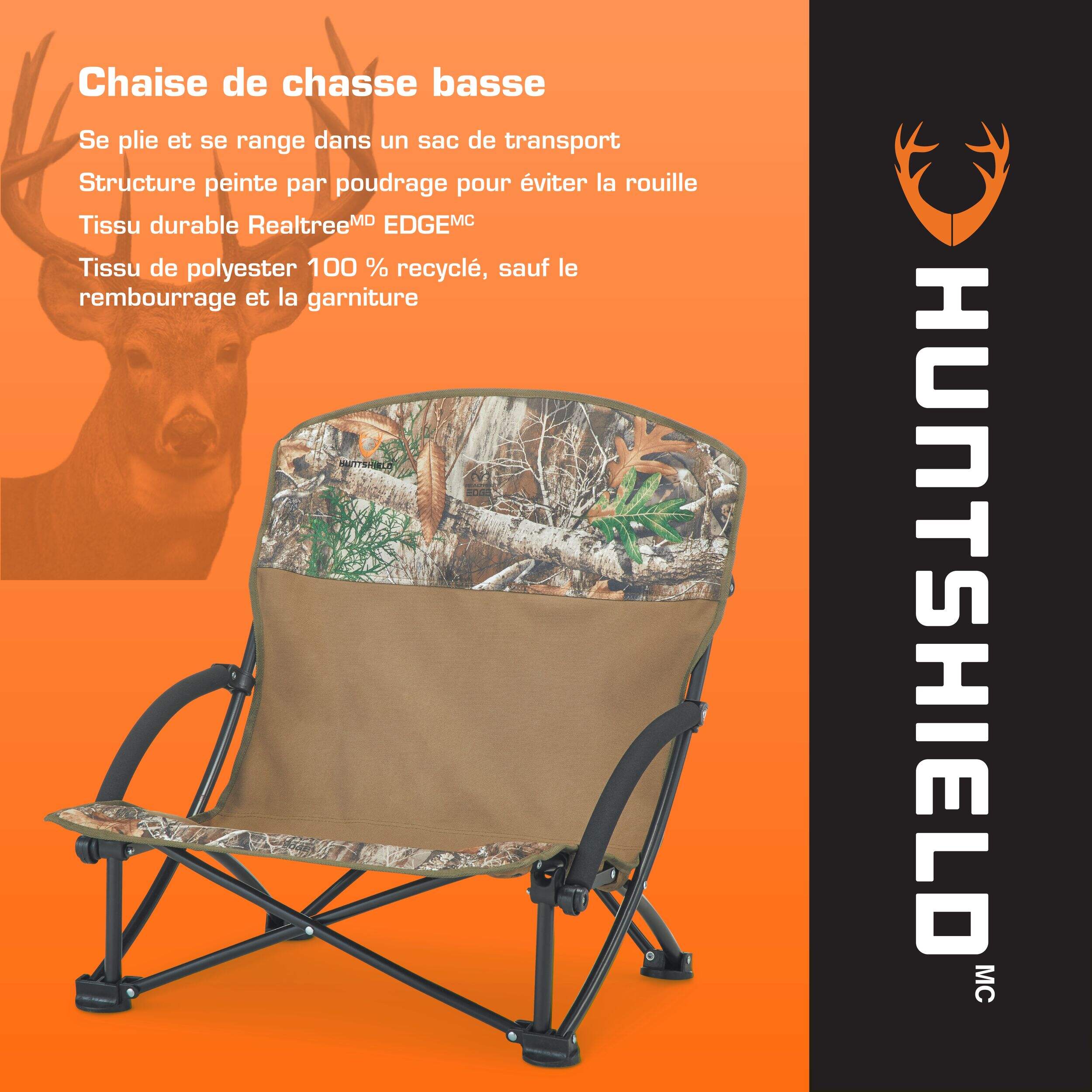Détendez-vous dans le fauteuil de chasse bas Huntshield RealTree. Cette chaise de camping est dotée d'un large dossier contre lequel vous pouvez vous appuyer, et est idéale pour se détendre sur la plage, près du lac, devant le feu de camp et plus encore. Elle est dotée d'un cadre en acier robuste et léger, recouvert de polyester durable conçu pour une utilisation à l'extérieur. De plus, elle se replie facilement dans un sac de transport, ce qui vous permet de la glisser facilement dans votre coffre ou votre sac à bandoulière pour votre prochaine aventure.