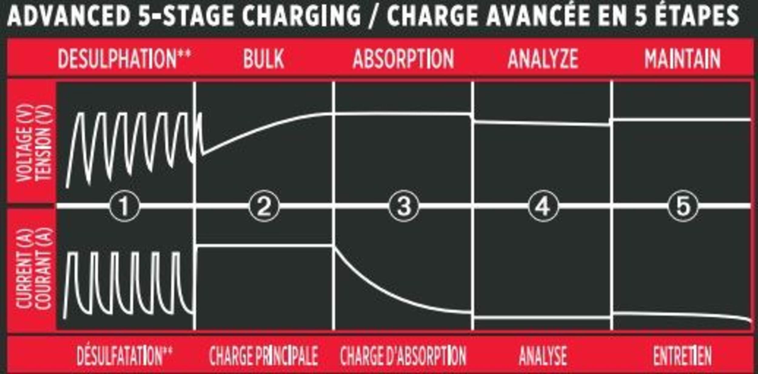 Processus de recharge entièrement automatique à 5 étapes contrôlé par un microprocesseur assurant une charge sécuritaire, rapide et complète