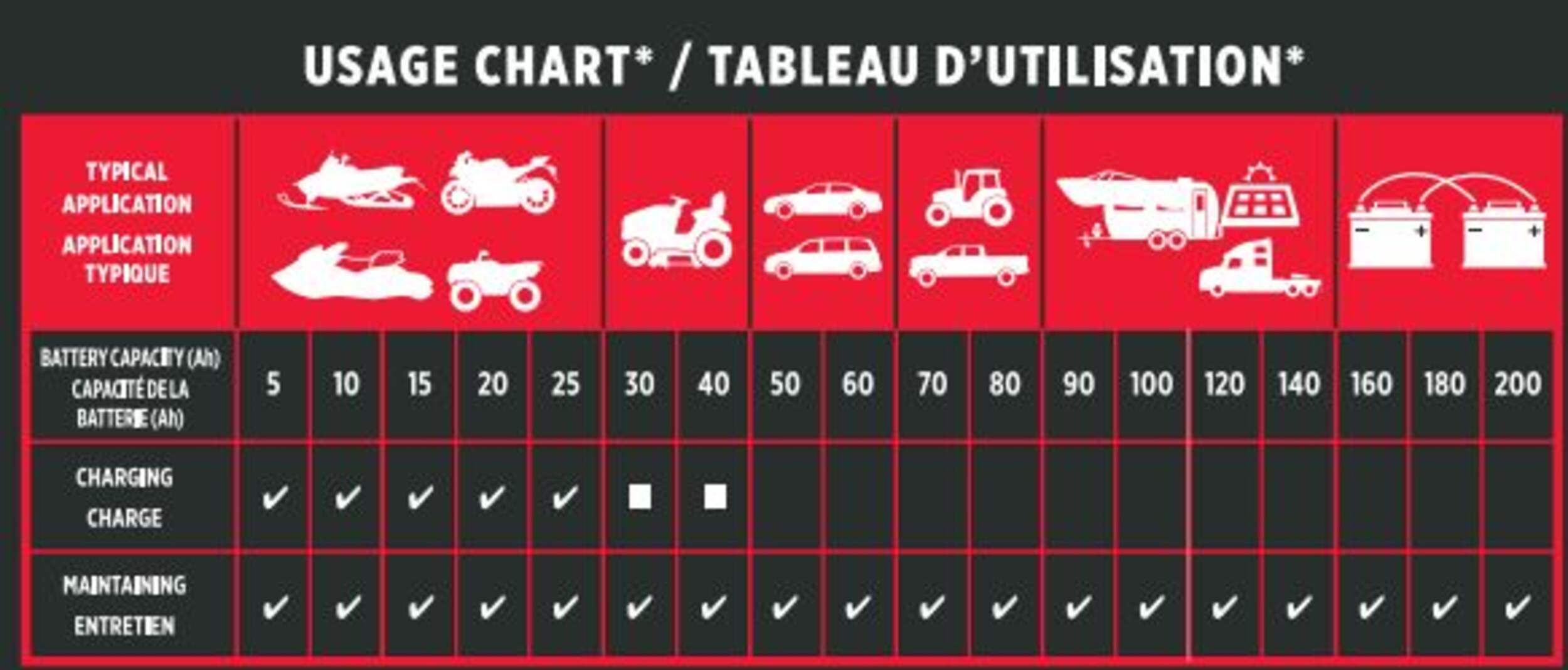 Convient à toutes les batteries plomb-acide de 12 volts, y compris les batteries à électrolyte liquide, sans entretien, AGM et à électrolyte gélifié