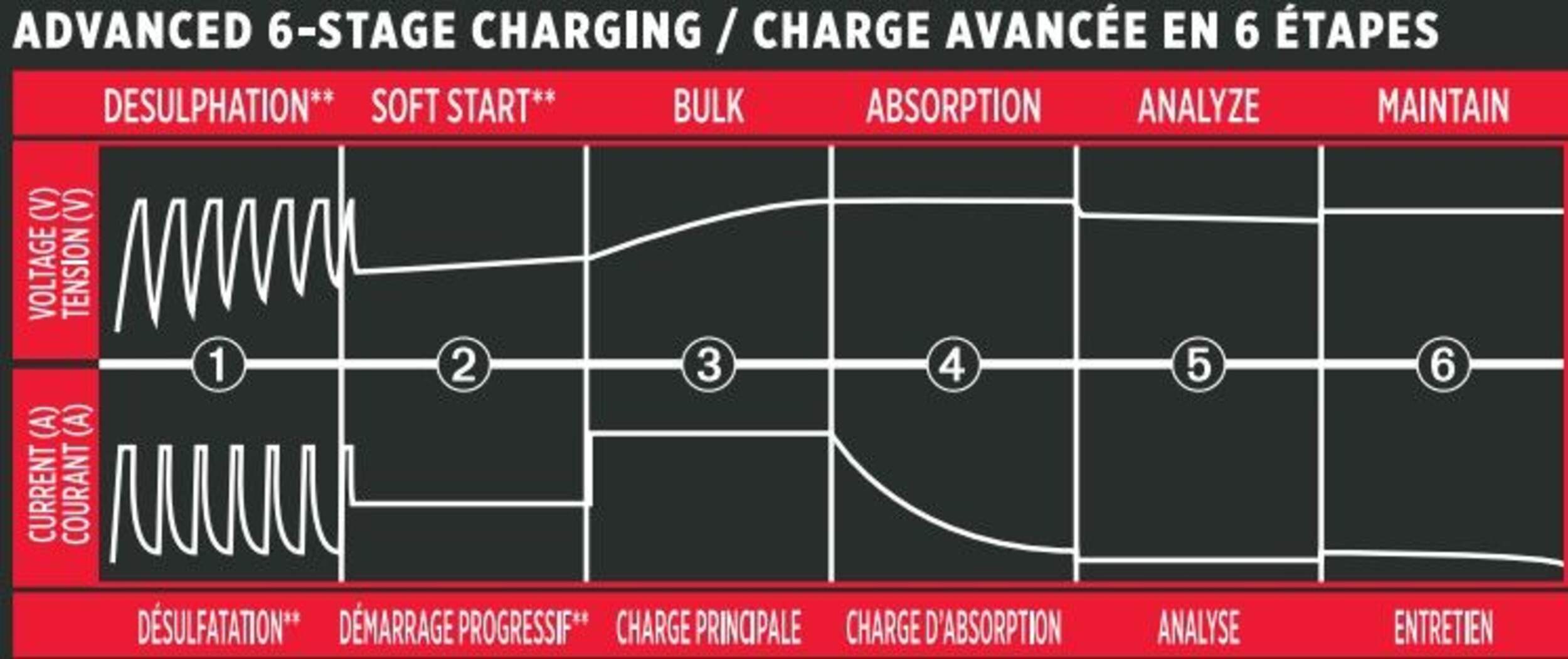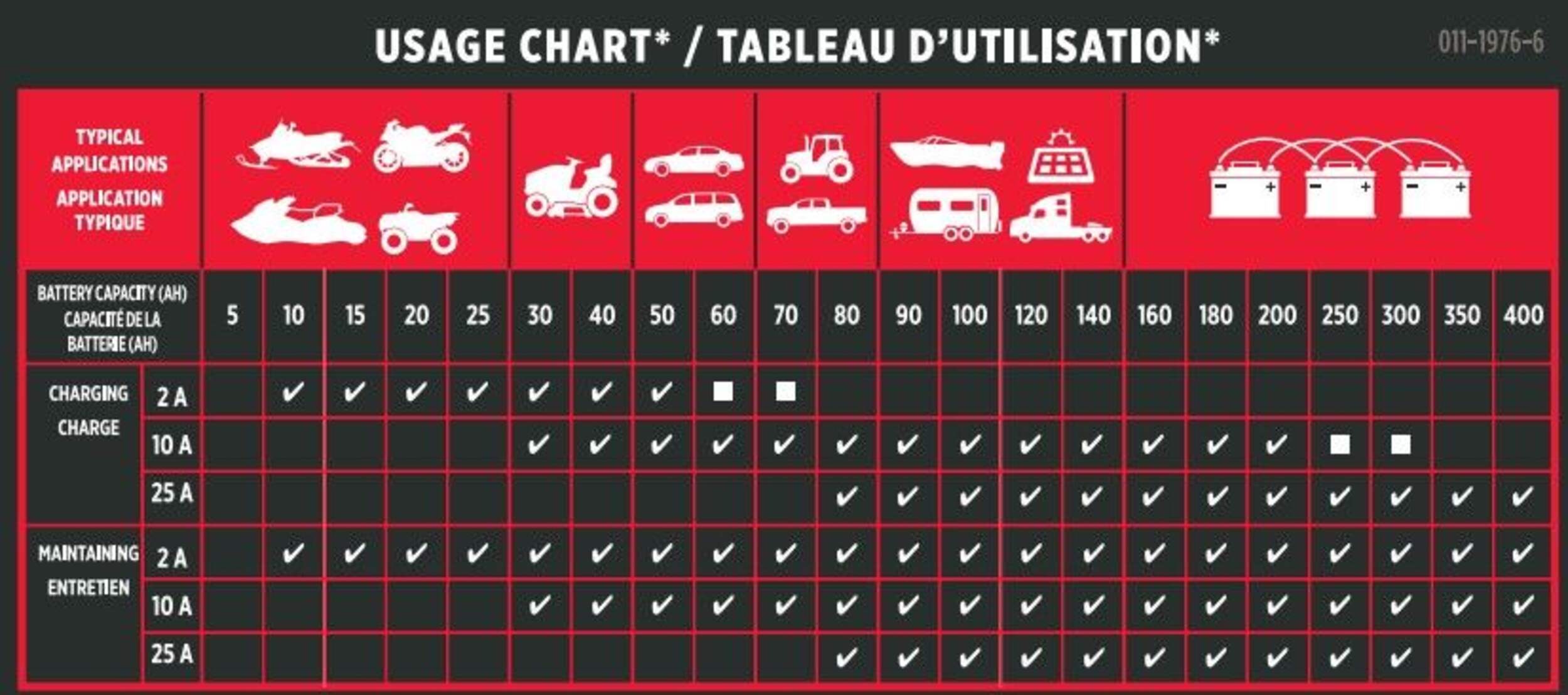 Choix de charge à 2, 10 et 25 A vous permettant de charger lentement ou rapidement pratiquement n'importe quelle dimension de batterie au plomb-acide de 12 V de 10 à 400 Ah