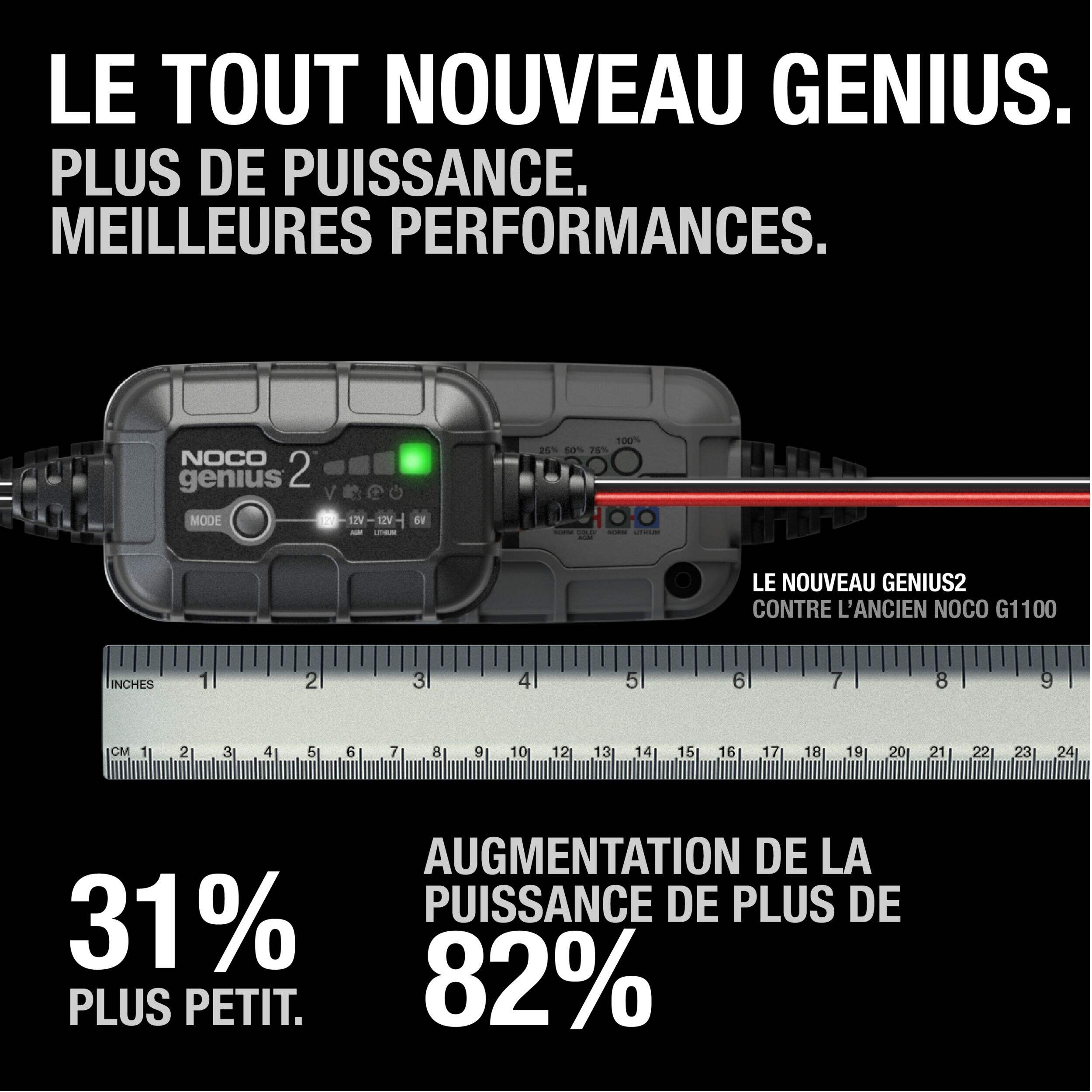 Le chargeur, dispositif d'entretien et désulfateur de batterie intelligent NOCO GENIUS2 est un chargeur compact, polyvalent et puissant de 2 A conçu pour les batteries de 6 V et de 12 V. Il s'ajuste automatiquement pour maintenir et recharger votre batterie, assurant ainsi un rendement optimal et une longévité optimale. La technologie avancée de désulfatation aide à récupérer les batteries avec une capacité réduite en raison de la sulfatation, tandis que le processus de chargement à plusieurs étapes assure une alimentation sécuritaire et efficace.