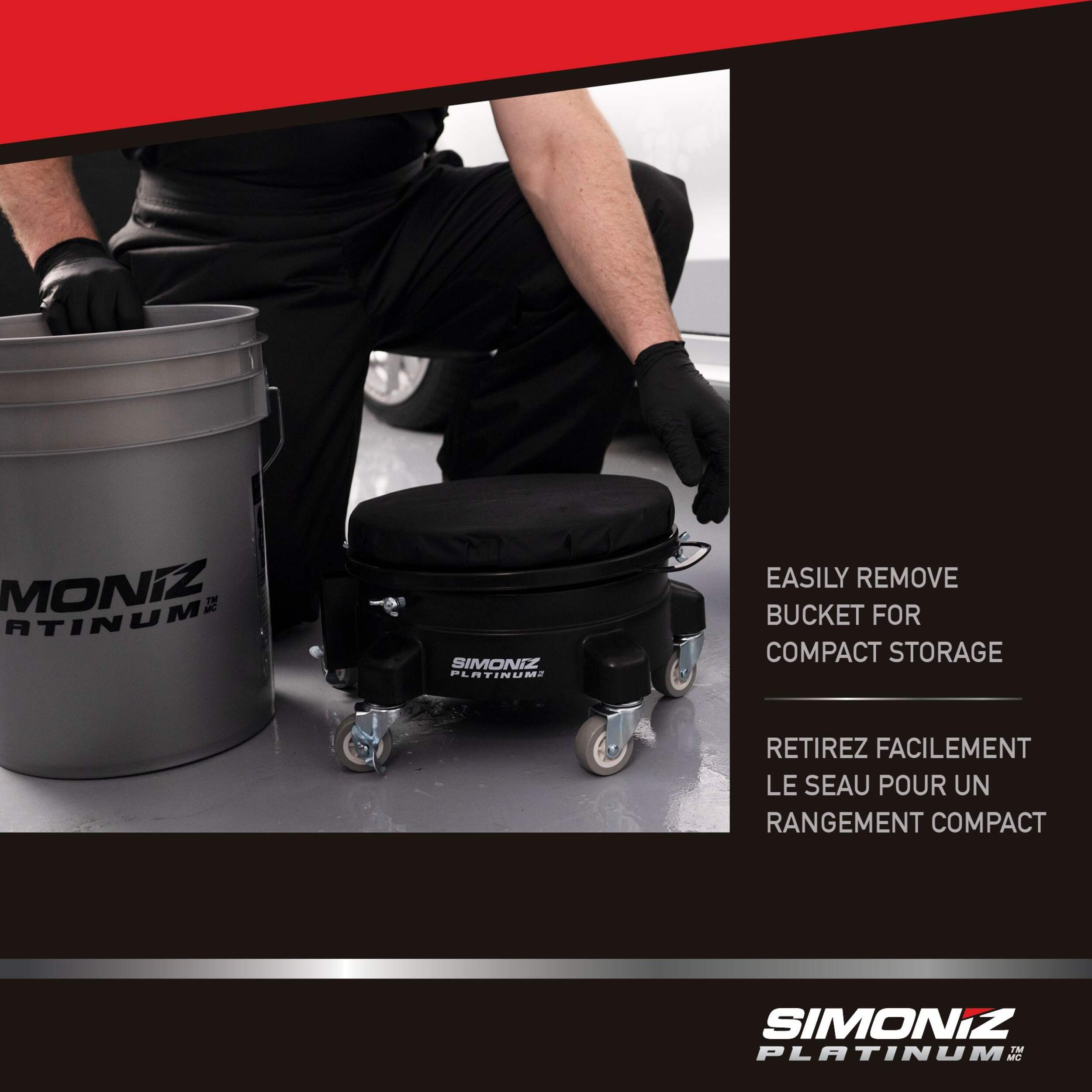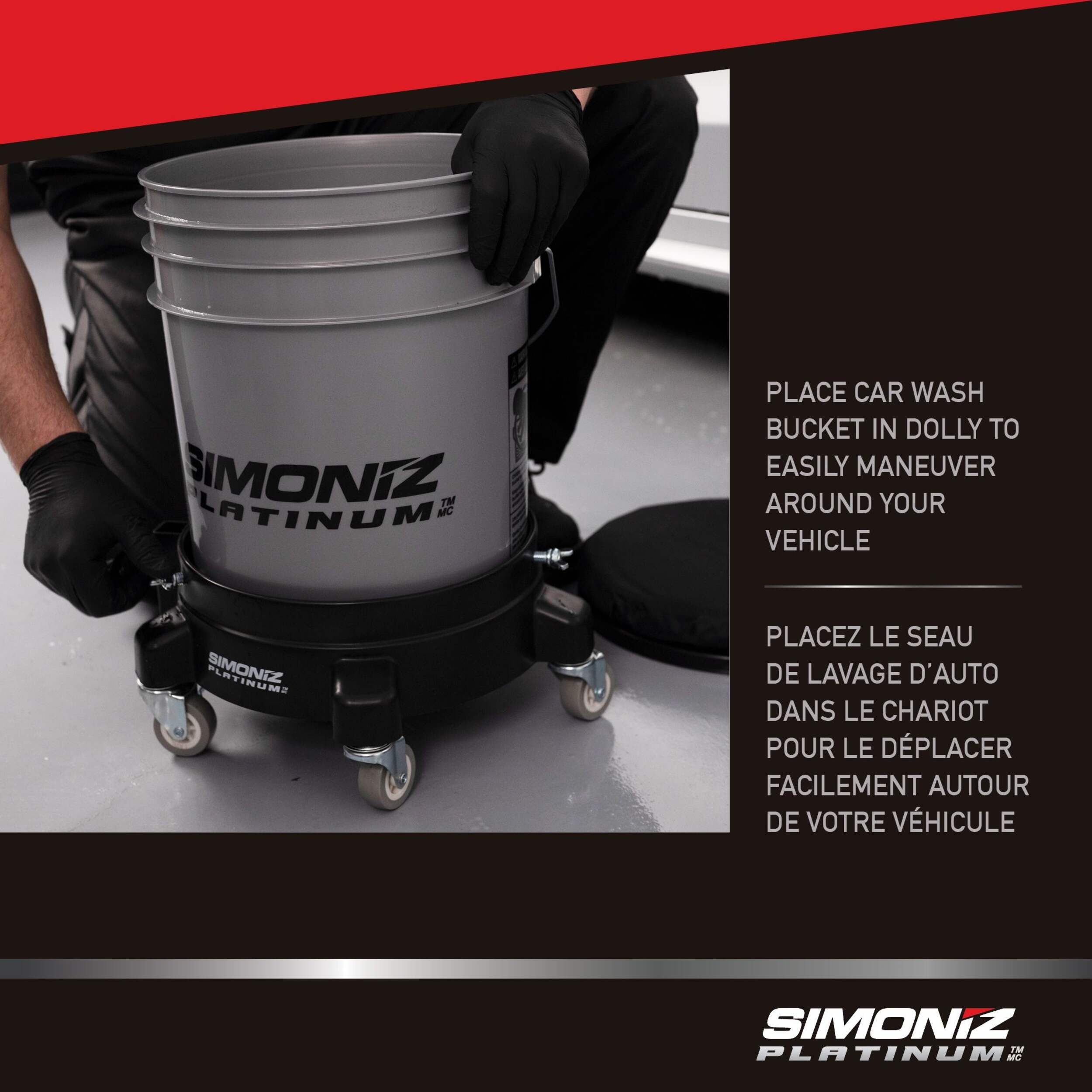 Le chariot et le siège pour seau de lavage Platinum de SIMONIZ combinent deux fonctions qui vous permettent de manœuvrer facilement les seaux de lavage lourds pour une commodité maximale. Le chariot SIMONIZ est doté de roulettes durables qui glissent facilement sur la plupart des surfaces et se verrouillent même lorsque vous en avez besoin. Le seau est facile à séparer de l’appareil sur chariot lorsque vous devez les ranger, puis il se range en toute sécurité lorsque vous êtes prêt à laver votre voiture.