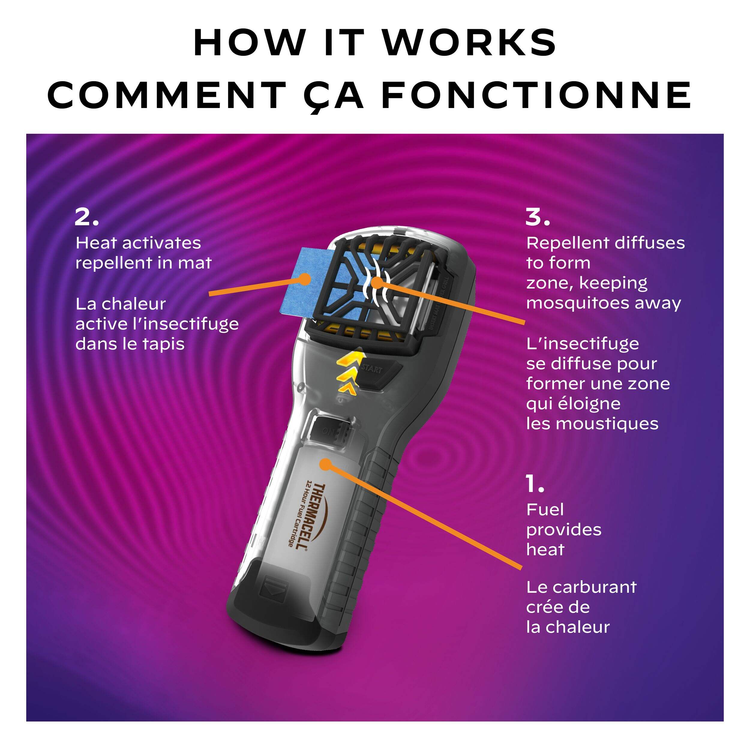 Conçu pour vous accompagner lors de toutes vos aventures en plein air, les chasse-moustiques portatifs MR300 et MR450 de Thermacell sont faciles à utiliser et offrent des heures de protection sans parfum et sans dégâts jusqu'à 4,5 m (15 pi) par répulsif. Demeurez protégé grâce à notre ensemble étui et agrafe de ceinture qui vous offre un espace de rangement supplémentaire, idéal pour les chasseurs, de l'abri forestier à l'affût pour chasse au canard, ainsi que pour les autres aventures sans fin, dont la pêche, le camping, la randonnée pédestre, et plus encore. Comprend un étui et une agrafe de ceinture.