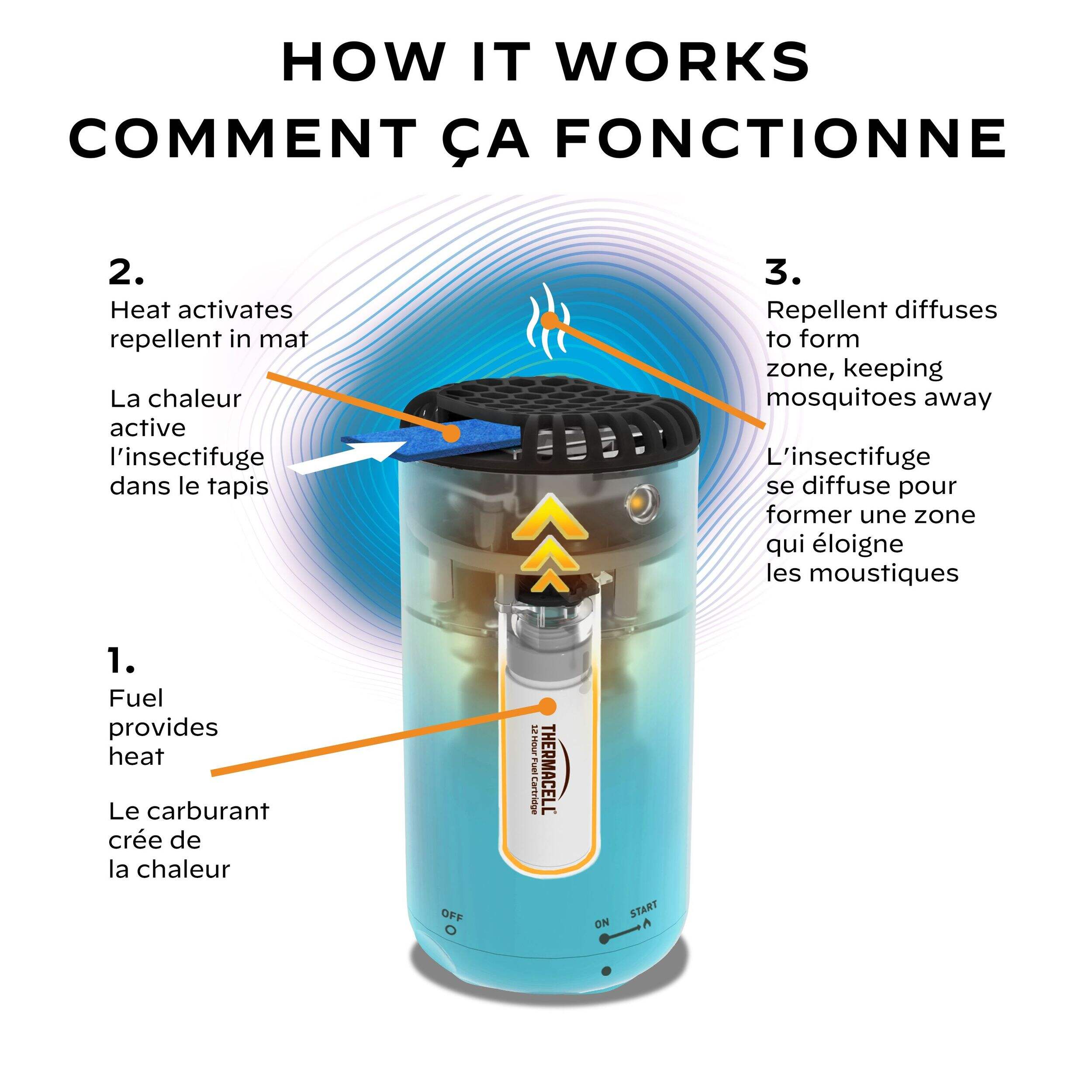 Les moustiques ruinent tout. La technologie primée de Thermacell éloigne les moustiques en créant une zone de protection de 4,5 m (15 pi) autour de vous. Notre formule exclusive cible précisément les moyens de détection qu'utilisent les moustiques, les faisant fuir. Avec une défense constante qui ne s'affaiblit pas avec le temps, Thermacell vous aide à profiter pleinement de la vie extérieure sans avoir recours à des vaporisateurs d'insectes ou à des lotions sur votre peau. Alimenté par une cartouche de carburant de 12 heures compacte et sécuritaire. Comprend une recharge de chasse-moustiques pour 12 heures.