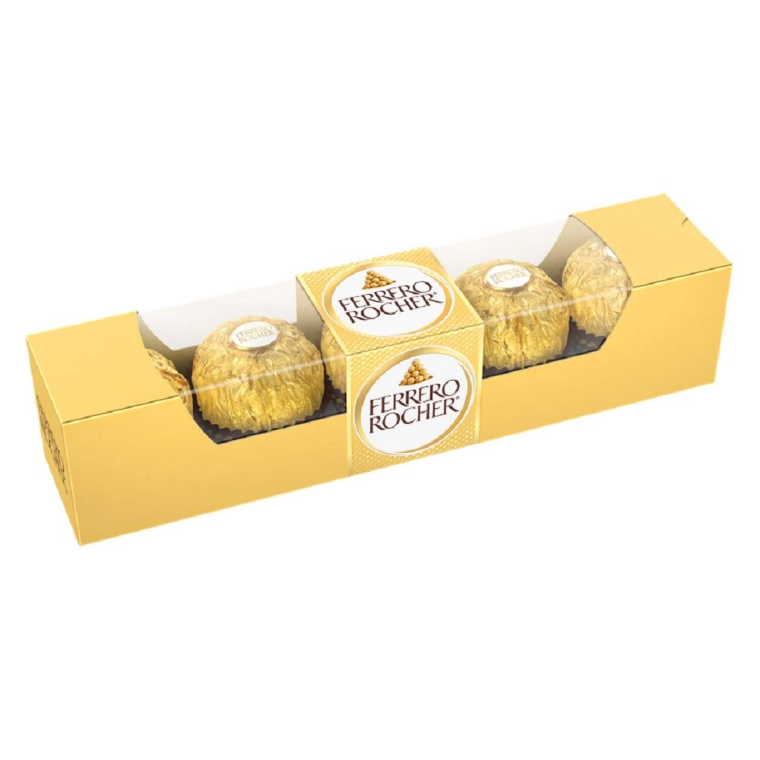 Chocolats Ferrero Rocher à noisette parfaitement grillée au centre avec une gaufrette croustillante enrobée de chocolat et de noisettes hachées finement
