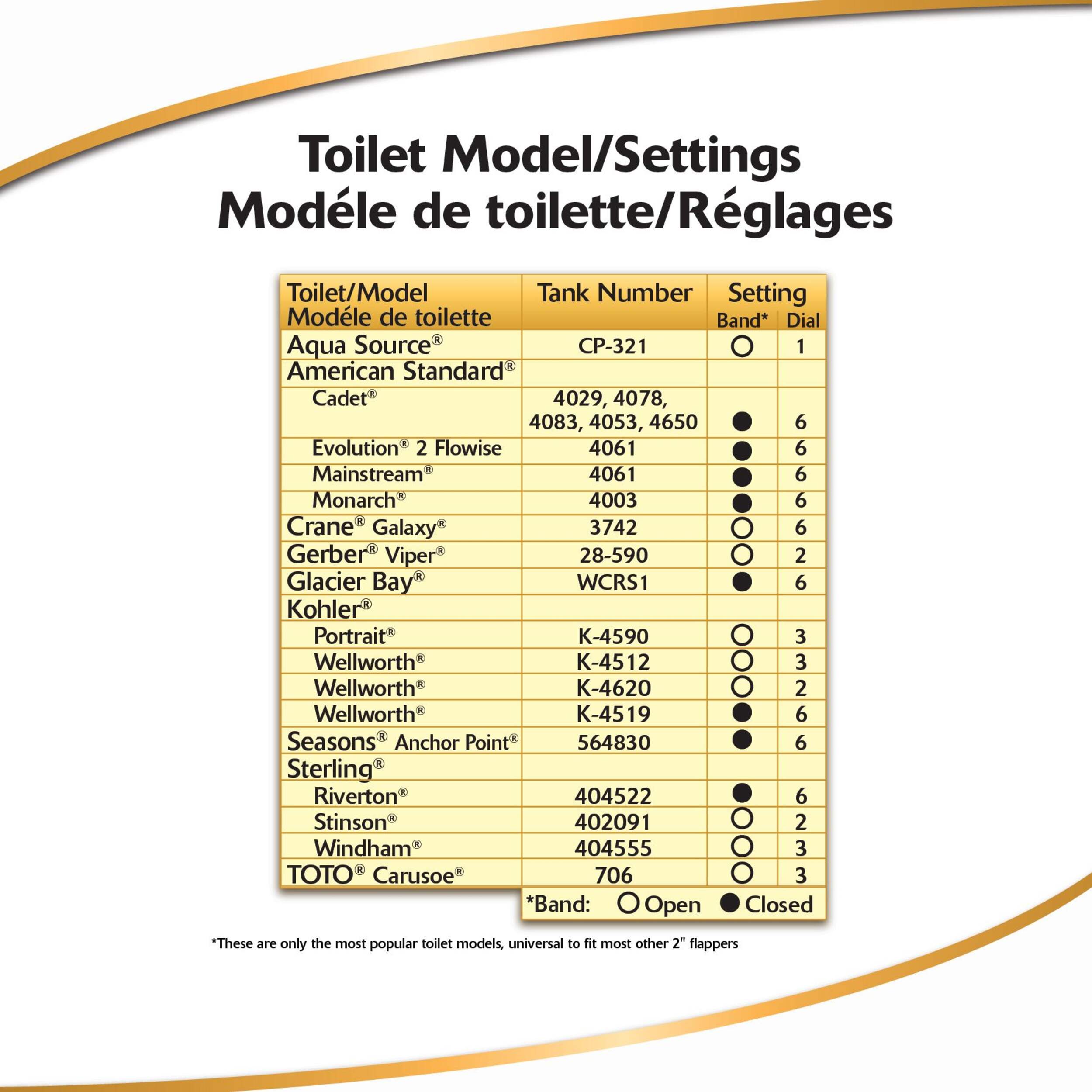 Résiste au chlore, aux bactéries, au traitement de l'eau urbaine, à l'eau dure et à l'eau de puits; le clapet s'ajuste aux réglages de la toilette d'origine