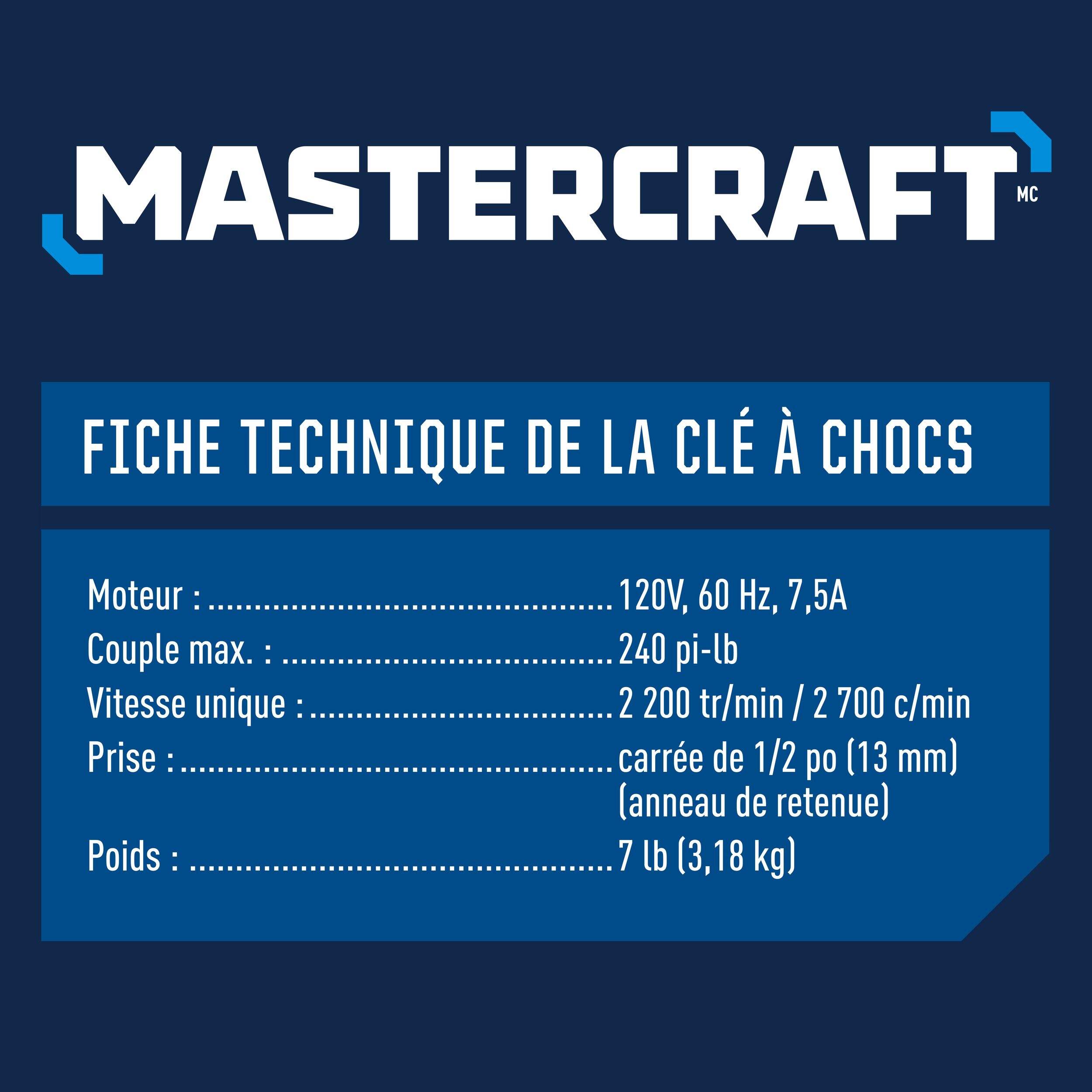 La clé à chocs à 1 vitesse avec fil de 7,5 A Mastercraft avec bague de friction et boîtier d'engrenage en métal est conçue pour offrir des performances élevées, ce qui en fait un outil indispensable à toute boîte à outils. Son interrupteur à bascule de marche avant et arrière permet de l'utiliser facilement d'une seule main. Avec un poids de seulement 7 lb, le boîtier d'engrenage en aluminium durable offre une robustesse exceptionnelle sans poids supplémentaire, ce qui le rend idéal pour les réparations automobiles, les projets de construction et les applications industrielles.