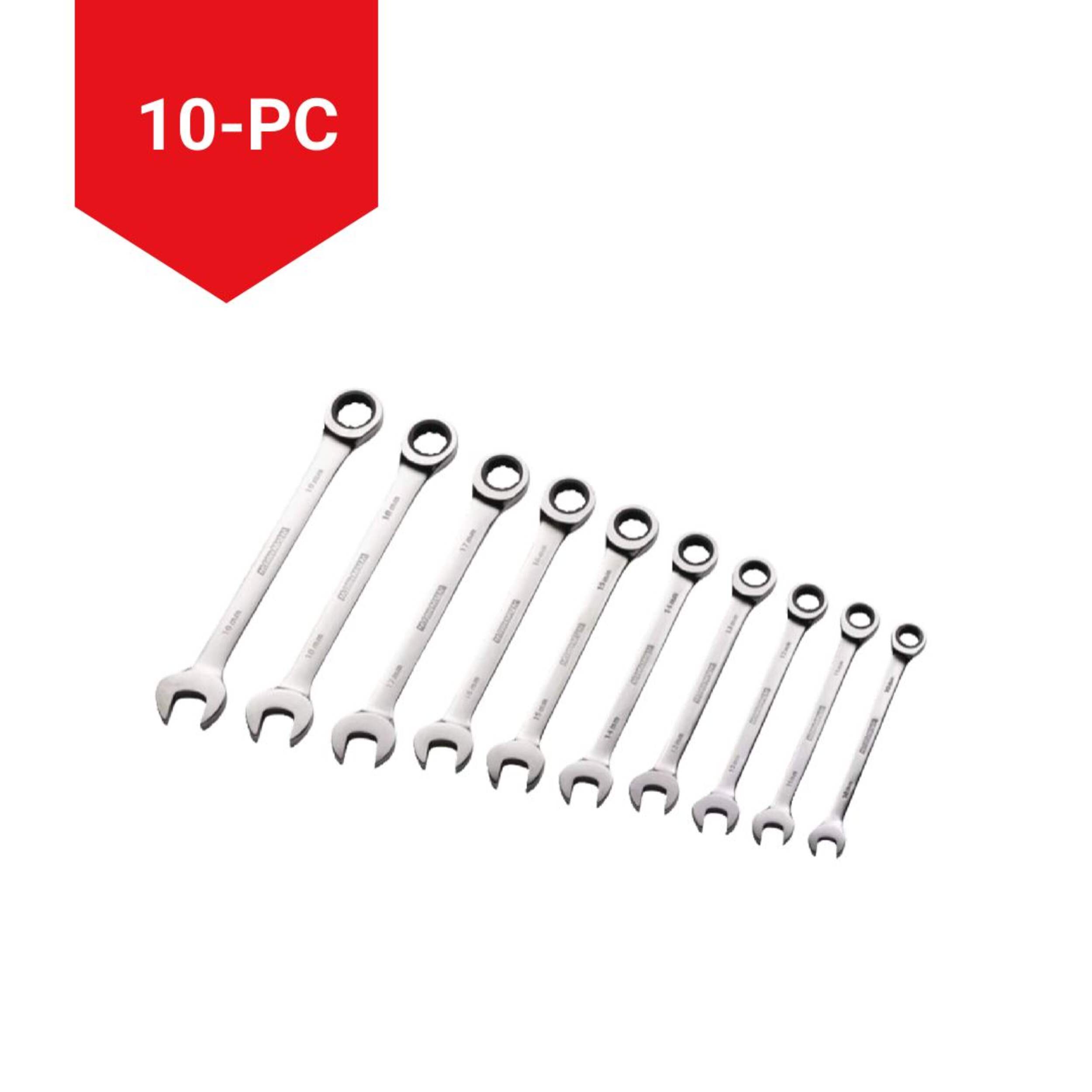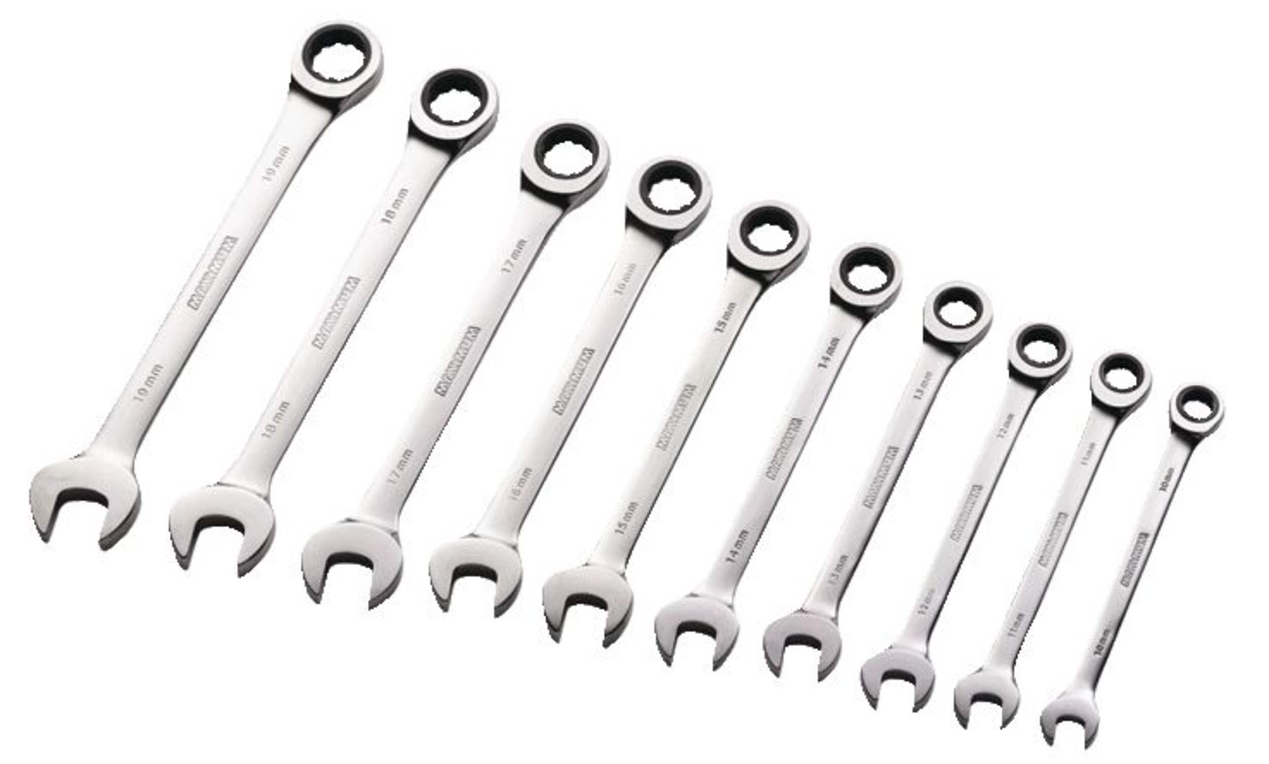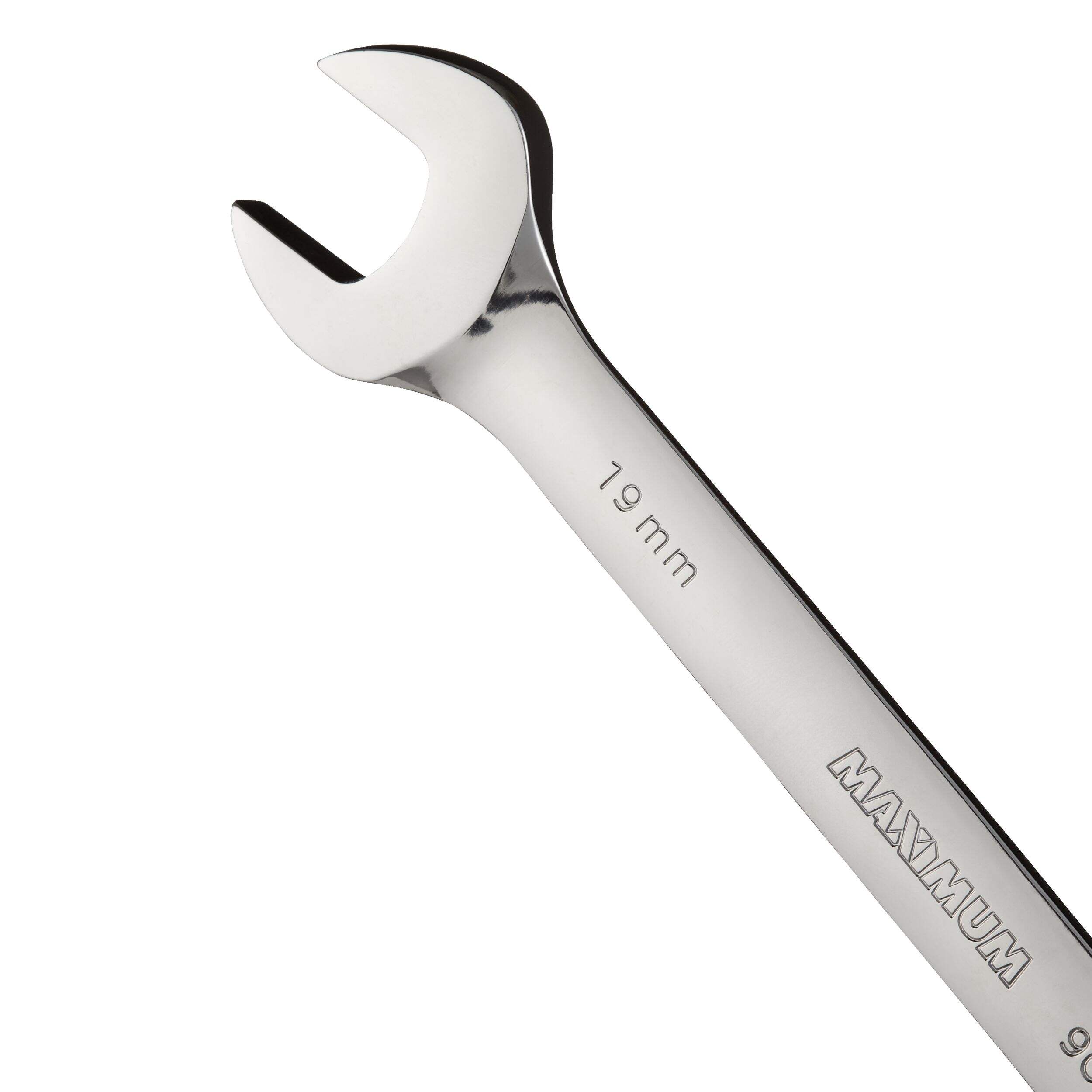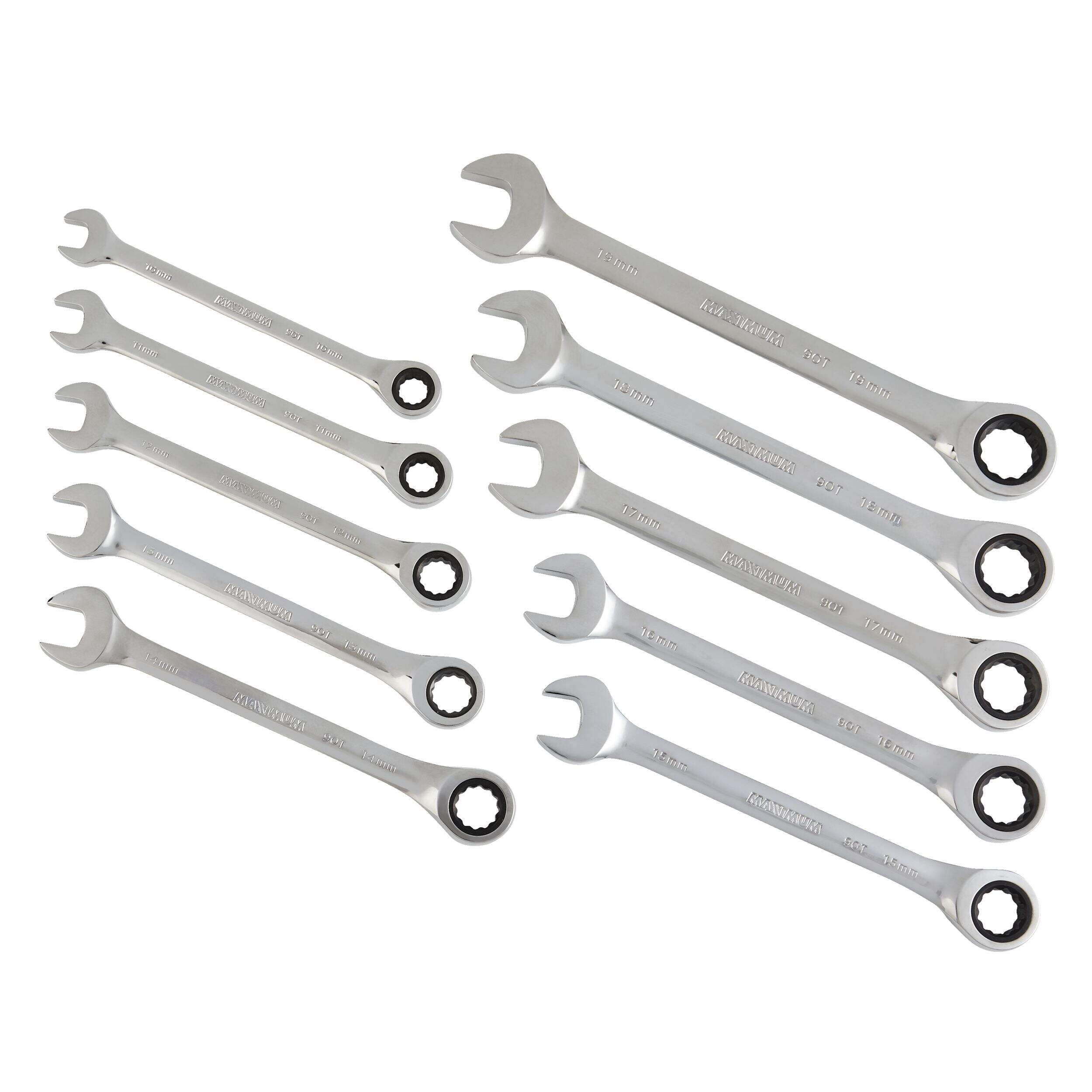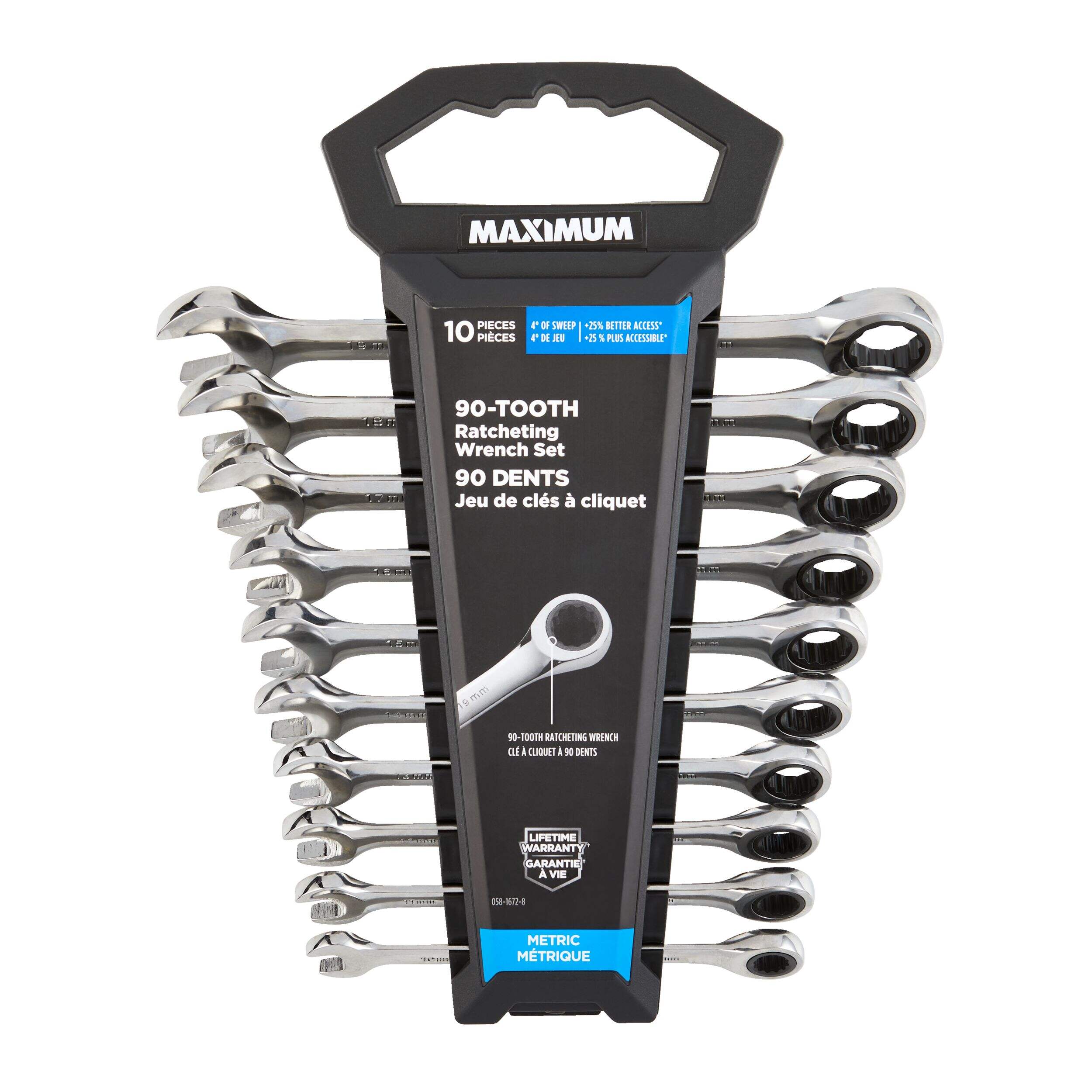 Clés à cliquet MAXIMUM à 90 dents comprenant 10 clés métriques à cliquet Chacune de ces 10 clés métriques est résistante à la rouille et dotée d'une fabrication très robuste en acier chromé avec un fini en plaquage chrome et nickel pour plus de solidité, ce qui convient à une large gamme d'utilisations. Ces clés à cliquet Maximum offrent aussi des têtes ouvertes chanfreinées et comprennent une garantie à vie.