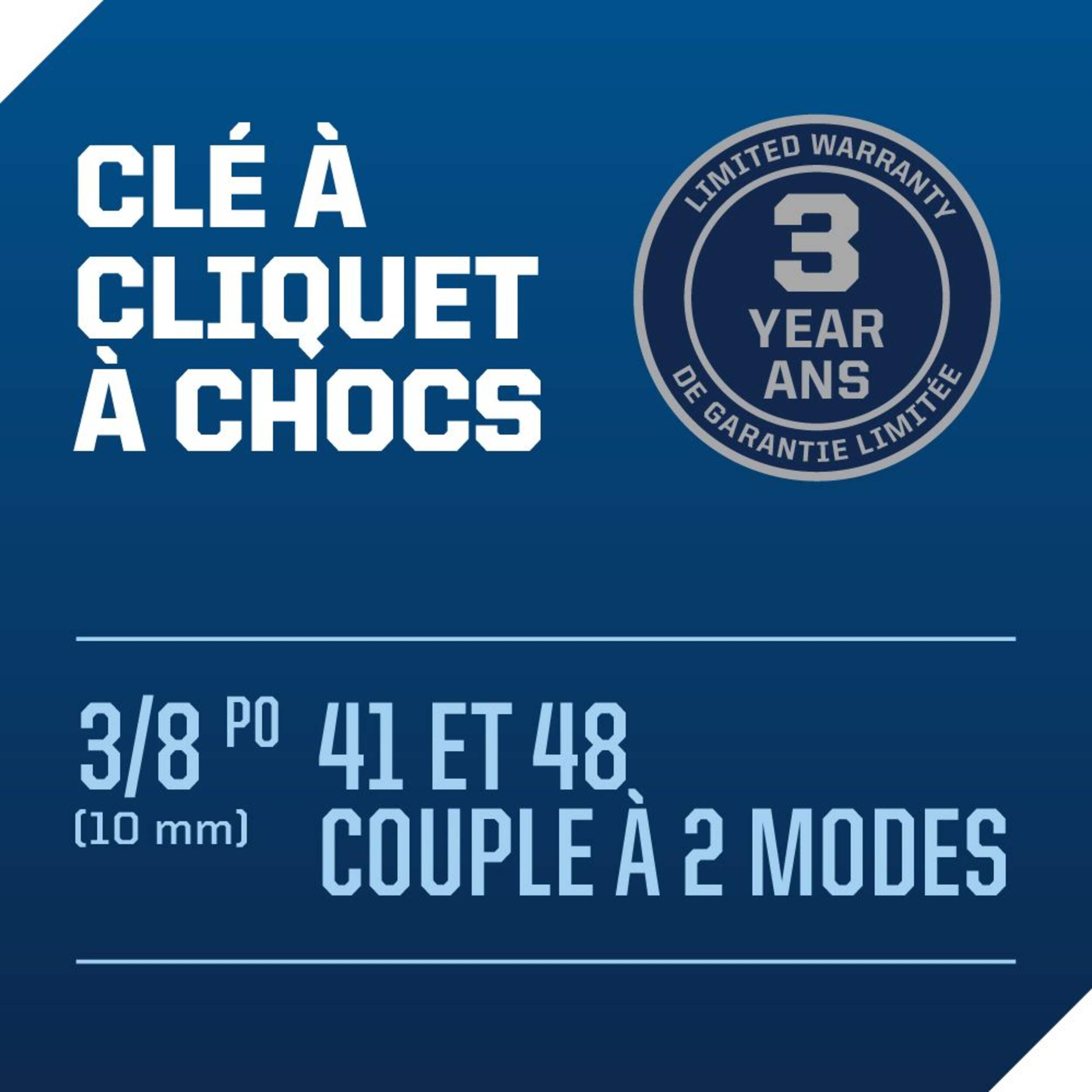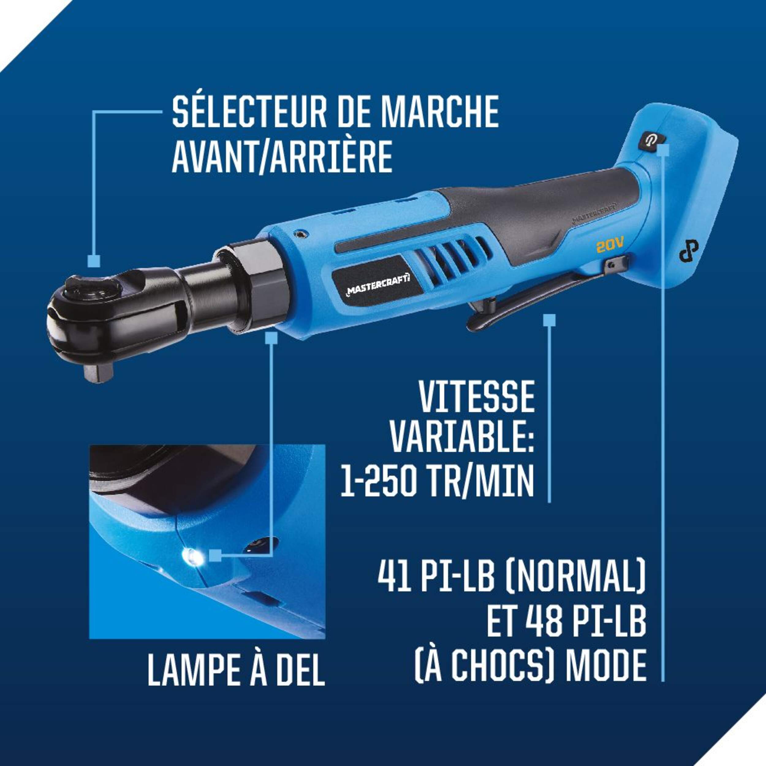 Clé à cliquet sans fil Mastercraft 20 V Max avec sélection de couple en mode normal (41 lb/pi) et en mode percussion (48 lb/pi)