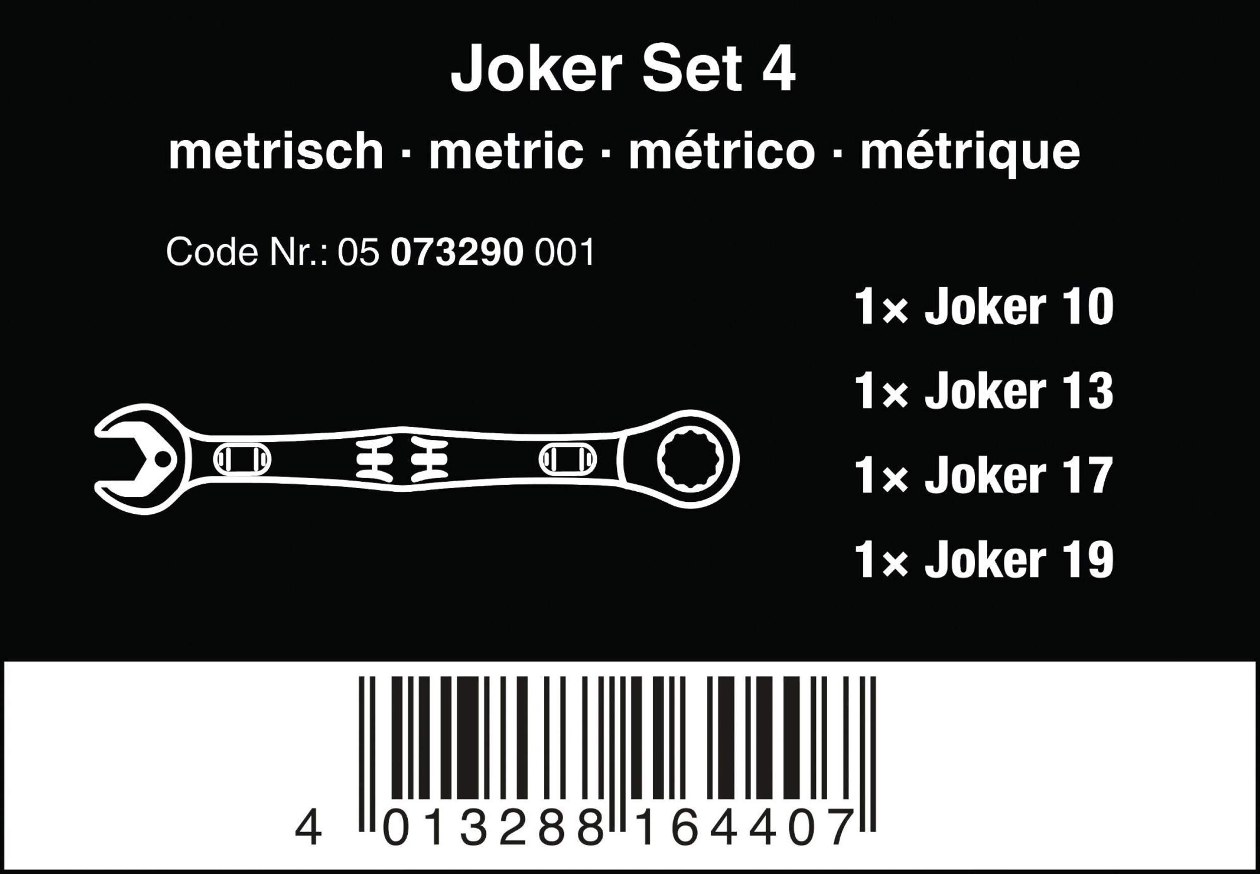 Jeu de clés à cliquet mixtes de haute qualité Wera : tout ce qu'une clé doit pouvoir faire. Et bien plus encore. Plus rapide, plus efficace, plus élégante. Oui, une vraei Joker. Nouvelle génération de clés à cliquet mixtes. Ensemble de 4 pièces de format impérial dans une pochette robuste. Convient aux têtes de boulon ou écrous hexagonaux. Comprend une fonction de retenue, grâce à la plaque métallique dans la mâchoire, qui réduit le risque de faire tomber les écrous et les boulons. Plaque métallique remplaçable dans la mâchoire qui fixe les écrous et les boulons avec ses dents très dures et qui limite le risque de glissement. Butée intégrée qui empêche tout glissement autour de la tête de boulon et permet d'appliquer un couple de serrage plus élevé. Géométrie à double hexagone qui assure un raccord positif avec les écrous ou les boulons et réduit le risque de glissement. Dotée d'un angle de retour de seulement 30° à l'extrémité ouverte qui empêche de perdre du temps à retourner la clé pendant les travaux de fixation. Fonction de cliquet à l'extrémité de l'anneau offrant un mécanisme à dents fines exceptionnel (80 dents en tout) qui offre de la flexibilité, même dans les espaces de travail très confinés. Géométrie spécialement forgée permettant un transfert de couple élevé et une résistance élevée. Fabriqué en acier au chrome molybdène haute performance avec un revêtement nickel-chromé pour une protection contre la corrosion élevée. Système de recherche d'outils Take It Easy avec code couleur selon la taille