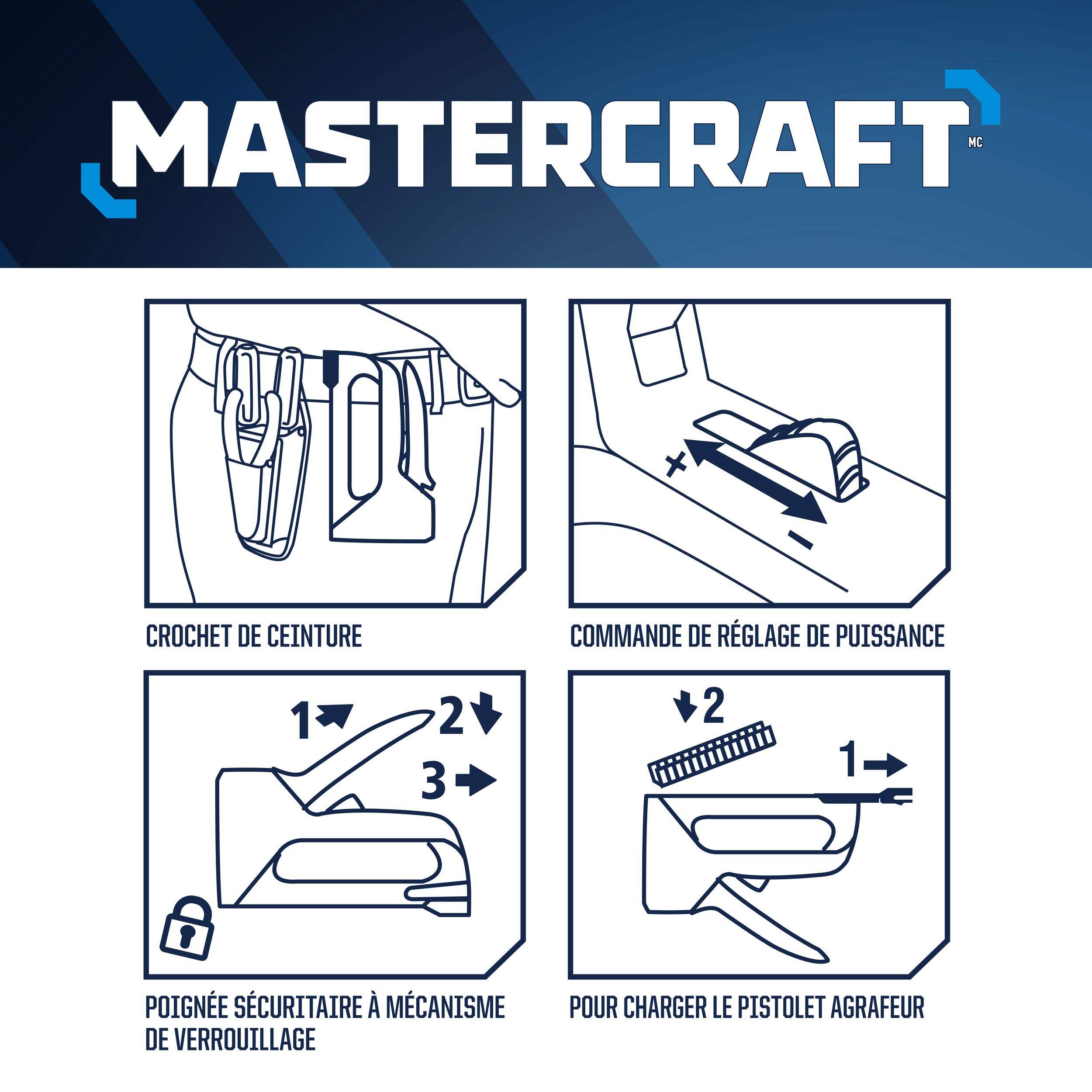L'agrafeuse 6-en-1 en métal moulé sous pression pour service intense Mastercraft permet d'enfoncer les agrafes plates, les crampons pour câble, les pointes de vitrier et les chevilles dans une surface. Cet ensemble comprend une agrafeuse, 500 agrafes plates, 100 crampons pour câble, 100 pointes de vitrier et 100 chevilles. La construction en alliage d'aluminium moulé sous pression confère une durabilité accrue à ce pistolet goujonneur, tandis que la poignée en plastique et en métal permet une prise confortable. La prise antidérapante maintient l'appareil bien en place, tandis que le verrou assure un fonctionnement sécuritaire du pistolet goujonneur sans fil. Cette agrafeuse robuste est dotée d'un interrupteur de réglage de l'alimentation pour contrôler la profondeur de l'entraînement. Les utilisations idéales comprennent l'ameublement, la fixation des cadres, des moulures, des perles et la fixation des câbles ou des fils. Cet outil est couvert par une garantie limitée de 3 ans.
