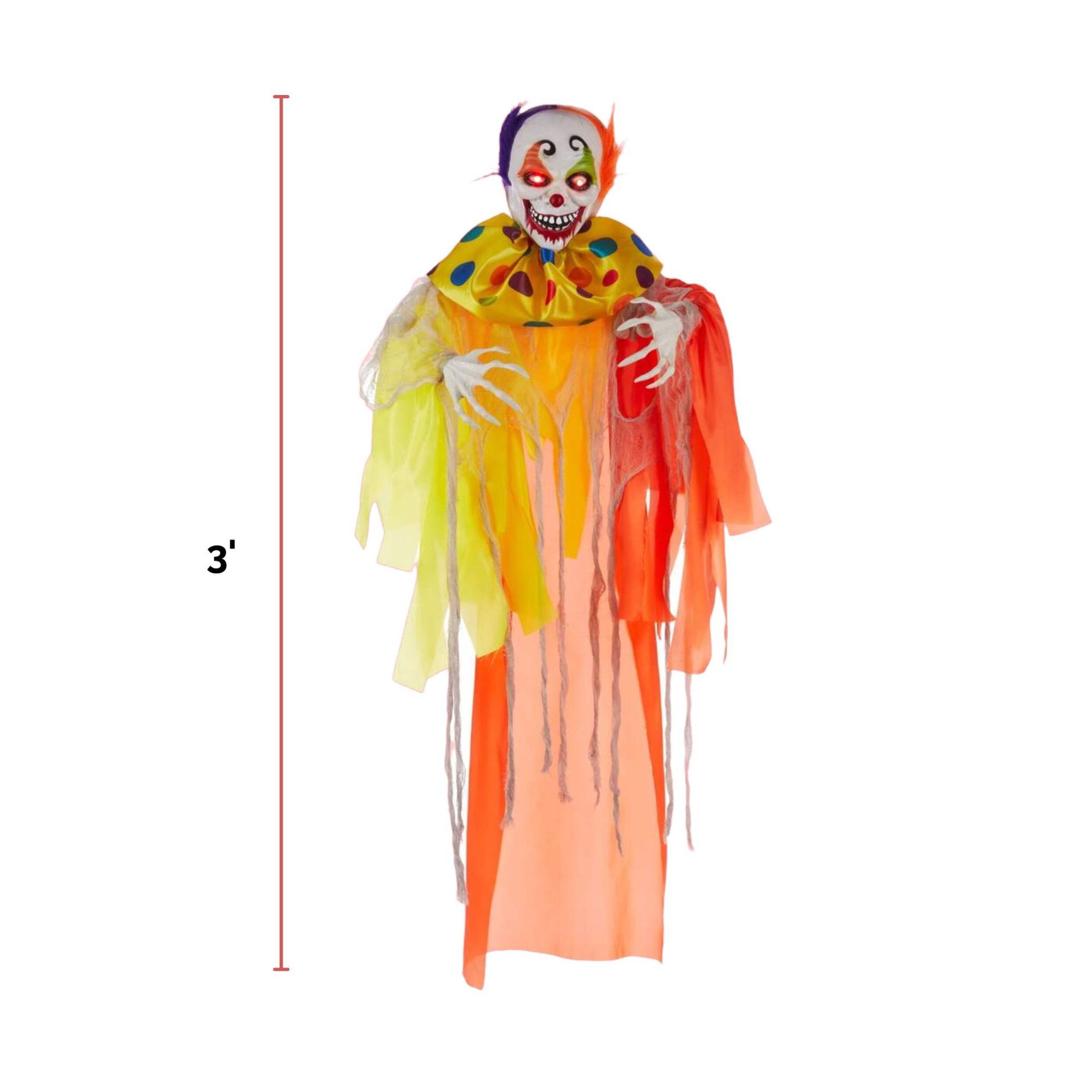 Vous ne trouverez rien de drôle à ce clown lumineux à suspendre For Living. Conçue pour effrayer vos invités et vos visiteurs, cette décoration d’Halloween est dotée d’un capteur sonore qui fait briller le clown avec deux lumières à DEL rouges effrayantes à travers ses yeux. Le maquillage et la garde-robe colorés du clown d’Halloween suspendus se démarqueront certainement parmi vos autres décorations saisonnières pour un look amusant et effrayant. Le clown nécessite 2 piles AAA pour fonctionner, qui sont comprises.