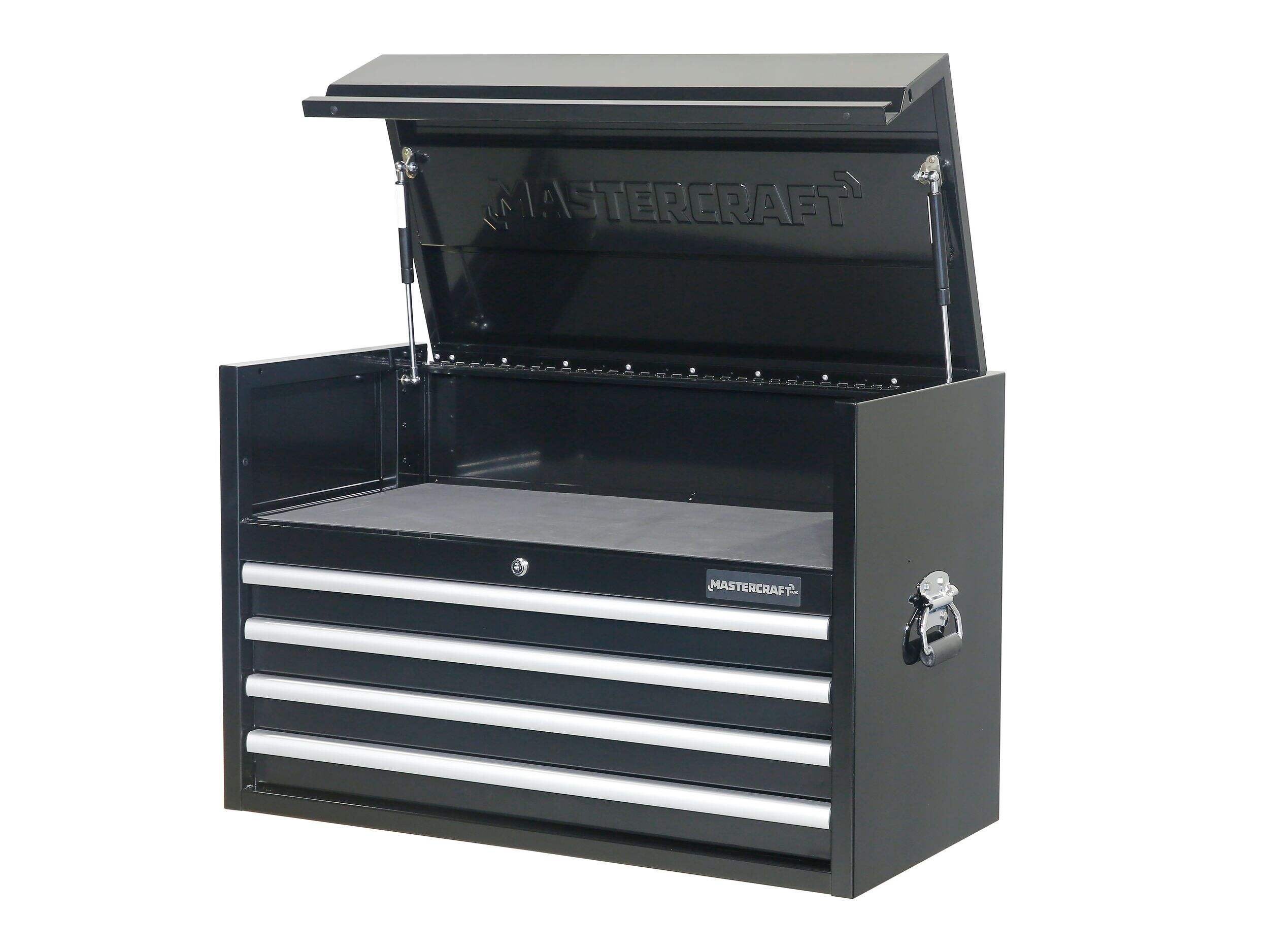 Organisez vos outils efficacement avec le coffre à outils en acier peint par poudrage Mastercraft. Ce coffre robuste est doté d'un dessus profond pour un rangement pratique des outils et des accessoires, tandis que les cylindres à gaz et la poignée intégrée offrent un accès facile. Offert en noir, rouge et bleu, il s'agence parfaitement avec l'armoire à outils Mastercraft noire de 36 po pour une solution de rangement complète.